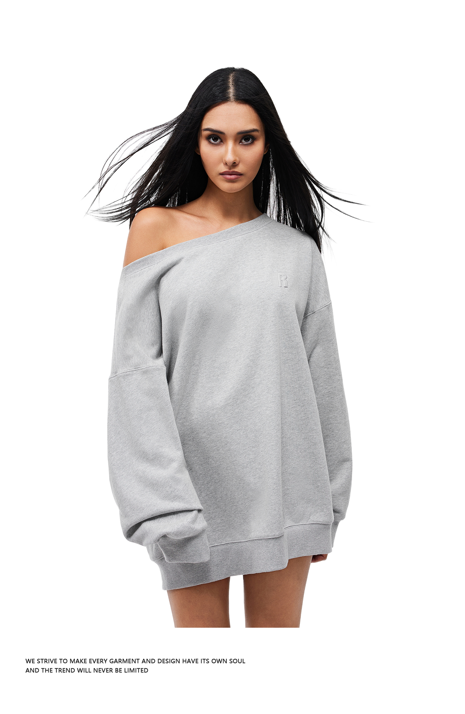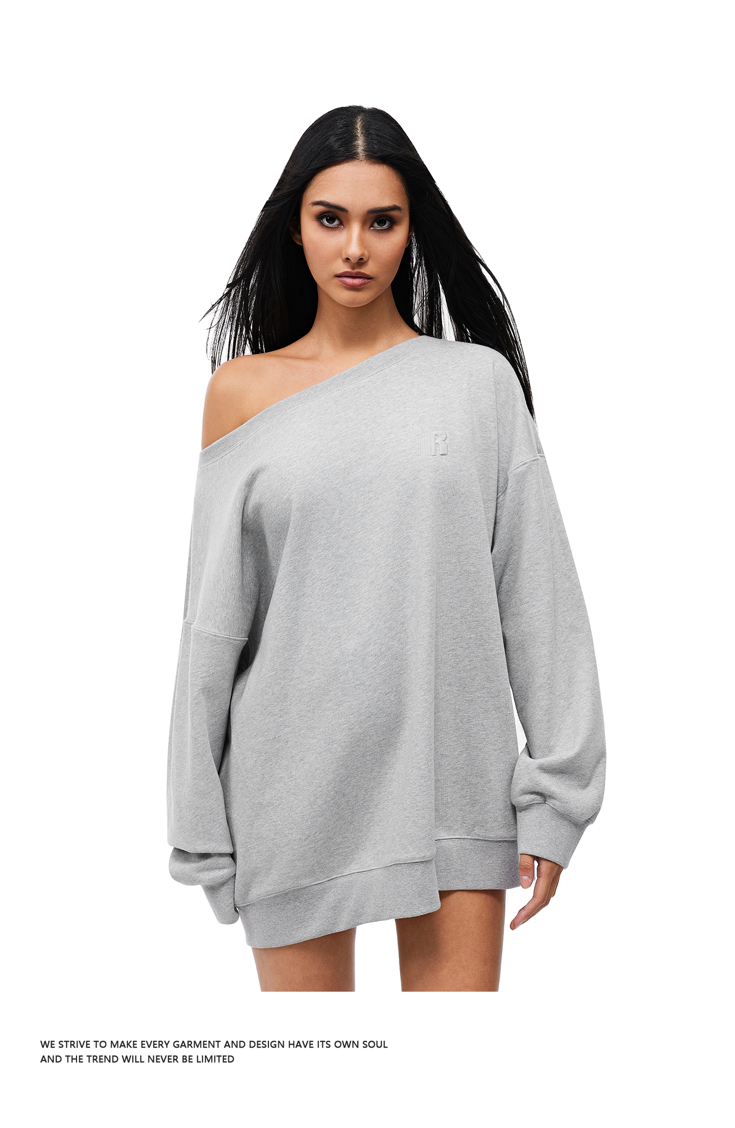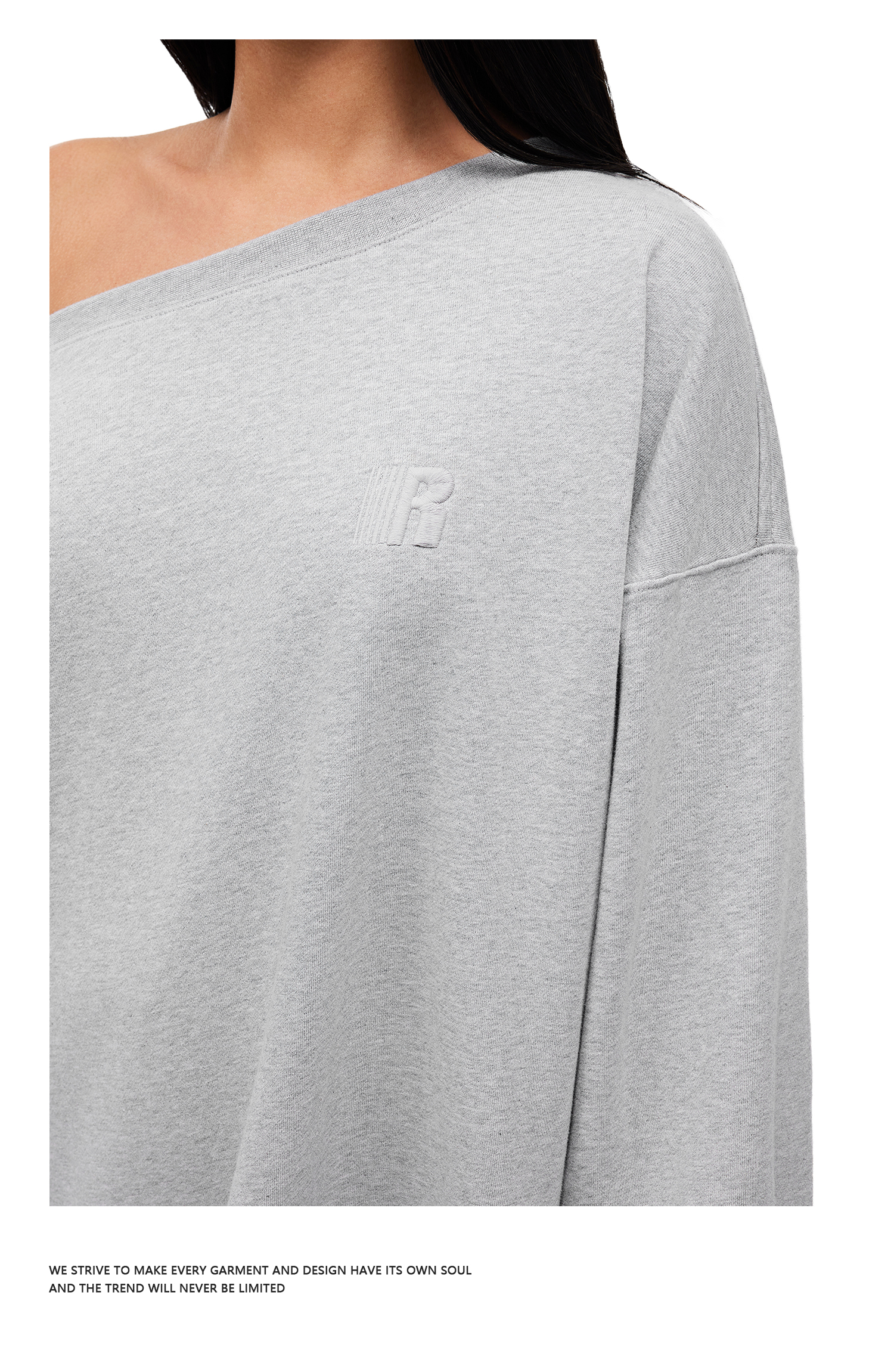 FDR官方店 美式R字刺绣斜肩卫衣女秋季重磅辣妹运动套头露肩上衣
