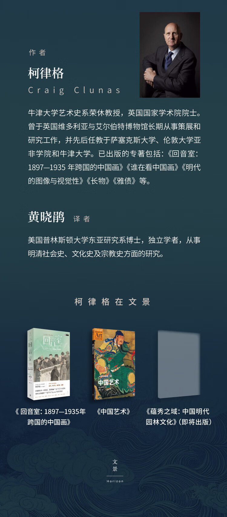 牛津大学艺术史系荣休教授,英国国家学术院院士。曾于英国维多利亚与艾尔伯特博物馆长期从事策展和研究工作,并先后任教于萨塞克斯大学、伦敦大学亚非学院和牛津大学。其研究和出版活动主要围绕明代中国,同时也涵盖20世纪及当代艺术。已出版的专著包括:《回音室:1897—1935年跨国的中国画》《长物:早期现代中国的物质文化与社会状况》《蕴秀之域:中国明代园林文化》《明代的图像与视觉性》《雅债:文徵明的社交性艺术》等。