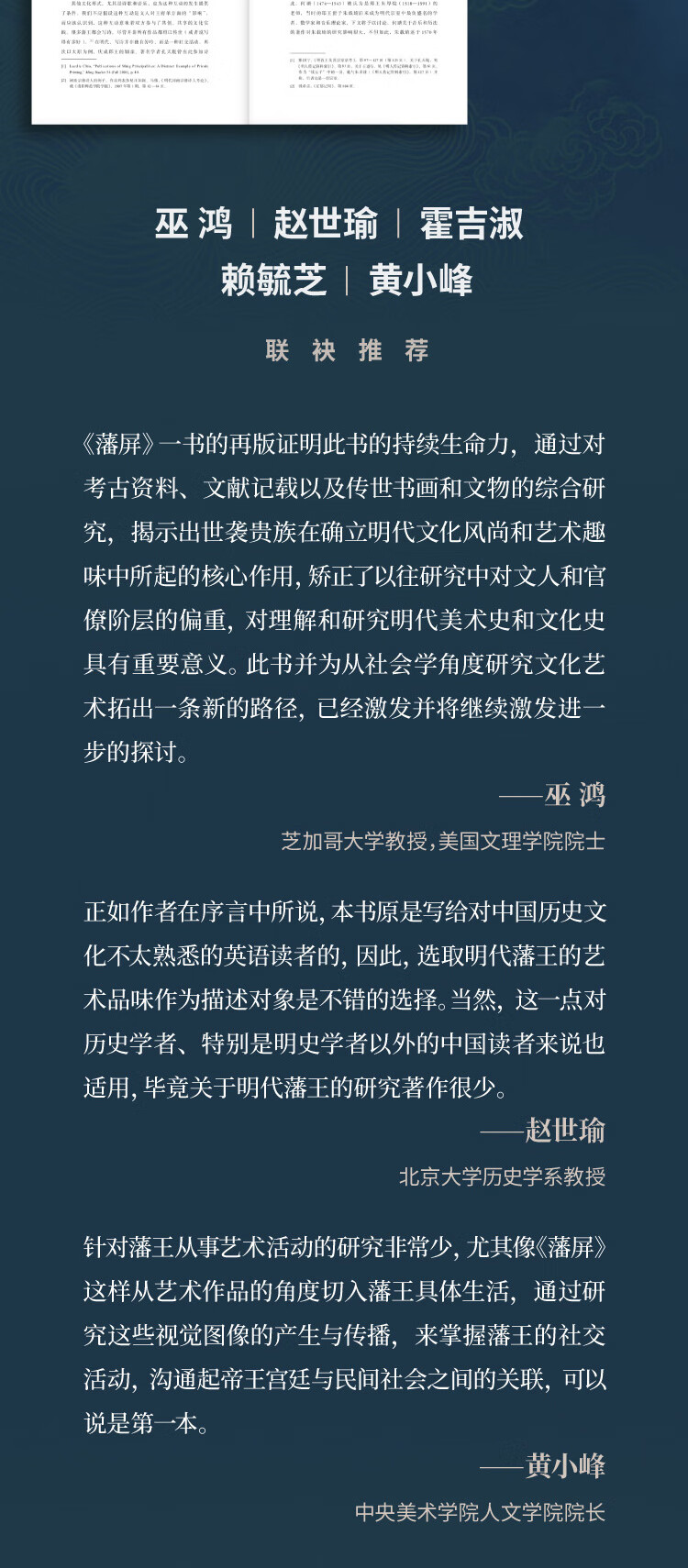 我的第一本书出版于1984年。在超过40年的写作生涯中,我作为作者的一个习惯是不去回顾已经写下的东西,在完成一个题目后头也不回地转向下一个。因此,让我回顾你正在阅读的这本书的写作过程,并再次思考其中提出的关于明代艺术与文化的课题,对我而言是个有点令人畏惧的任务。明代是我作为学者关注的焦点,但不是唯一的焦点。然而我并不畏惧,反而十分高兴能有机会对本书的出版方、编辑与译者表达诚挚的感谢。他们看到了再版《藩屏》的价值,并且十分温和且高效地修正了我的一些错误,令此书能够以更好的面貌呈现在中国读者面前。我非常感谢他们。