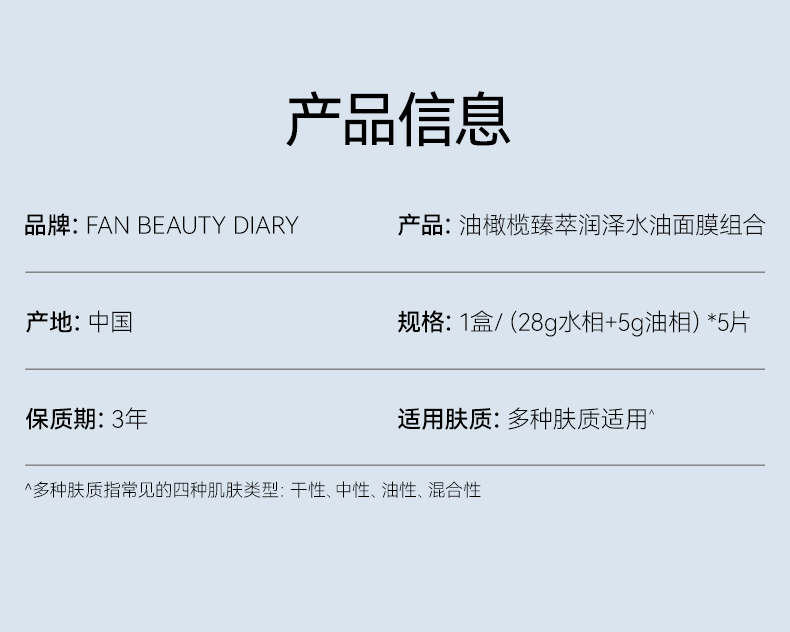 FAN BEAUTY DIARY 油橄榄臻萃润泽水油面膜组合5片/盒(全英文标)