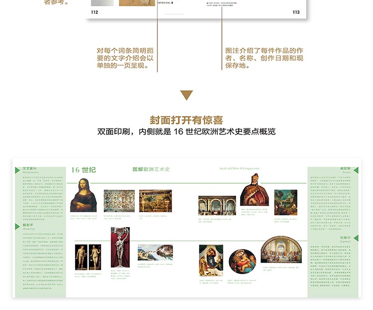 ★封面打开有惊喜,双面印刷,封面反过来就是特制的16世纪艺术史要点概览图,全套集齐对照观看,便是14-20世纪欧洲艺术史要点概览。