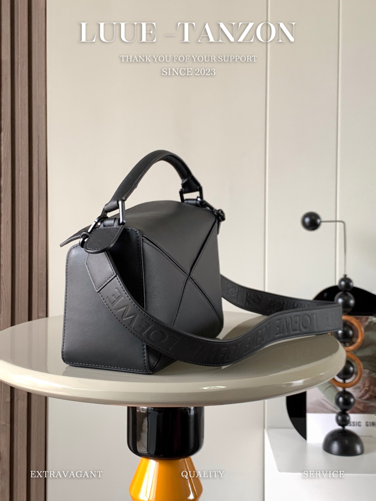 几何包迷你18CM宽肩带压花Puzzle手袋原厂进口小牛皮平纹 罗家爆款几何包Puzzle 手袋是创意总监乔纳森·安德森为 L0EWE 推出的首款手提包长方体形状和精确的切割技术创造了 Puzzle 独特的几何线条这个迷你尺寸版本采用柔软粒面牛皮革制成不一样的粗肩带,印有 L0EWE 字样的肩带,金属扣位置采用了与包包同一色系让包包更加时尚,整体依然保持包包很轻的重量十分耐用,轻便,能装很多东西,适合上班,旅游