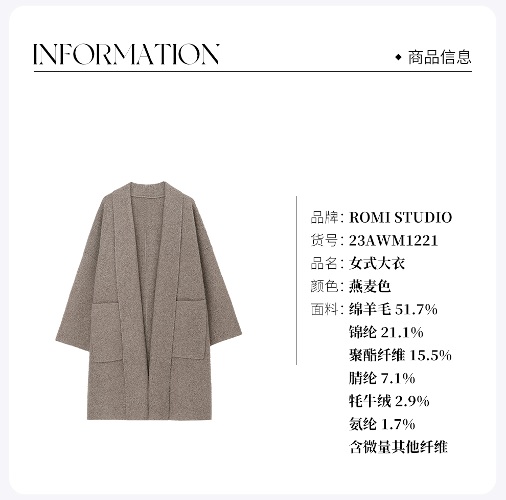 ROMI STUDIO“贵妇老钱”80%羊毛宽松中长款燕麦针织开衫 23AWM1221