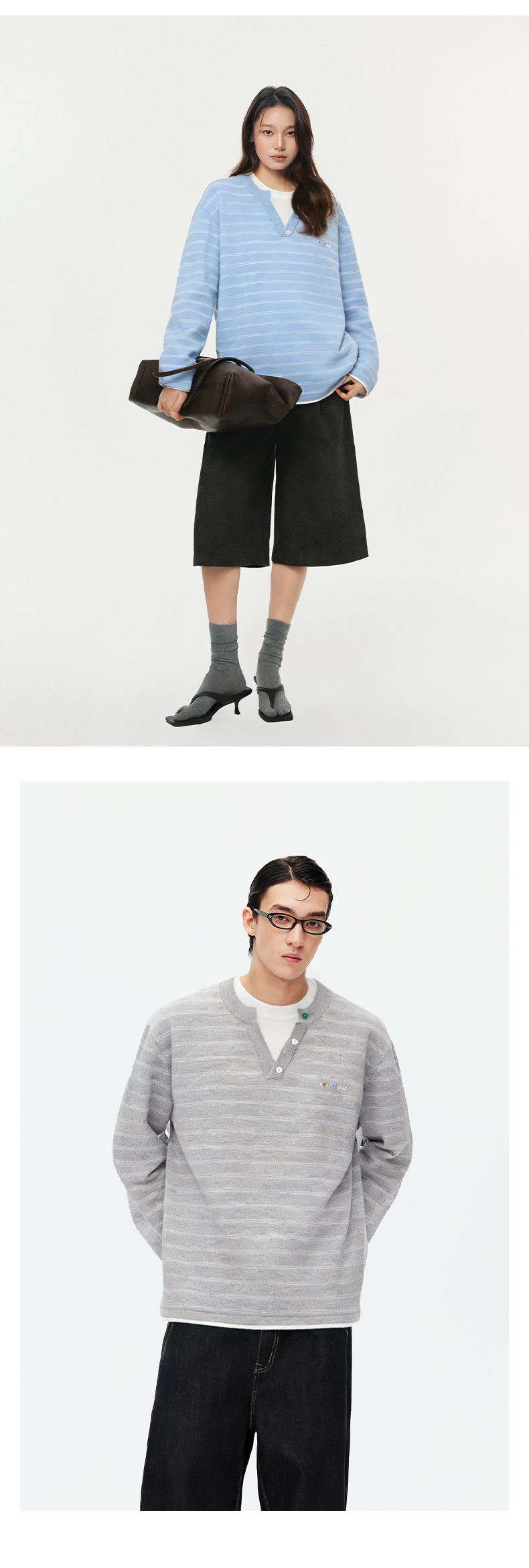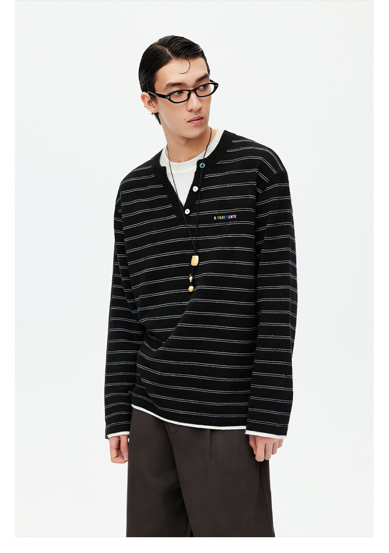 NPC潮牌撞色假二件针织毛衣12针细针窄条纹亨利领长袖NP61SW07