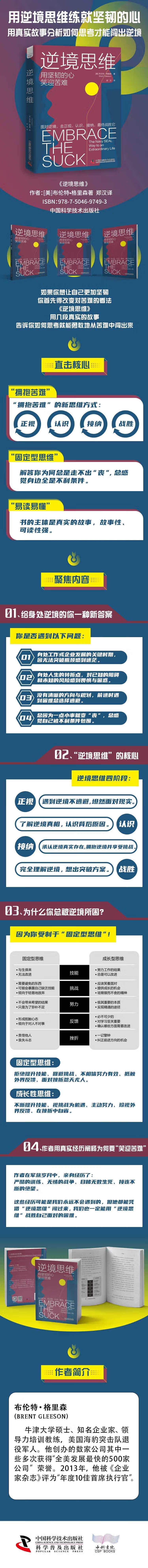 推荐理由1:详细讲解逆境思维的核心四阶段:正视:遇到逆境不逃避,坦然面对现实;认识:了解逆境真相,认识背后原因;接纳:承认逆境真实存在,拥抱逆境并享受挑战;战胜:完全理解逆境,想出突破方案。 推荐理由2:为什么你总被逆境所困?因为你受制于“固定型思维”!解析不能战胜逆境的原因,培养成长型思维。 推荐理由3:作者用真实经历阐释为何要“笑迎苦难”。作者在军旅岁月中,亲身经历了严酷的训练、无情的战争、目睹无数生死、接连不断的绝望,他都能凭借“逆境思维”闯过来,我们也一定能用“逆境思维”战胜自己面对的困难。