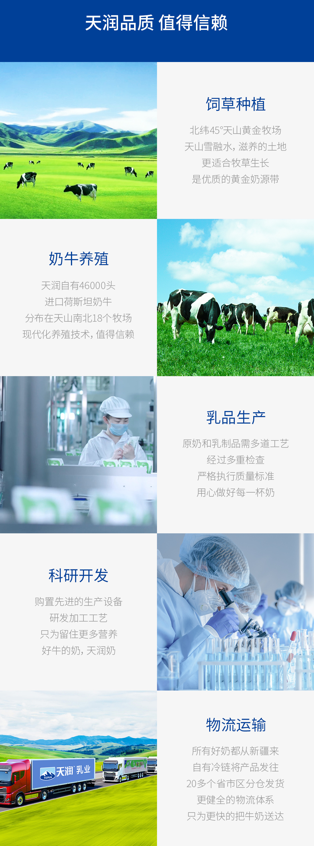 天润乳业作为新疆生产建设兵团第十二师控股的上市公司,2002年成立、2013年上市,是中国奶业20强、农业产业化国家重点龙头企业,更是新疆液态奶产销量最大的企业。公司搭建起“牧业养殖-乳业加工-市场销售”完整全产业链,拥有46000头进口荷斯坦奶牛、天山南北18个牧场,从牧草种植到乳品生产,从科研开发到冷链物流,每一环都严格把控,产品出厂合格率及市场抽检合格率均达100%,用硬核实力守护每一滴奶的品质。