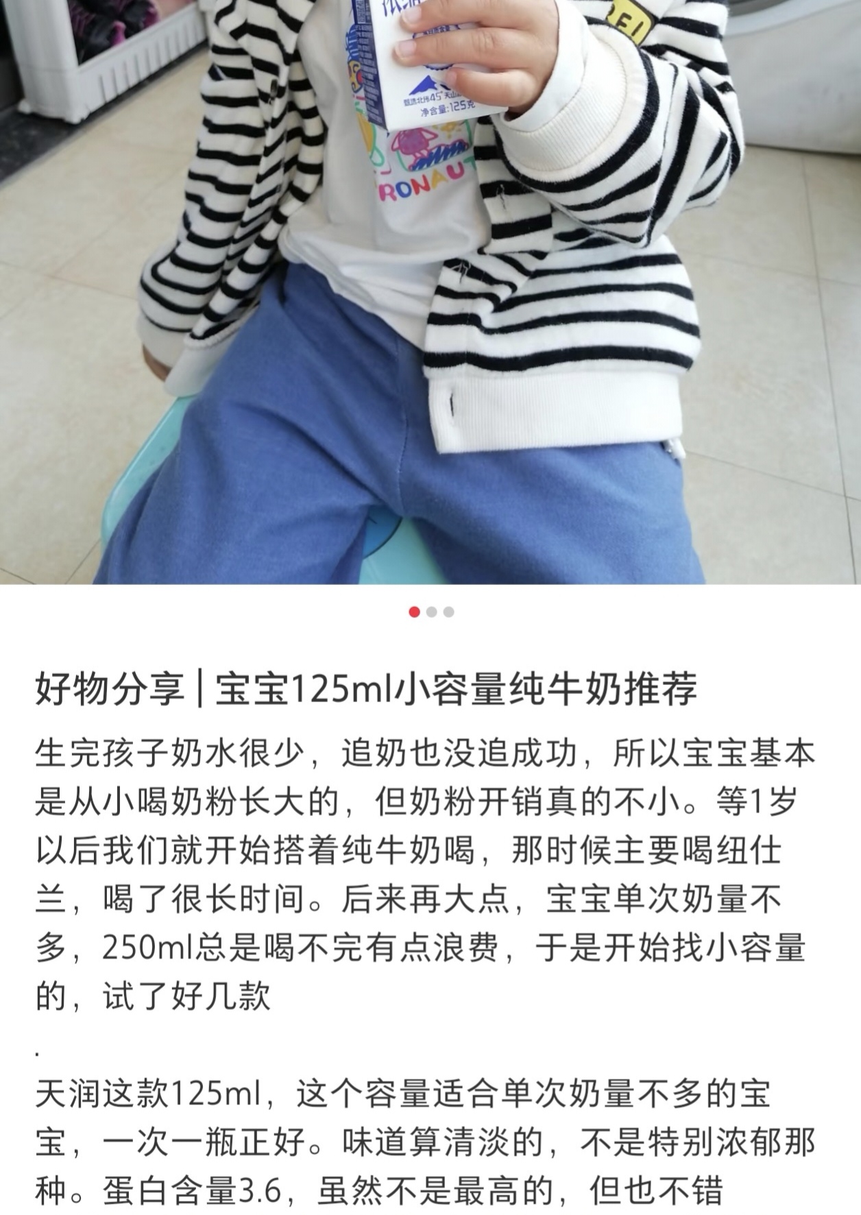 最贴心的莫过于125g的迷你容量!家里小朋友胃口小,大盒牛奶总喝不完,容易浪费,小盒装的量就刚刚好,宝宝一次喝完不剩余,而且小巧便携,出门放包里、塞口袋都很方便,外出加餐也是超省心。