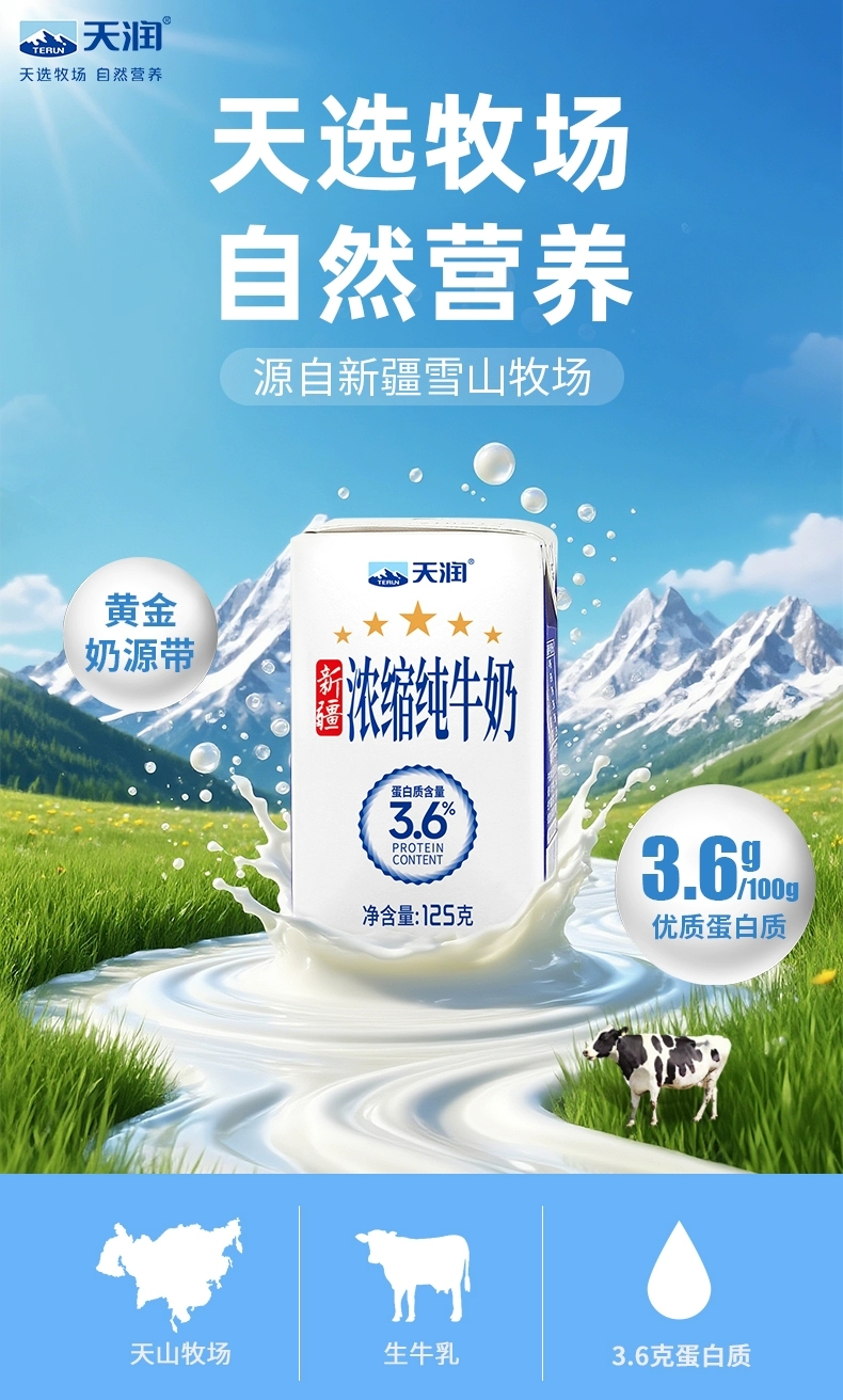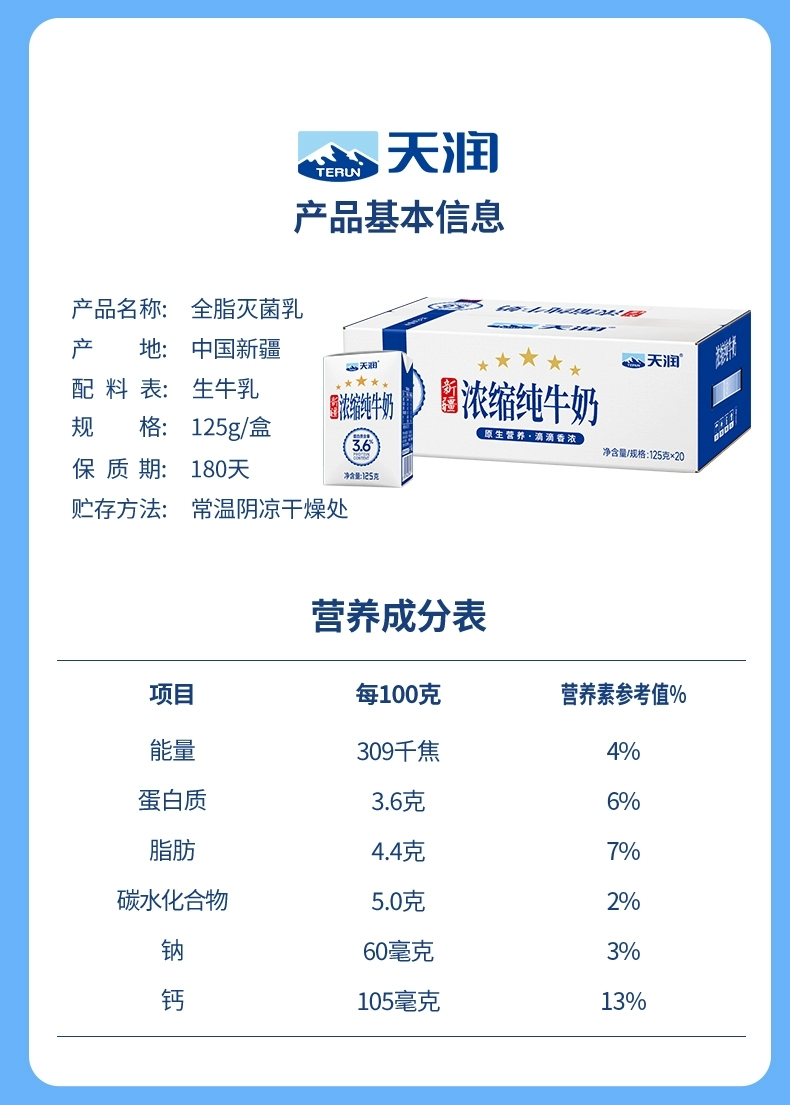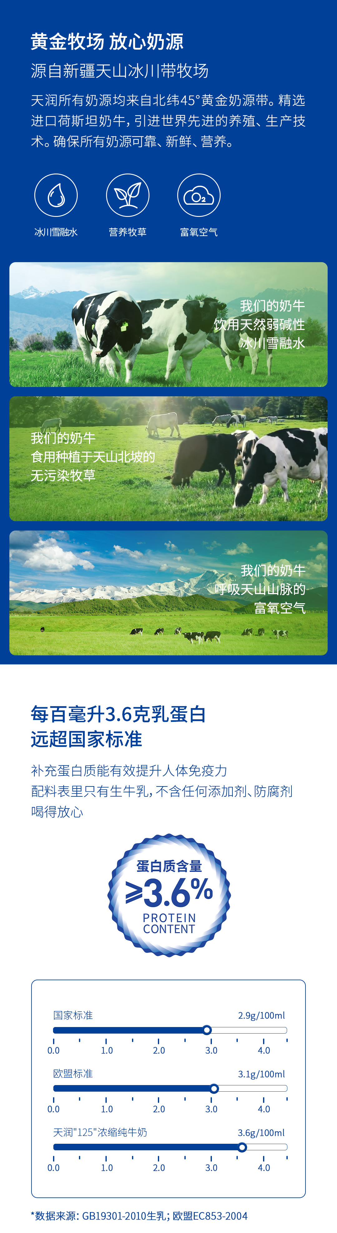 天润mini浓缩纯牛奶,奶源甄选北纬45°天山冰川黄金奶源带,奶牛喝着天然弱碱性冰川雪融水、吃着无污染牧草、呼吸天山富氧空气,从源头造就浓郁奶香。配料表只有生牛乳,无任何添加剂防腐剂,喝得安心又放心!每100ml含3.6g乳蛋白,远超2.9g/100ml的国家标准和3.1g/100ml的欧盟标准,搭配105mg钙、4.4g优质脂肪,补充蛋白质,强骨健魄,为身体充能,超给力哦!