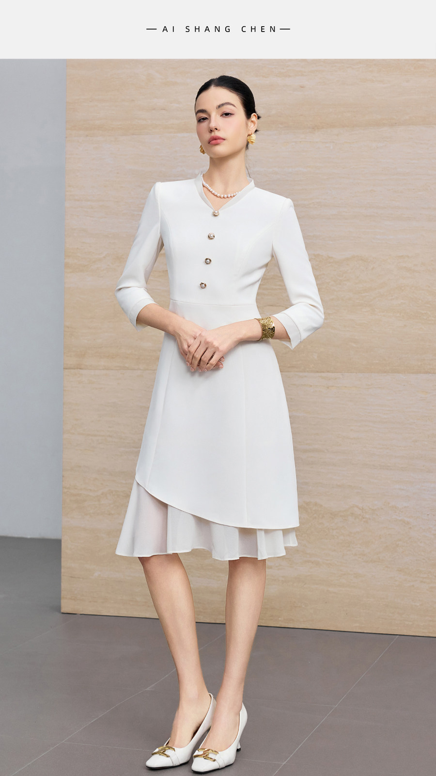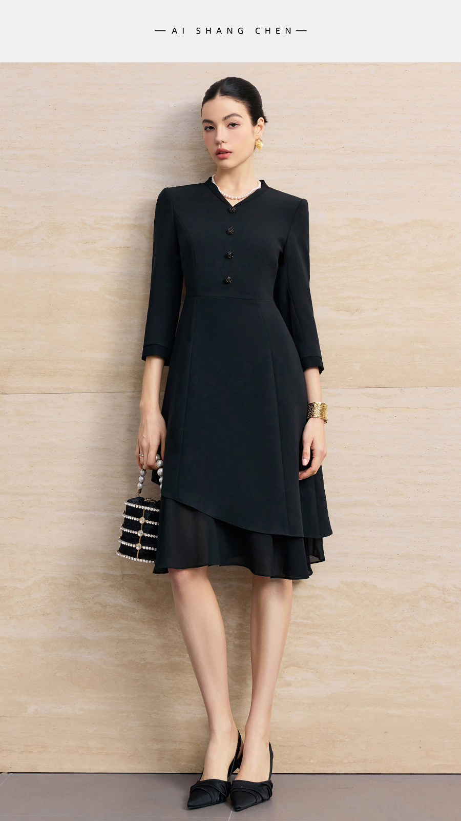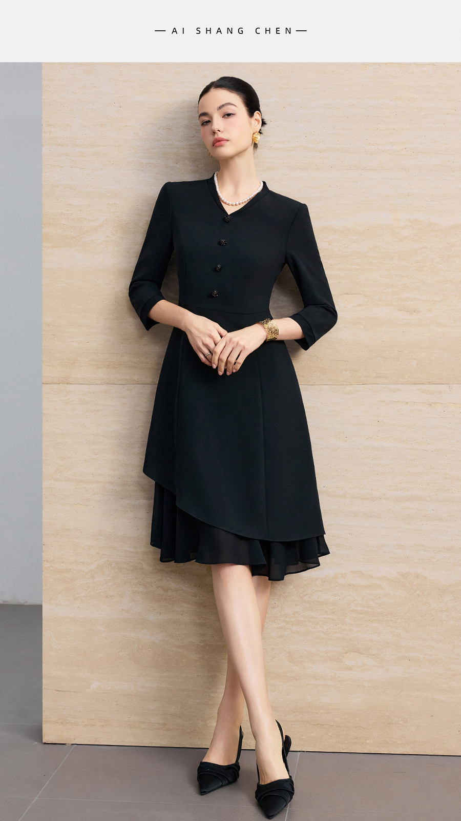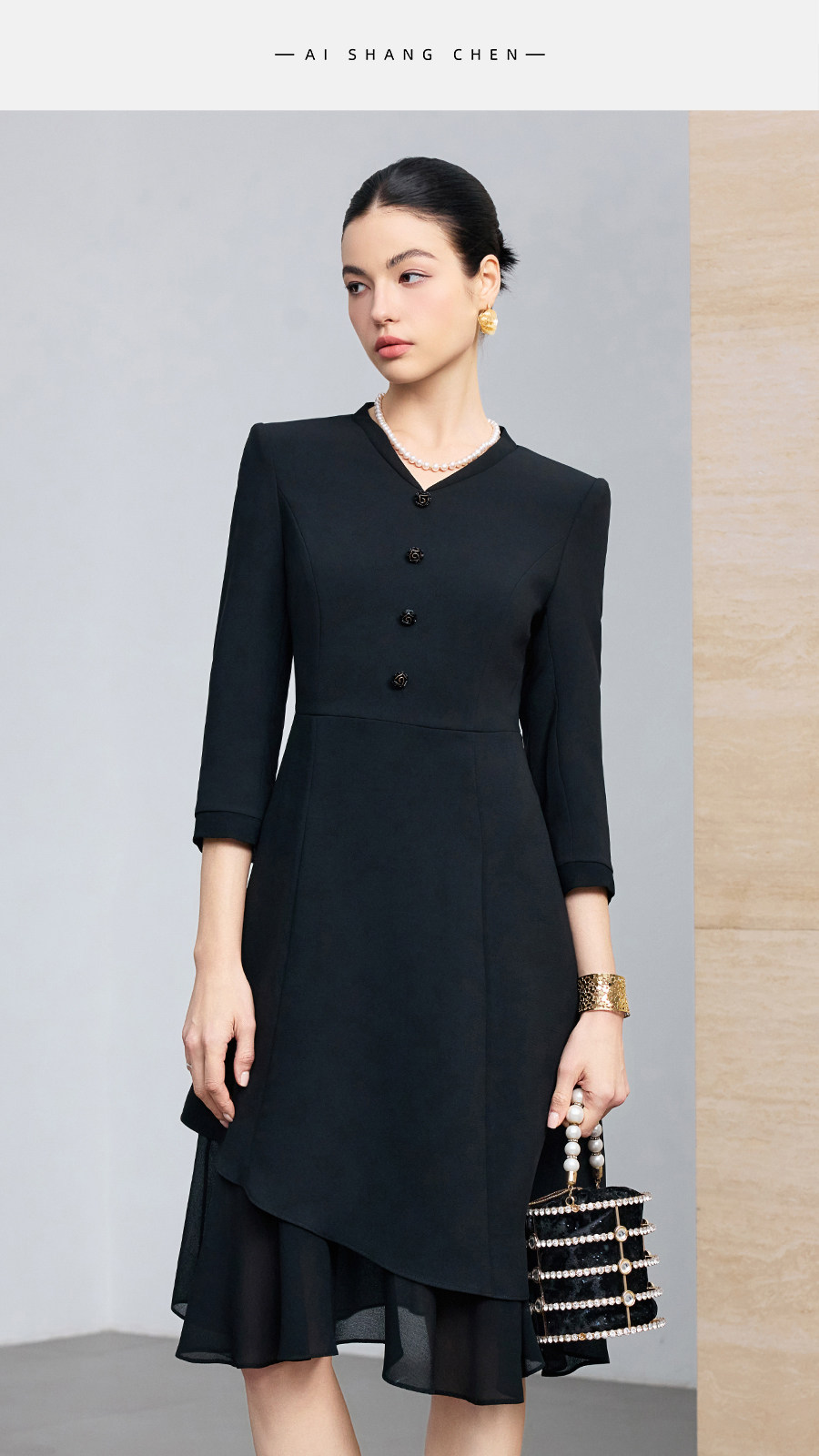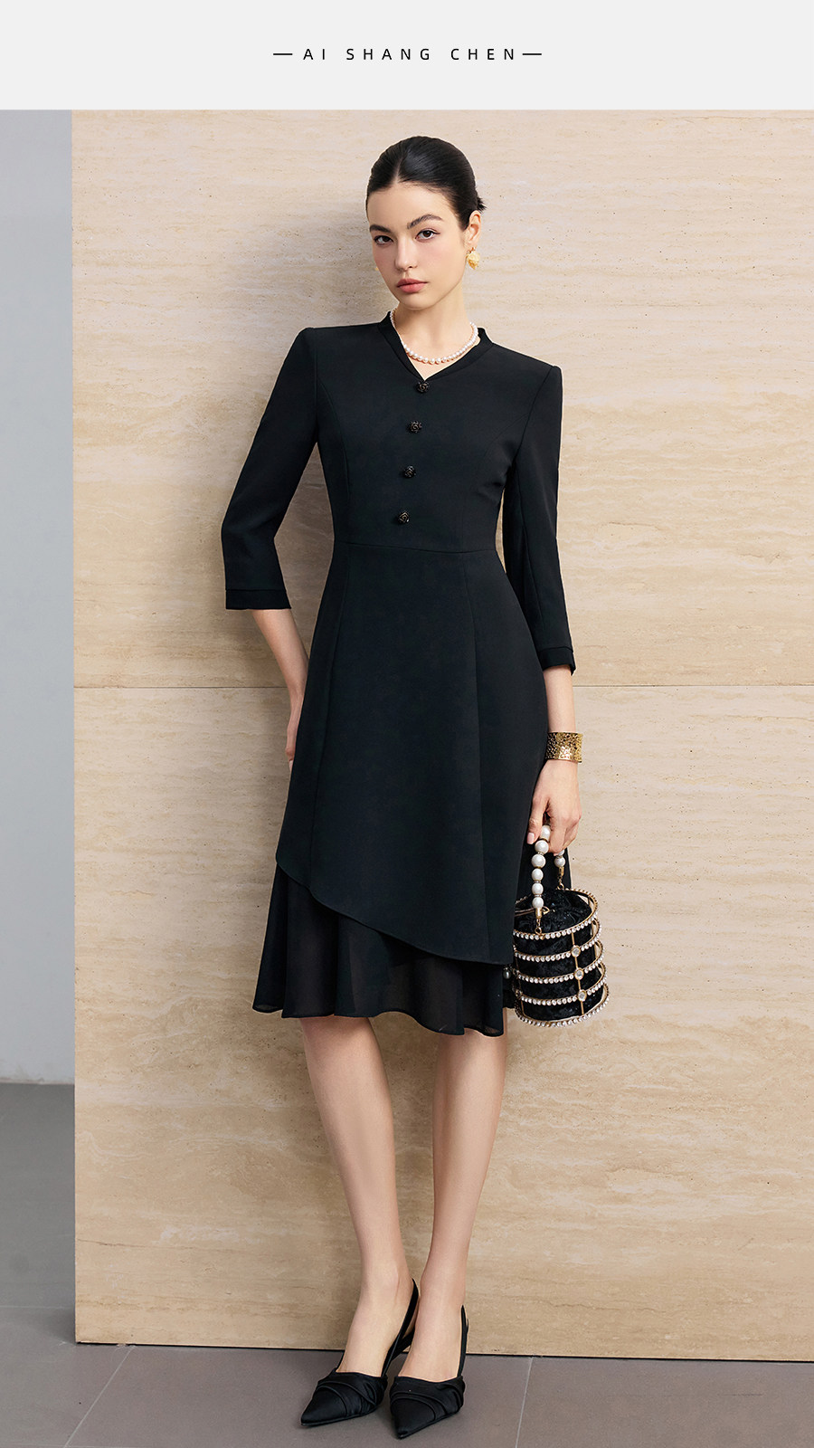 艾尚臣聚会小黑裙V领连衣裙女七分袖收腰显瘦通勤职业裙装鱼尾裙