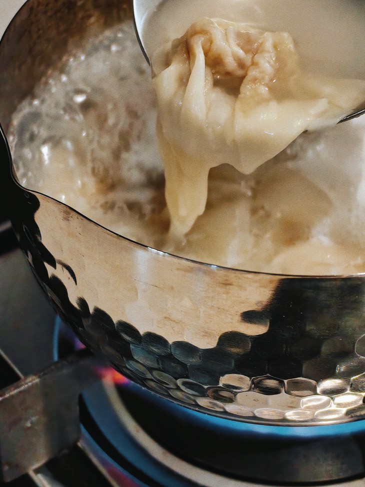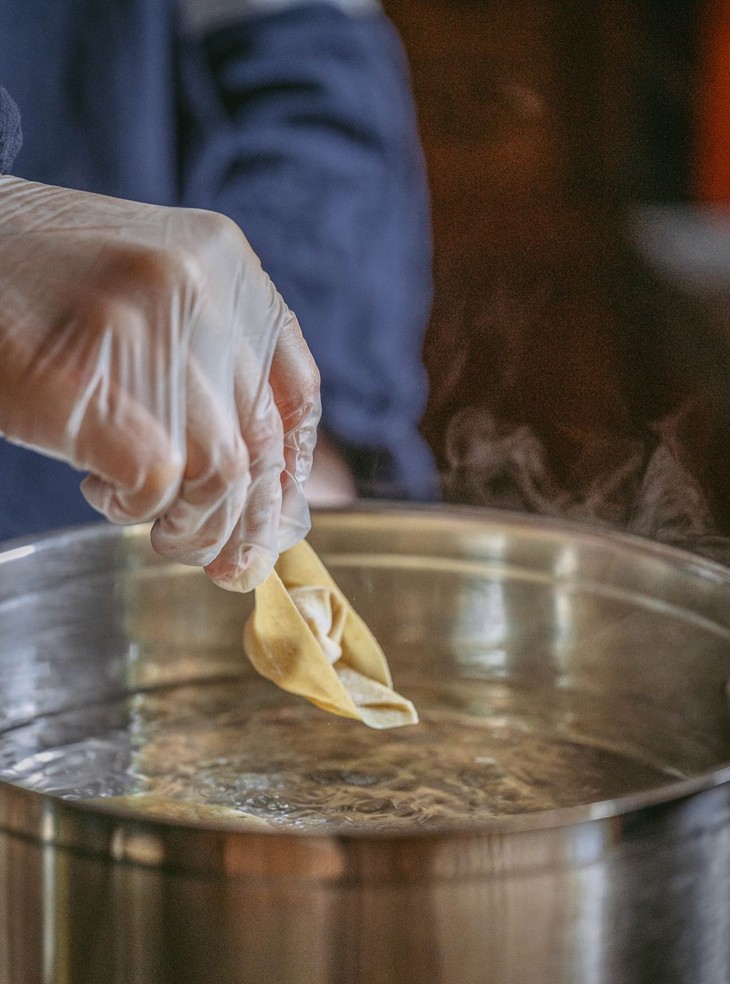 鸭蛋皮抄手,从面皮到馅料,每一步都藏着老手艺的较真。面皮只用当季新产的昌州麻鸭蛋,尤其春秋季最是肥美,蛋黄脂香醇厚,蛋清胶质饱满。老师傅们照着老规矩收蛋,只挑蛋壳青如冷釉、蛋液稠若琥珀、蛋黄金似熔岩的三绝好蛋。和面皮不用一滴水,十二枚蛋配三斤面,多一滴则黏腻,少一丝则僵硬——纯鸭蛋液与筋道麦香充分揉合,擀出的面皮薄可透光,却韧劲儿十足,沸煮许久也不破不散。馅料更是不含糊,只选凌晨现宰的鲜后腿肉,冻肉一概不用。三斤鲜肉配八枚土鸡蛋,只加少许淡盐,再用蛋清裹着肉糜顺时针搅打千百转,直到肉馅凝成云絮般的嫩白。全程不放料酒,全靠蛋清锁鲜、姜汁祛腥,吃的就是肉本身的鲜醇。更难得的是,留海棠至今坚持手工制作。面团的湿度、揉面的力度、醒面的温度,全凭老师傅几十年的经验把控,这才造就了抄手久煮不烂、急冻后口感依旧如新的神奇。
