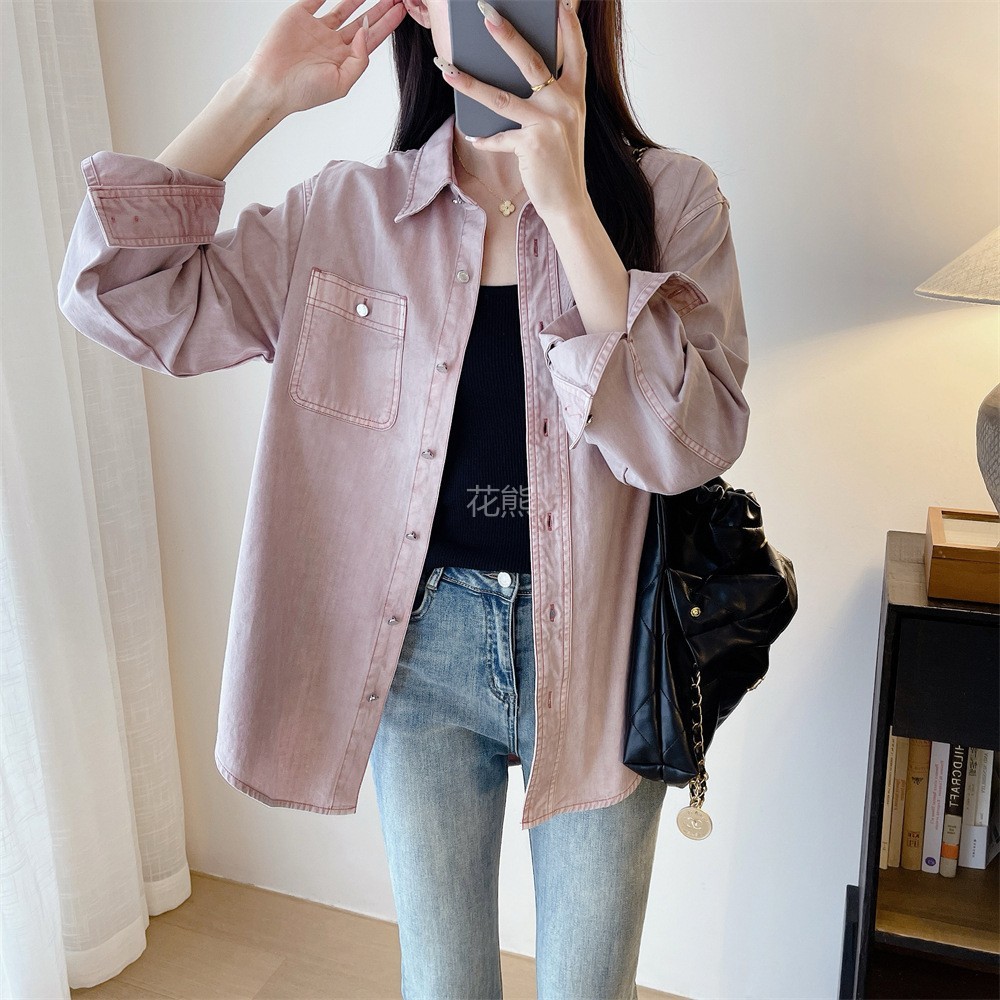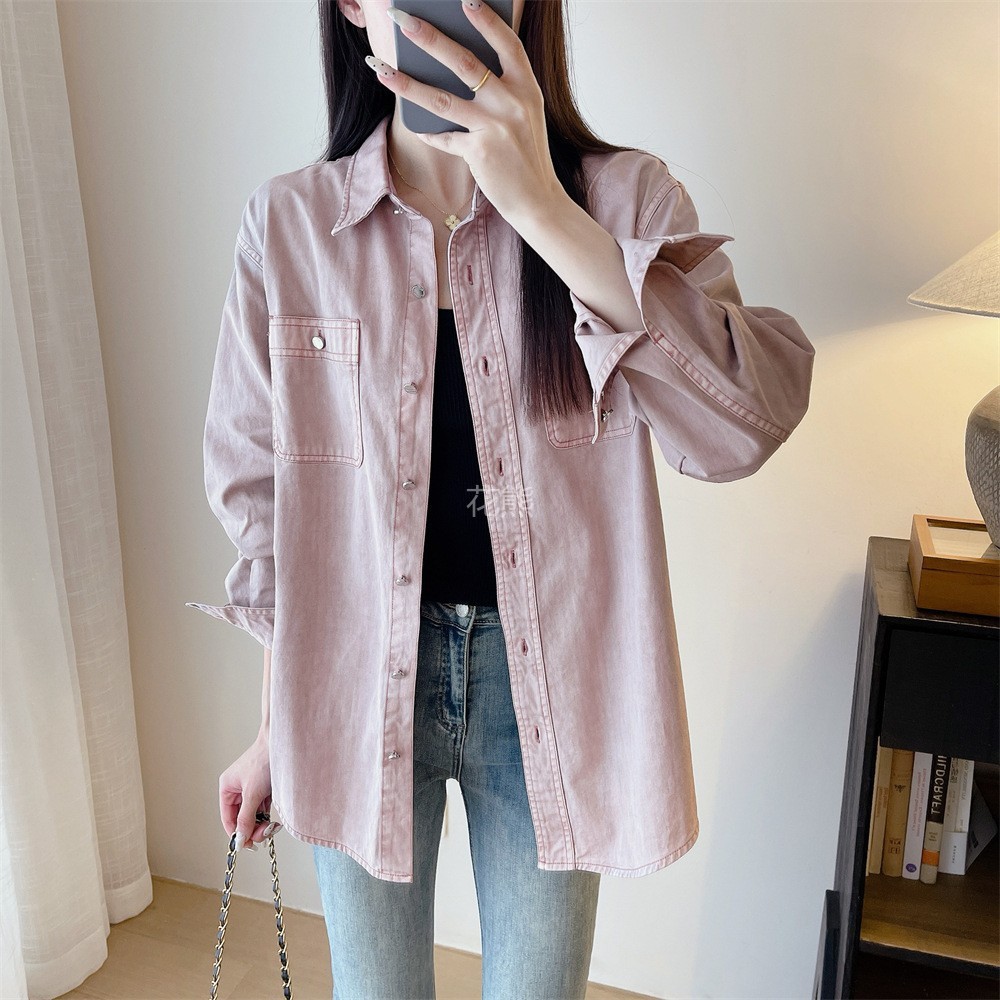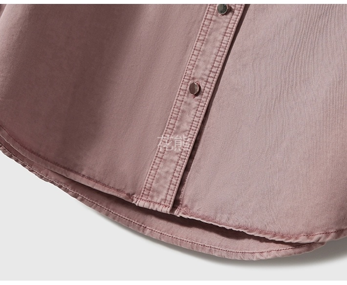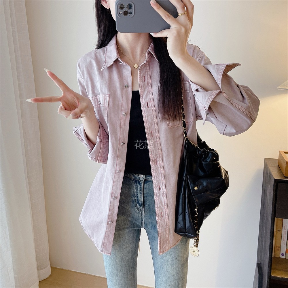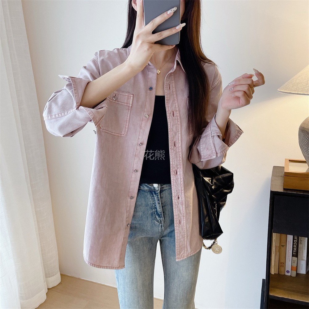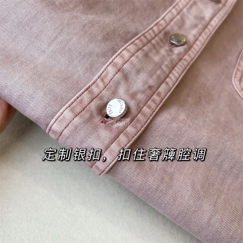 【早春翻糖粉牛仔外套】 设计师款,纯棉的牛仔衬衫也可作为外套两穿 竹节肌理感纯棉面料,上身有筋骨感,