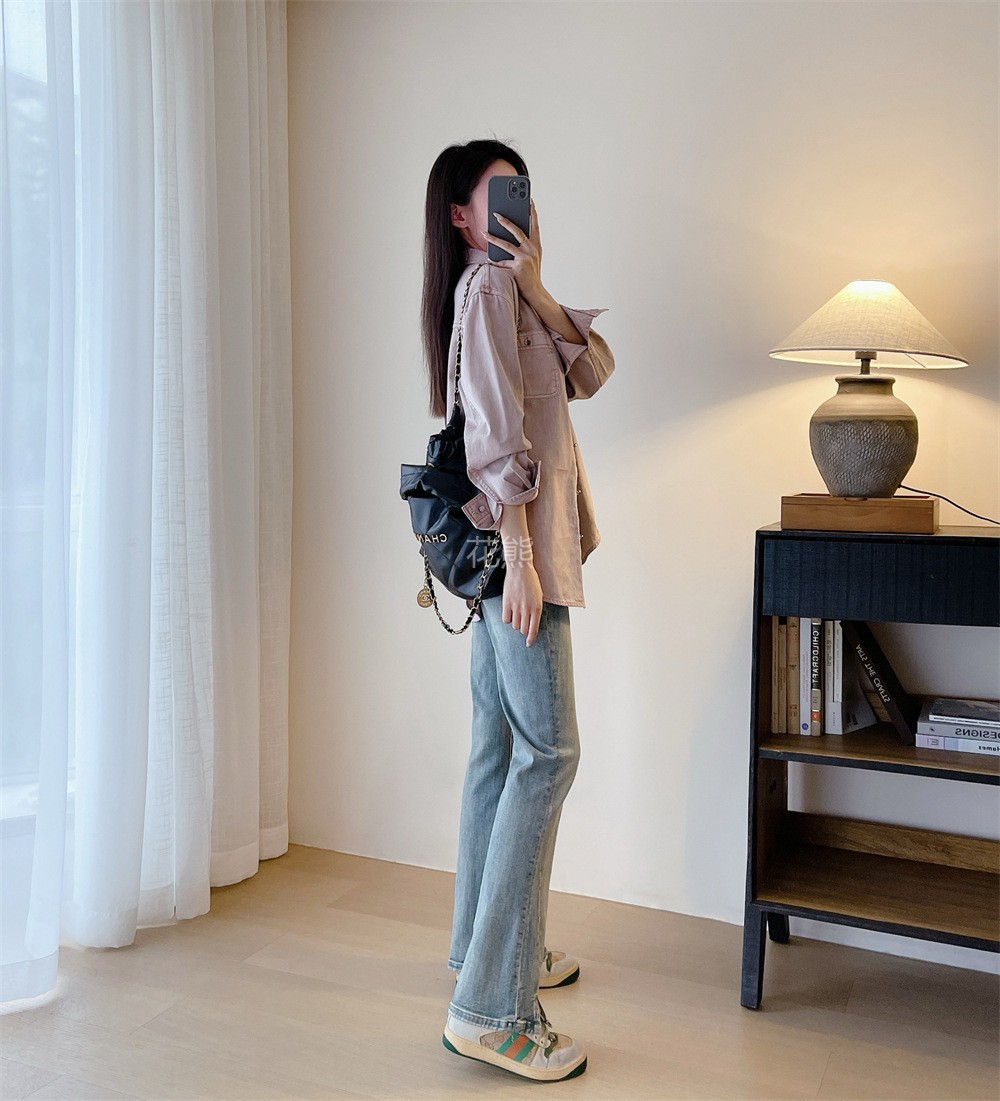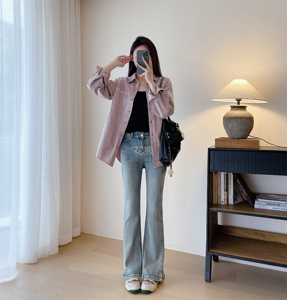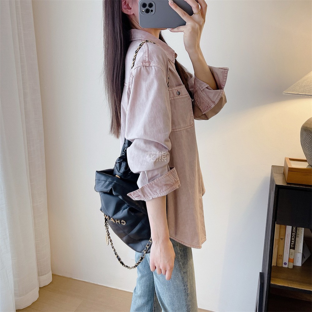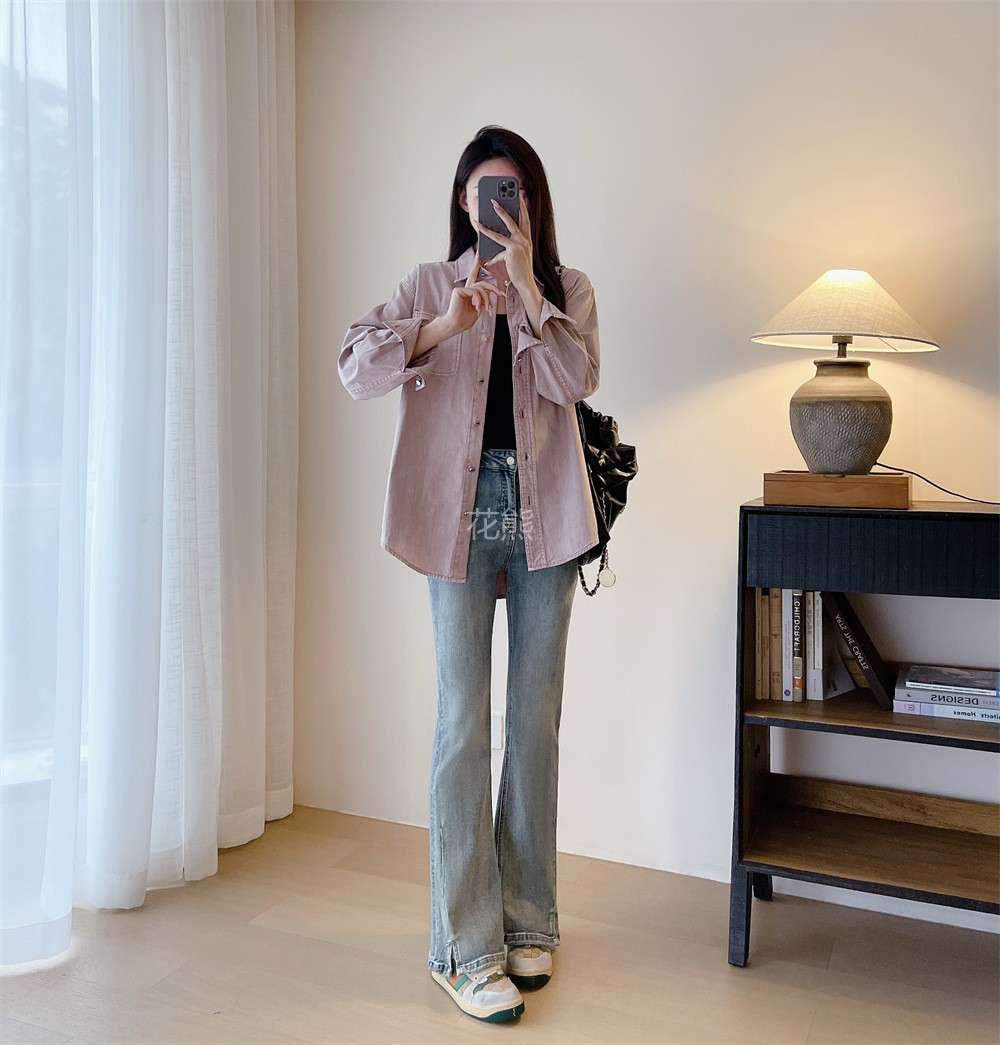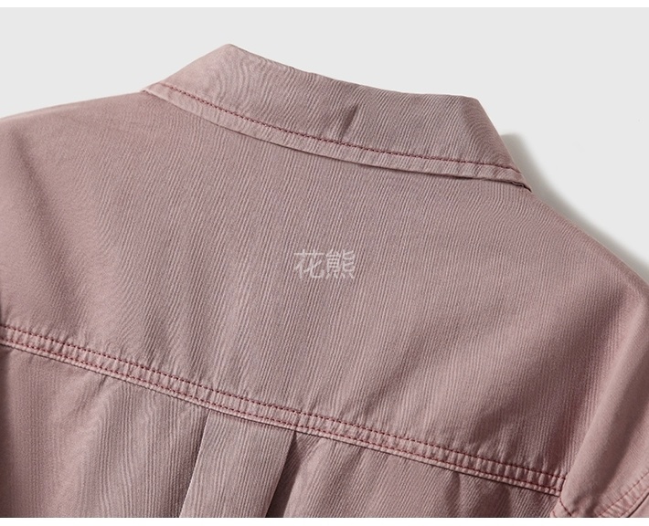 【早春翻糖粉牛仔外套】 设计师款,纯棉的牛仔衬衫也可作为外套两穿 竹节肌理感纯棉面料,上身有筋骨感,