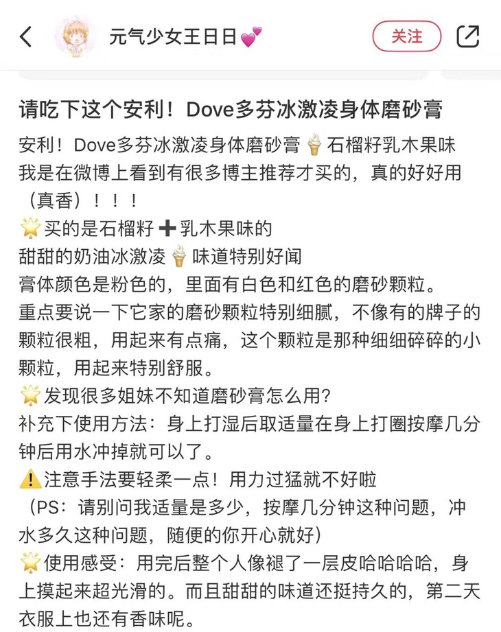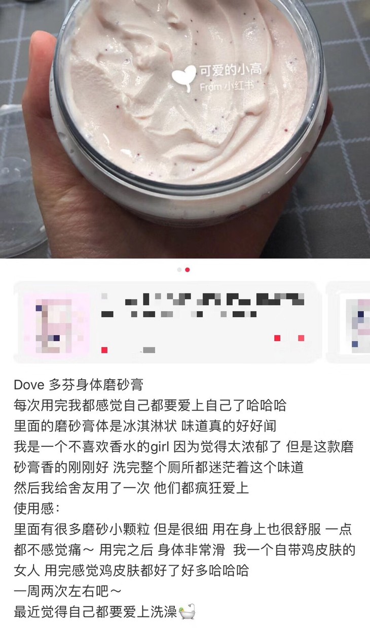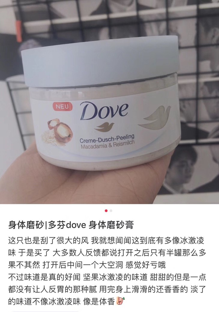 ☘️最近这股风刮的超级大😇还没有买的公举们可以下手了,别犹豫😍,让你的皮肤变嫩滑,女孩👧🏻赶紧都用起来,温和去角质、暗沉、鸡皮,成分里包含1/4多芬润肤乳液,所以嫩滑肌肤一步搞定,而且两款香氛都很好闻,留香持久,沐浴时,磨砂膏打圈按摩全身,胳膊肘、膝关节等部位可以多揉一会,用完后皮肤又滑又嫩,自己都忍不住要多摸几次自己的皮肤[偷笑],即使用完不涂身体乳,皮肤也不会干!
