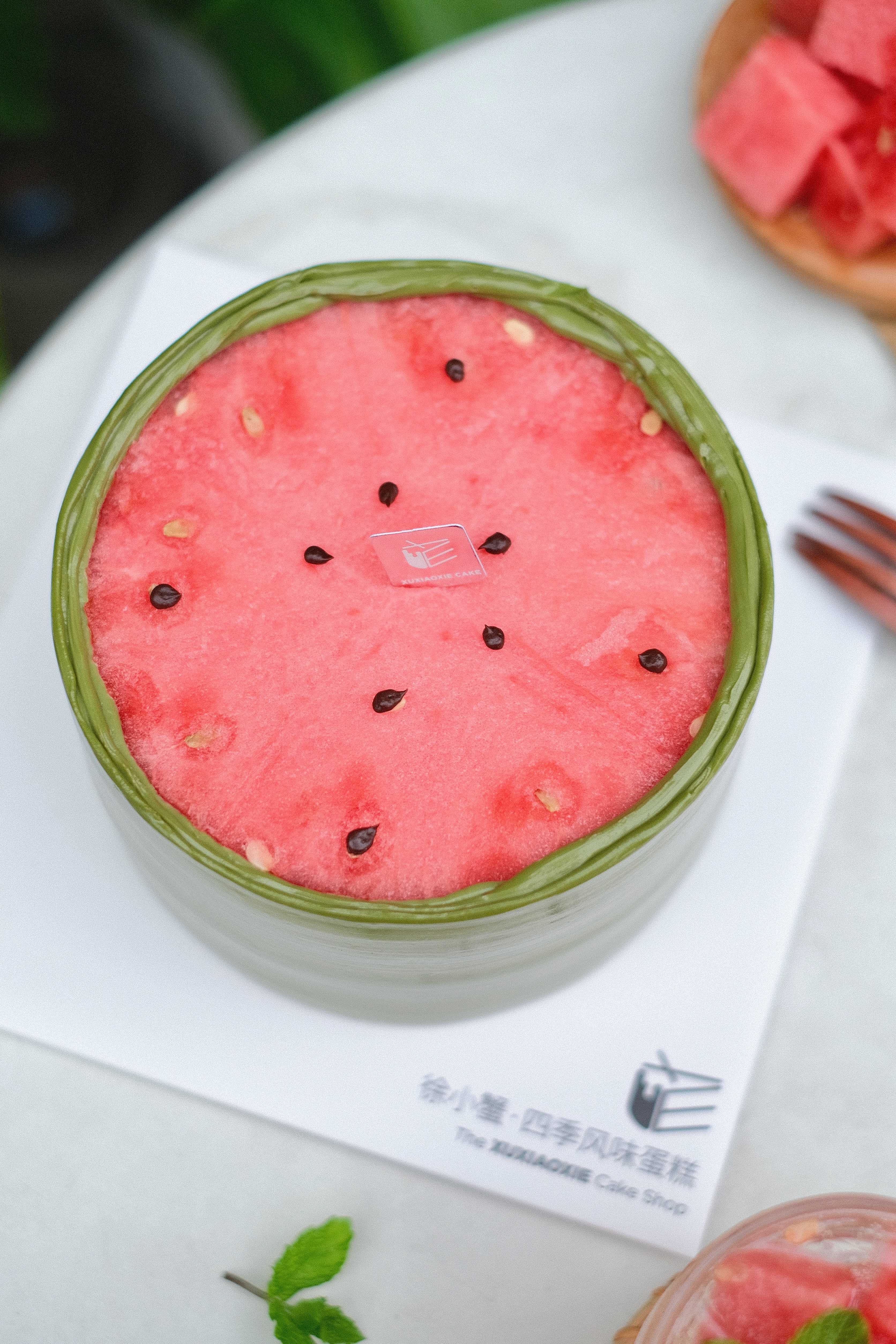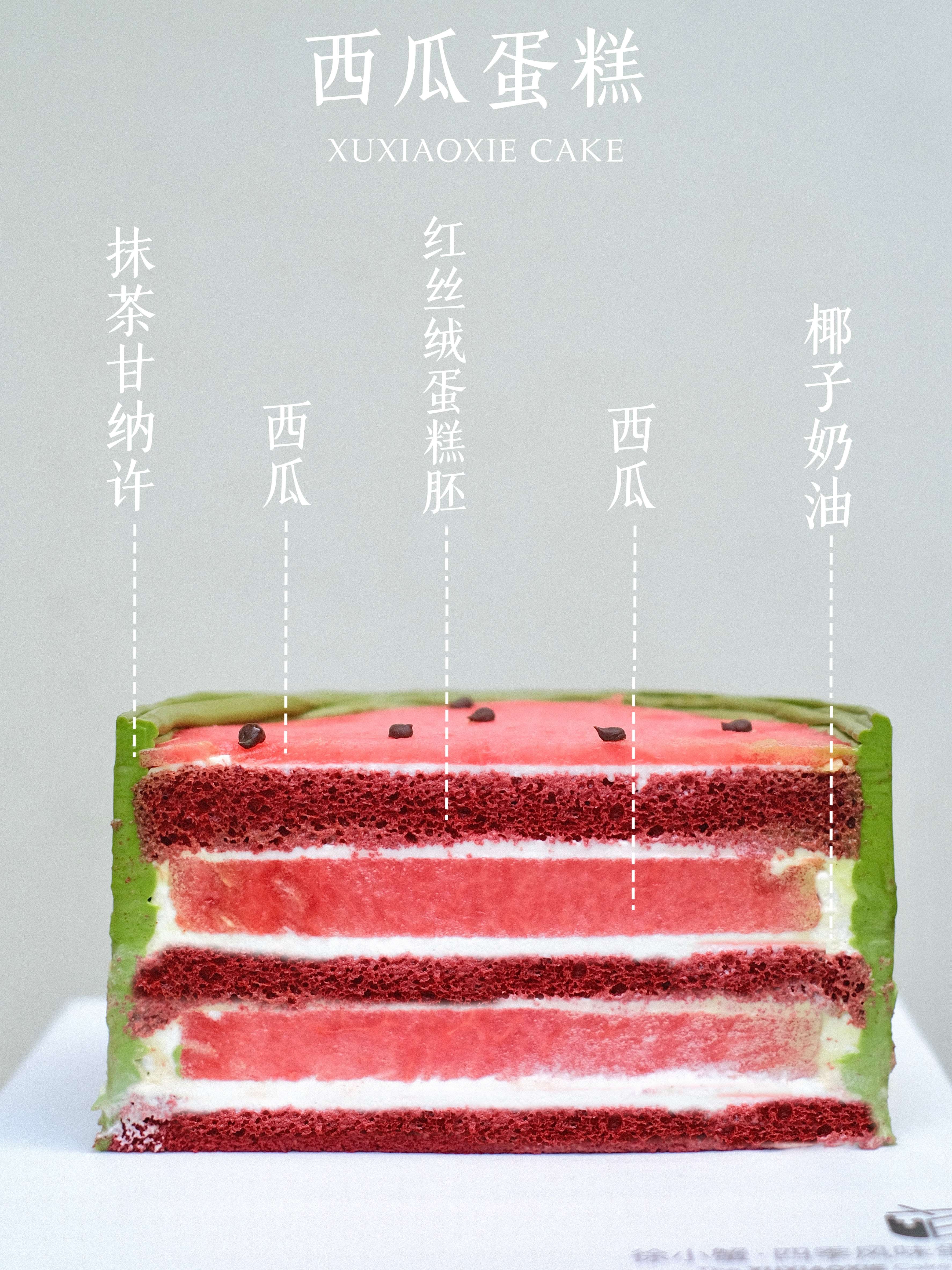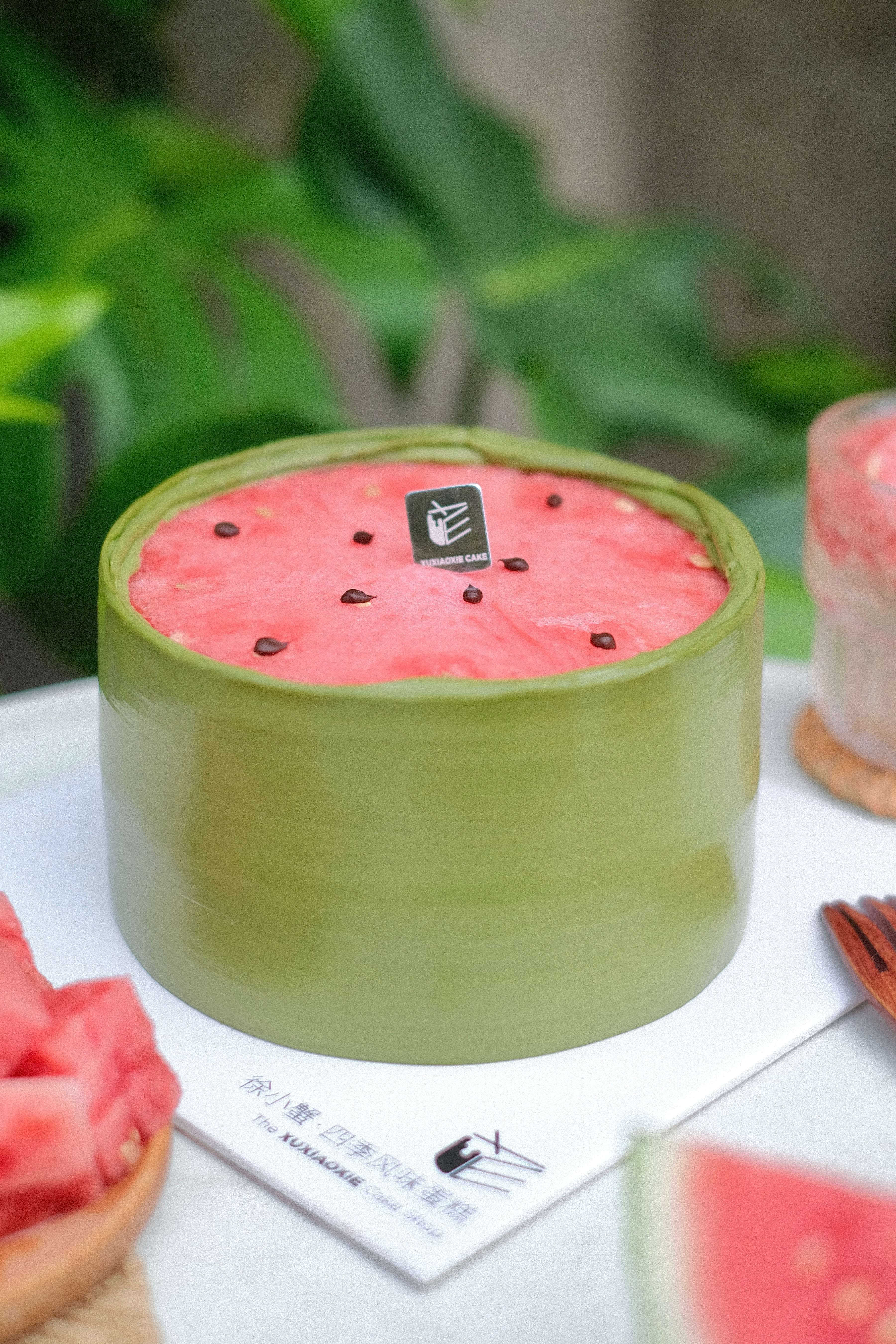 夏日限定,这个季节就是西瓜味的夏天。新鲜多汁的西瓜果肉搭配椰子奶油,抹茶甘纳许,搭配红丝绒戚风胚的浓郁