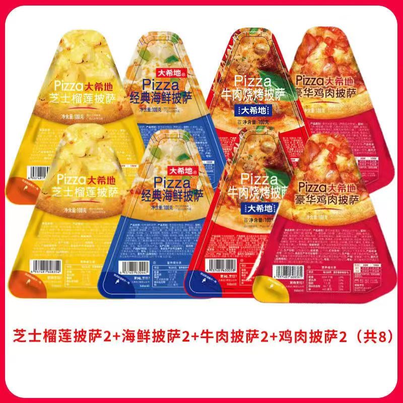大希地芝士榴莲披萨100g*1+大希地豪华鸡肉披萨100g*1+经典海鲜披萨100g*1+牛肉烧烤披萨100g*1