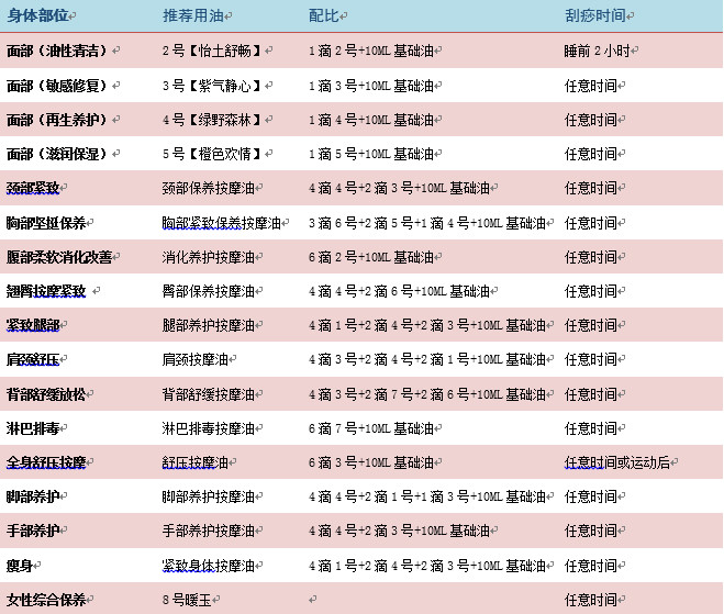 step1:根据身体的需要选择适合的按摩油 下表供参考