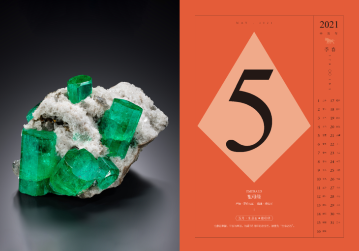 在特别版的矿物日历中,将中国经典的传统「二十四节气」与矿物标本交融汇合,更挑选了能代表不同节气规律的矿物标本,如「立春」代表万物复苏,而祖母绿是绿宝石之王,选用“祖母绿”矿标与之对应,绿是春的象征,寓意着春意盎然,会有一个好的开始。