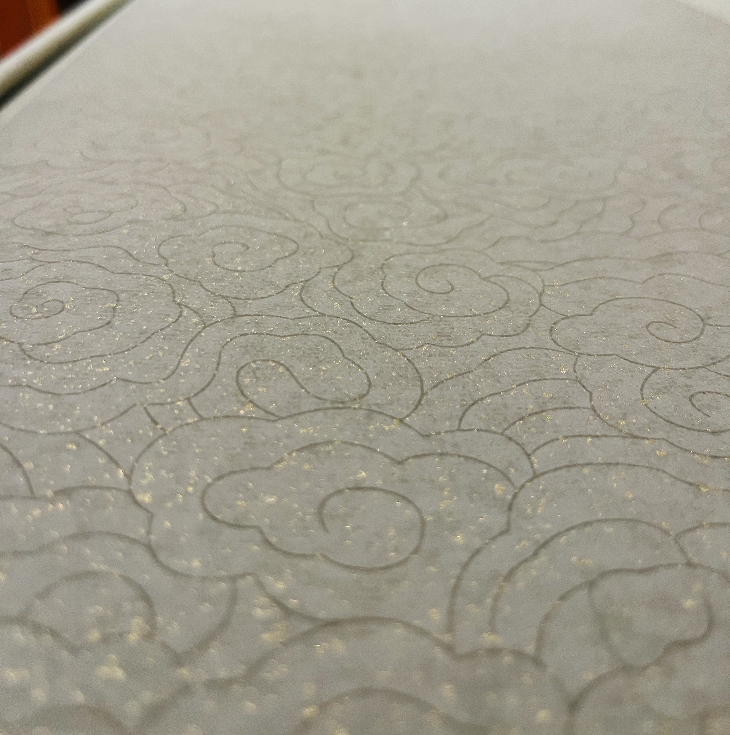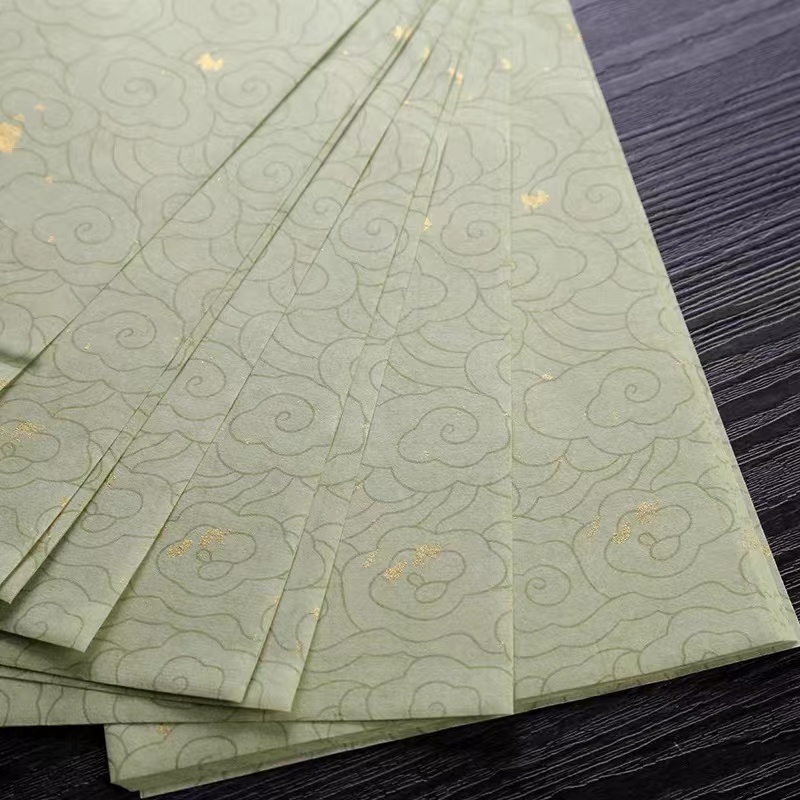 手工宣纸、手工上色,点缀洒金祥云图案,纸性四分熟,纸张细腻温润,书写流畅,轻微胀墨,可见行笔。