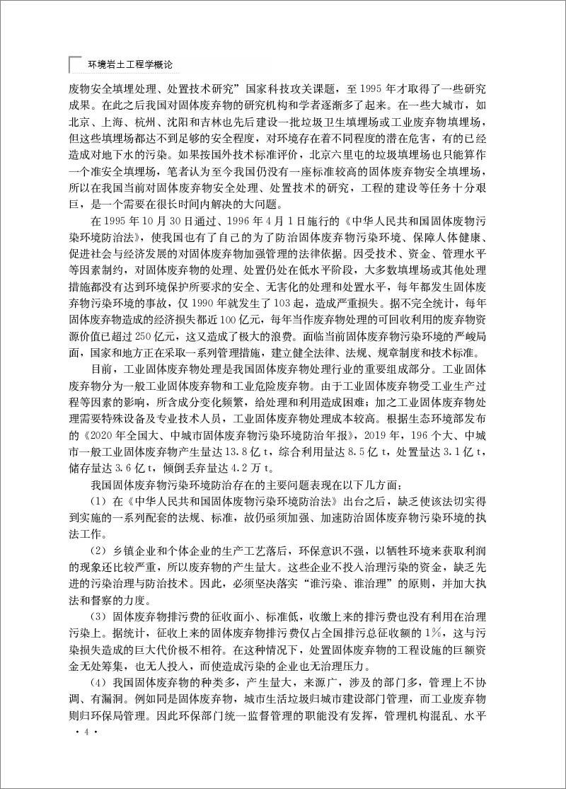 本书主要内容包括城市固体废弃物的工程性质及其污染形式、污染物在土中的污染运移模型、填埋场场地勘察与评价、现代卫生填埋场的设计与计算、放射性有害废料的处置、人类工程活动引起的环境岩土工程问题、自然界中的环境岩土工程问题、固体废弃物利用研究、土壤污染修复技术、污染场地修复和阻隔技术、微生物技术改良土壤等,并配有与每章内容对应的思政主题。
