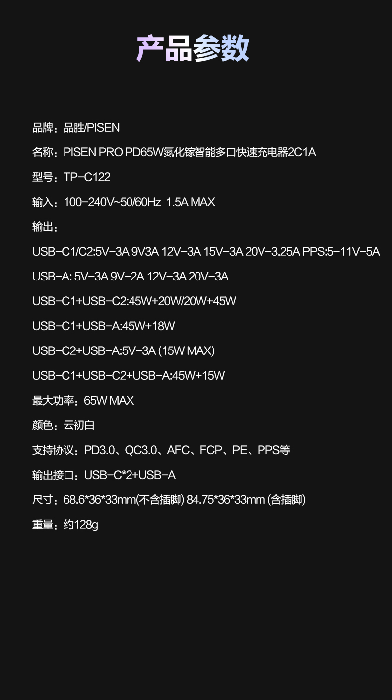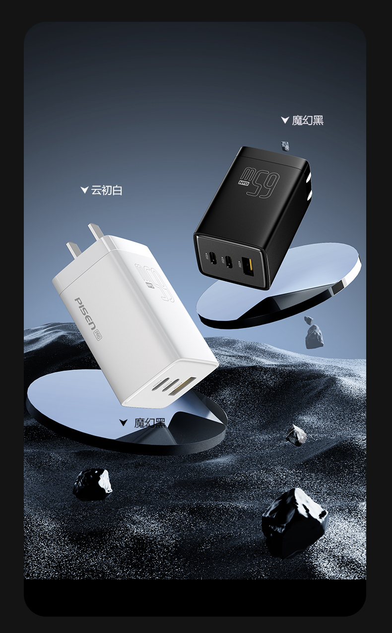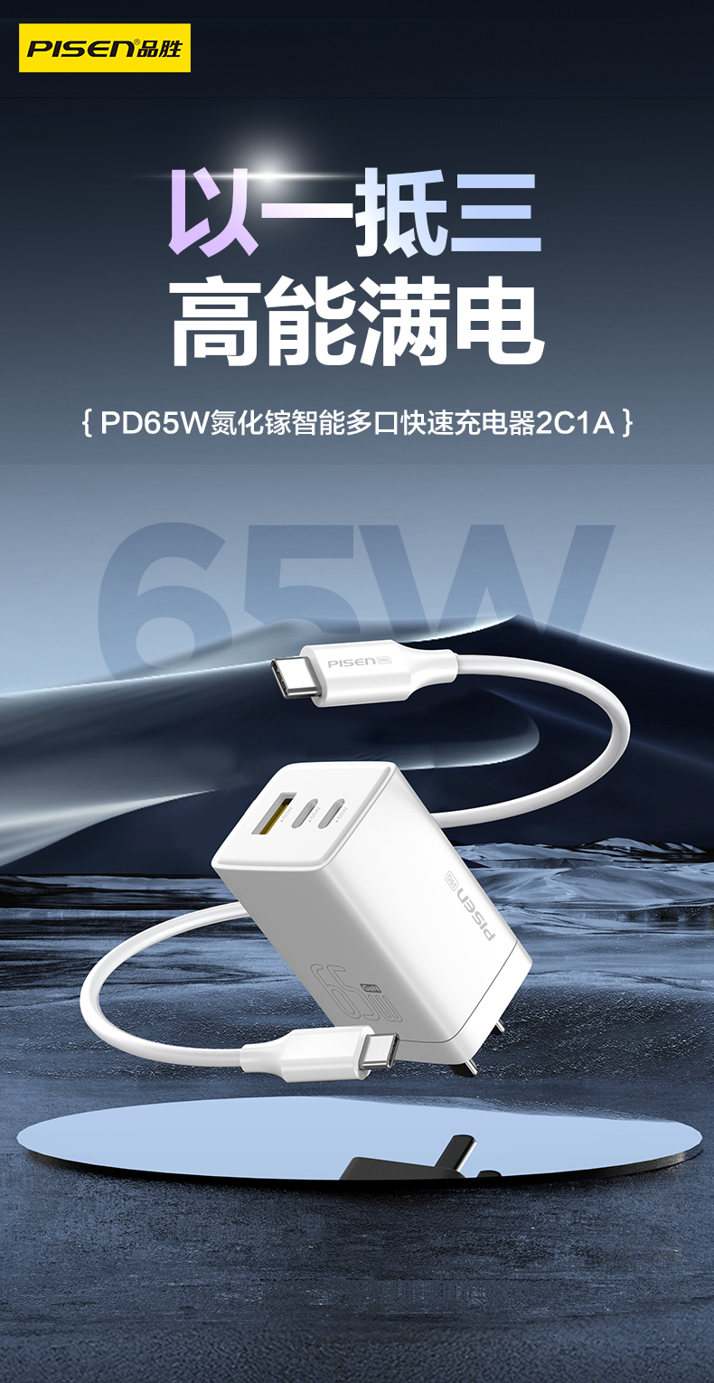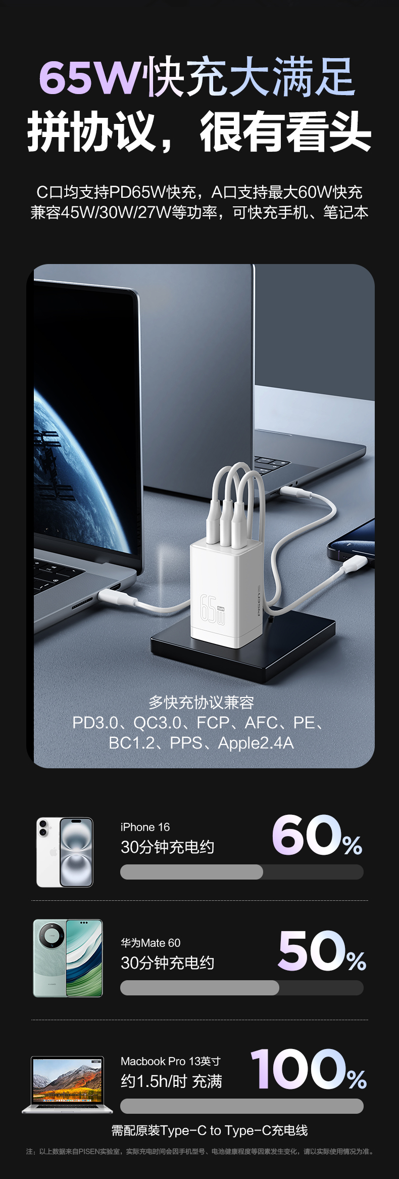 品胜 PD65W氮化镓智能多口快速充电器2C1AType-C兼容45W适用switch2苹果16/15华为Mate70笔记本电脑iPad