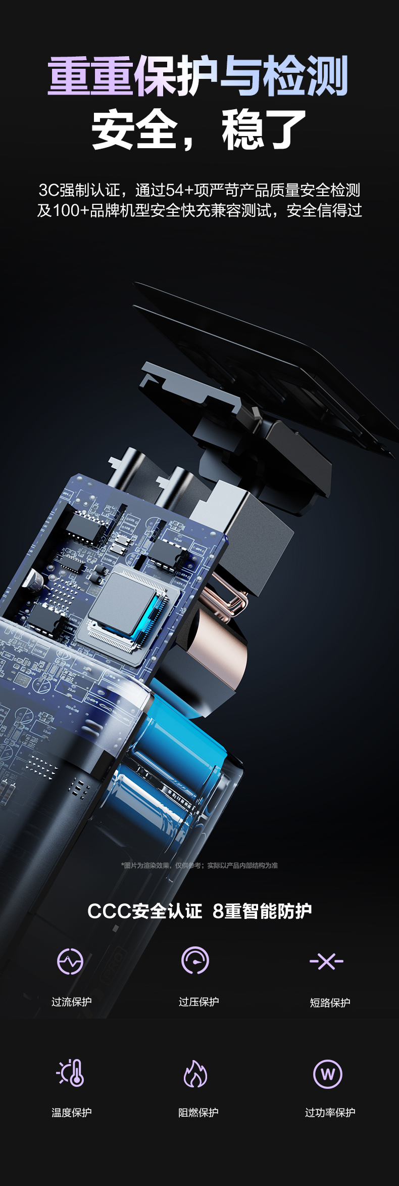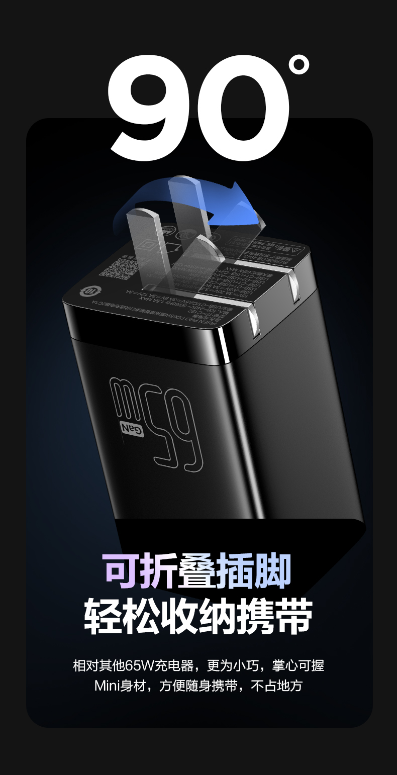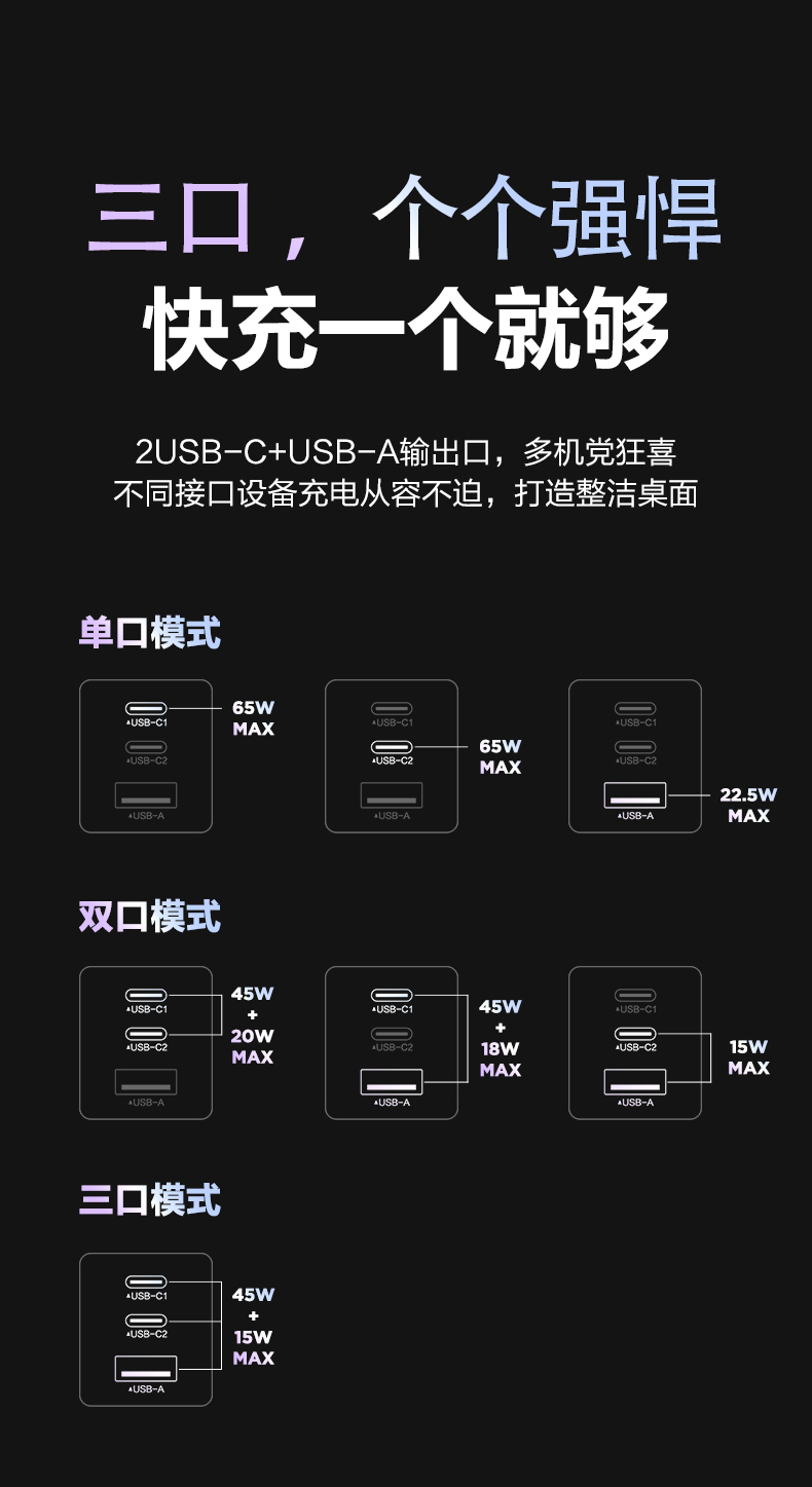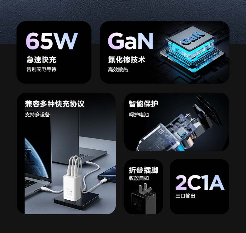 品胜 PD65W氮化镓智能多口快速充电器2C1AType-C兼容45W适用switch2苹果16/15华为Mate70笔记本电脑iPad