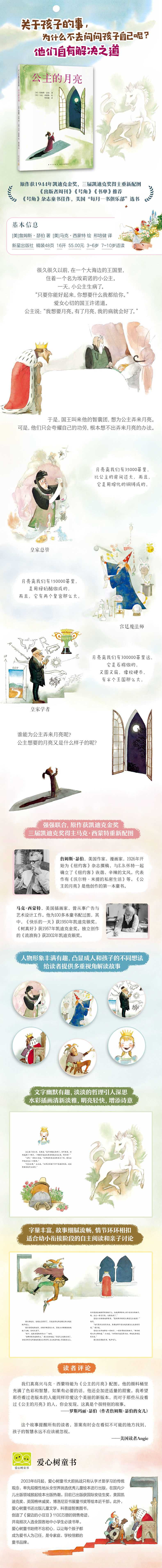 《公主的月亮》初版于1943年,由路易斯;斯洛博根(LouisSlobodkin)插画,获1944年凯迪克金奖。现在,马克;西蒙特用清新可爱的水彩画,把这个精彩的故事重新呈现给当代的孩子们。轻盈淡雅的图画与睿智幽默的文字相得益彰,让这个历经半个多世纪的经典作品,焕发出更加夺目的光芒。