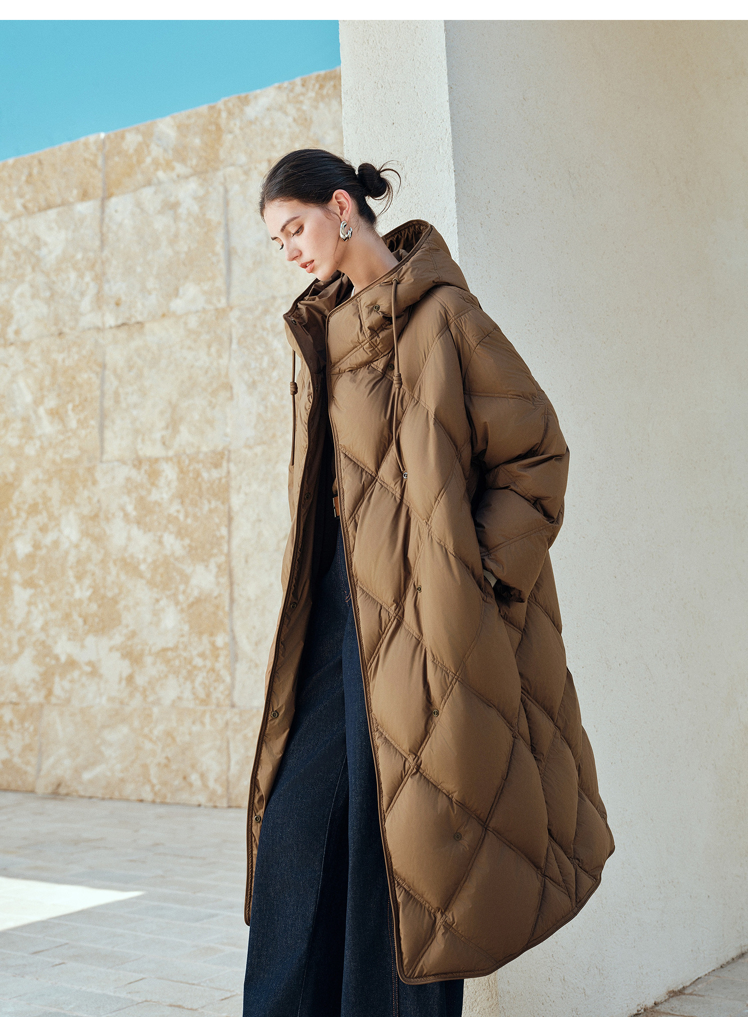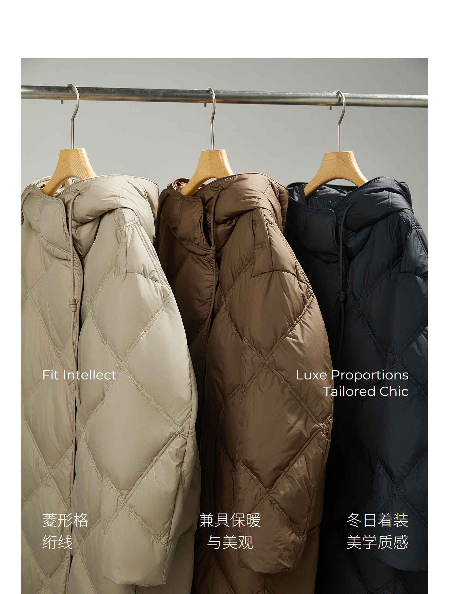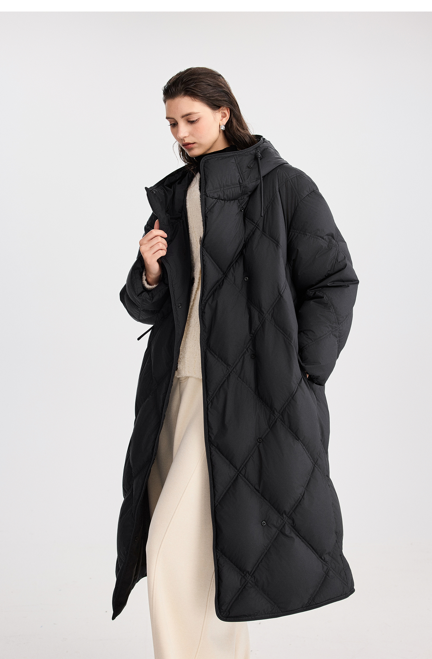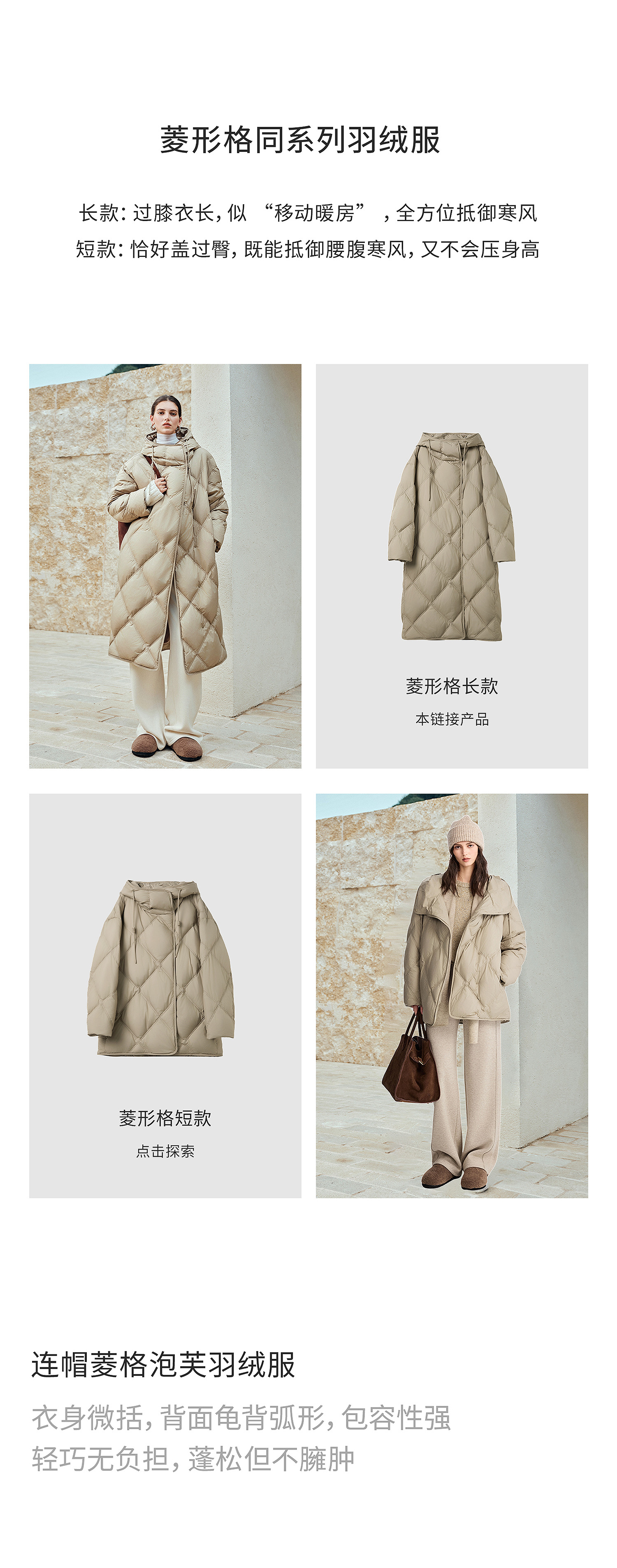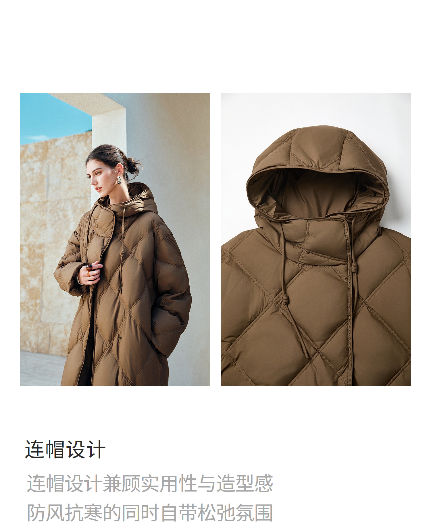 棉仓367615004-【90白鹅绒】菱形格廓型连帽羽绒服女25秋冬过膝中长款外套