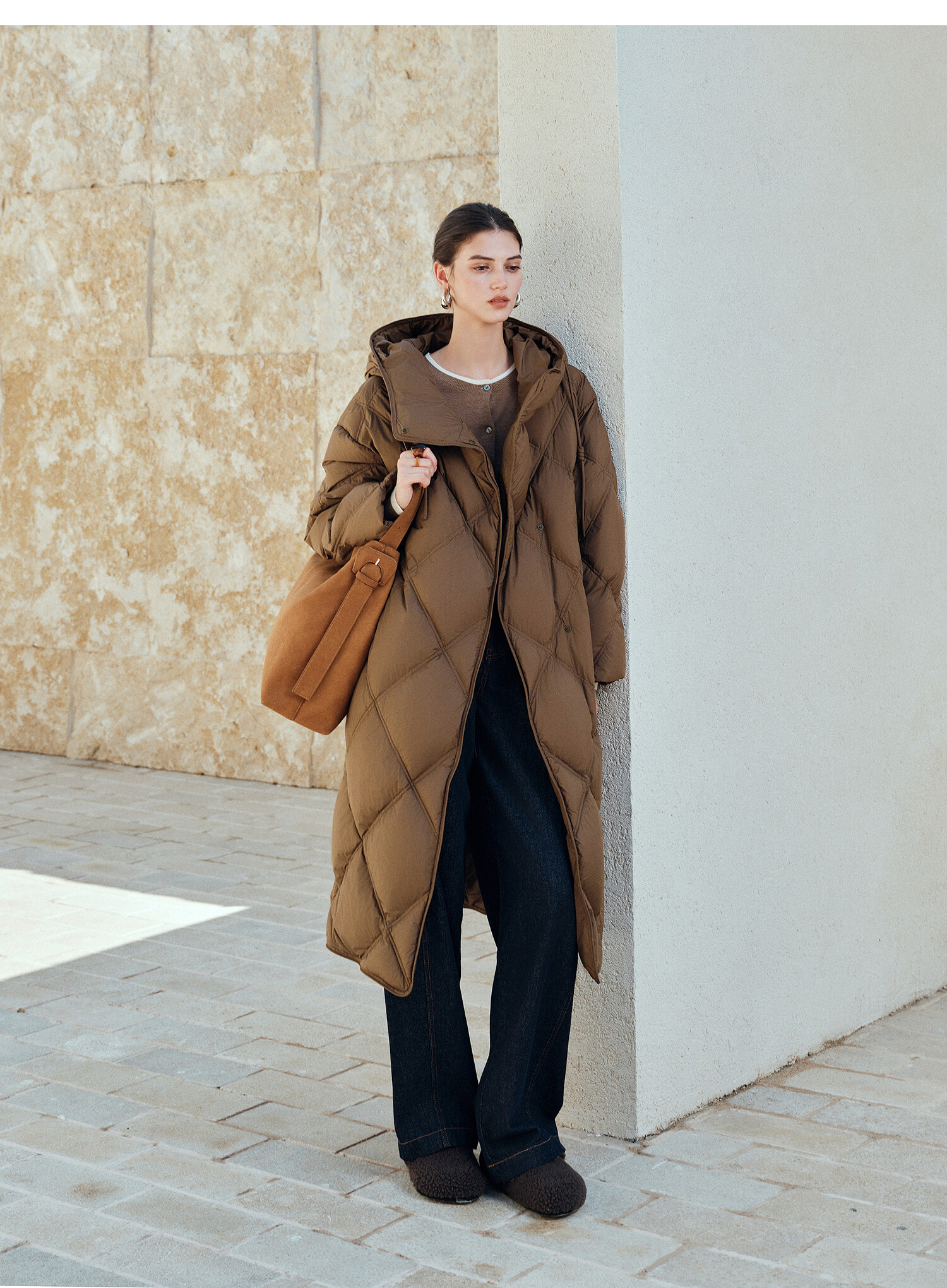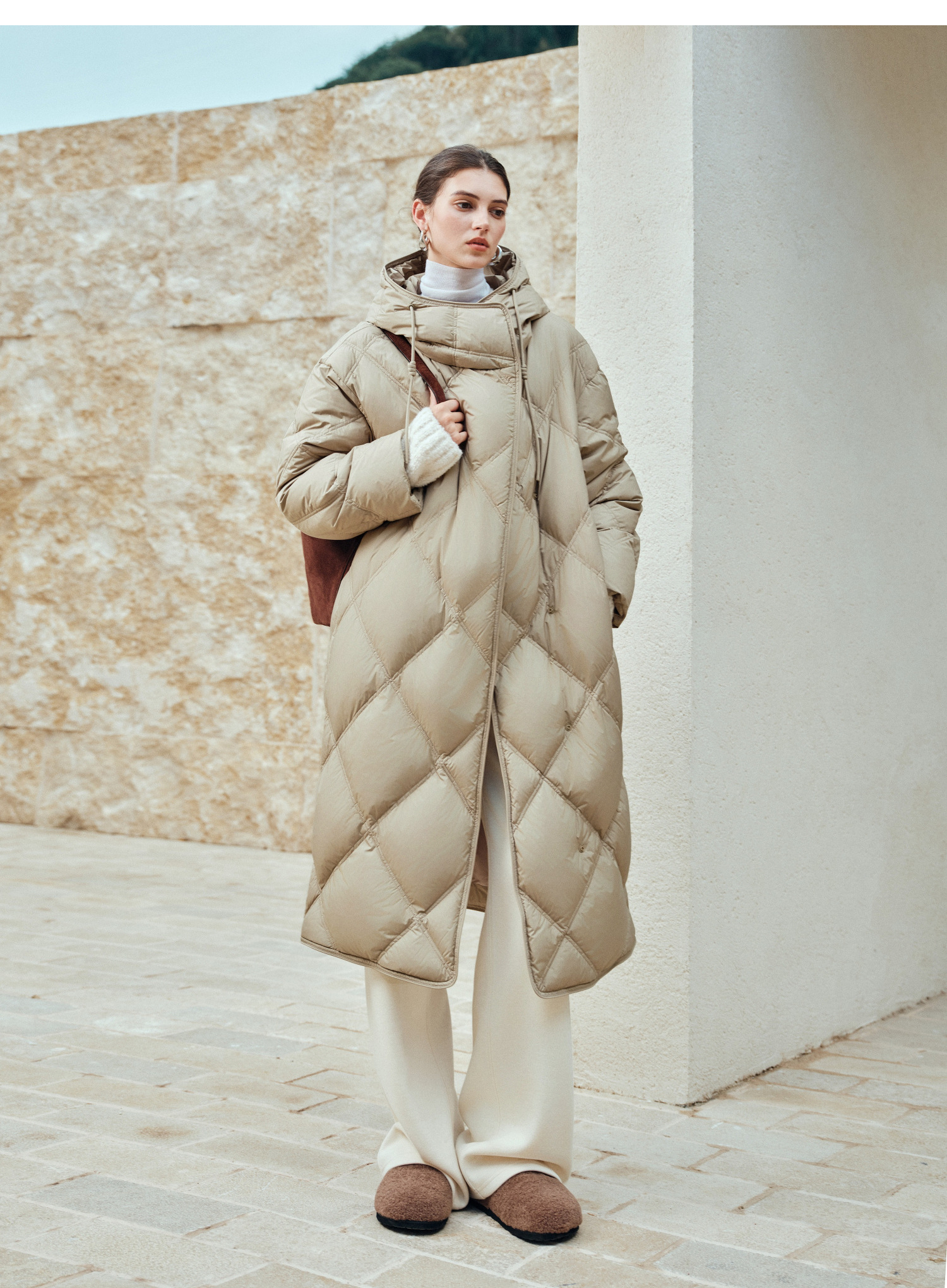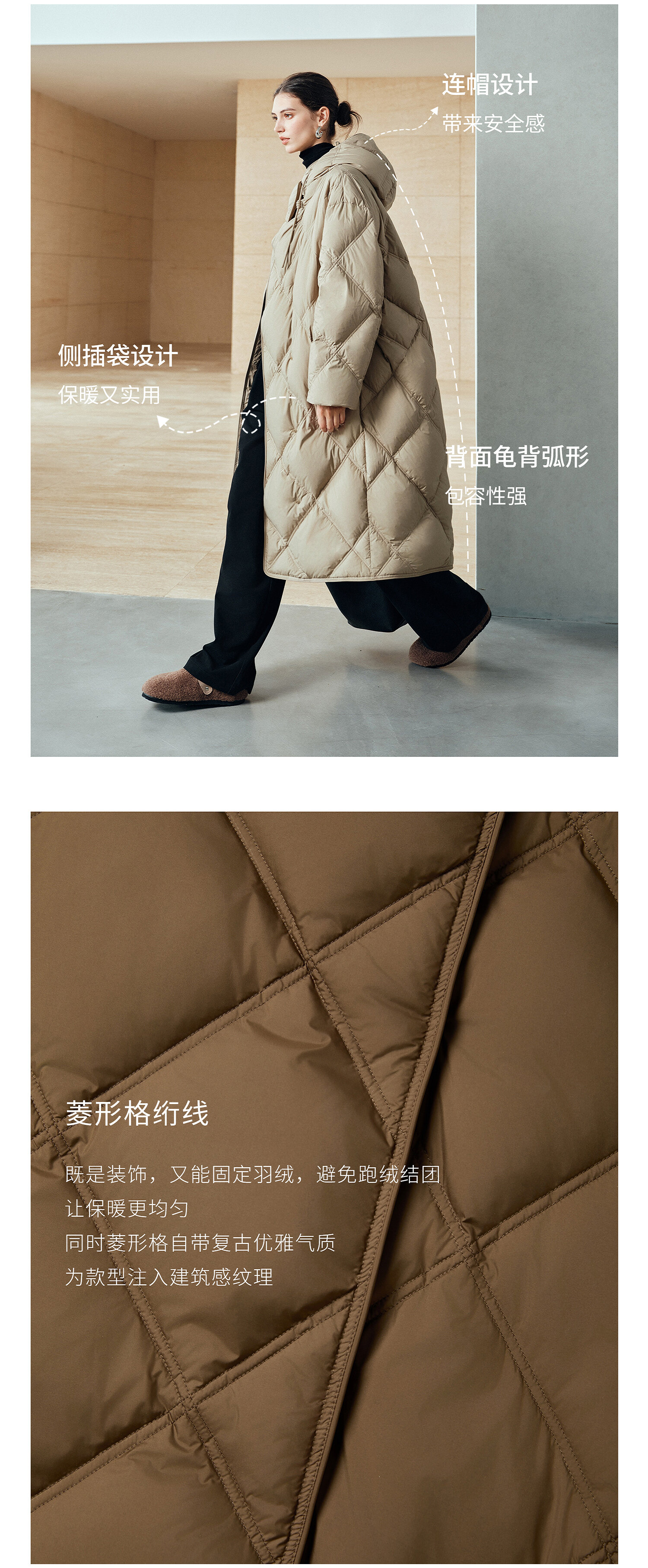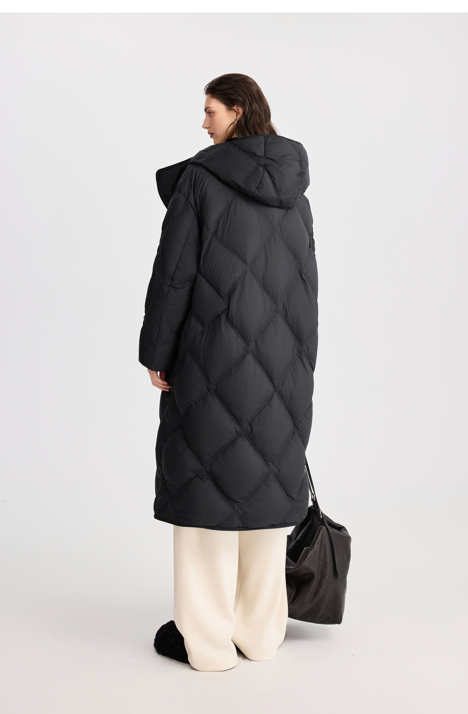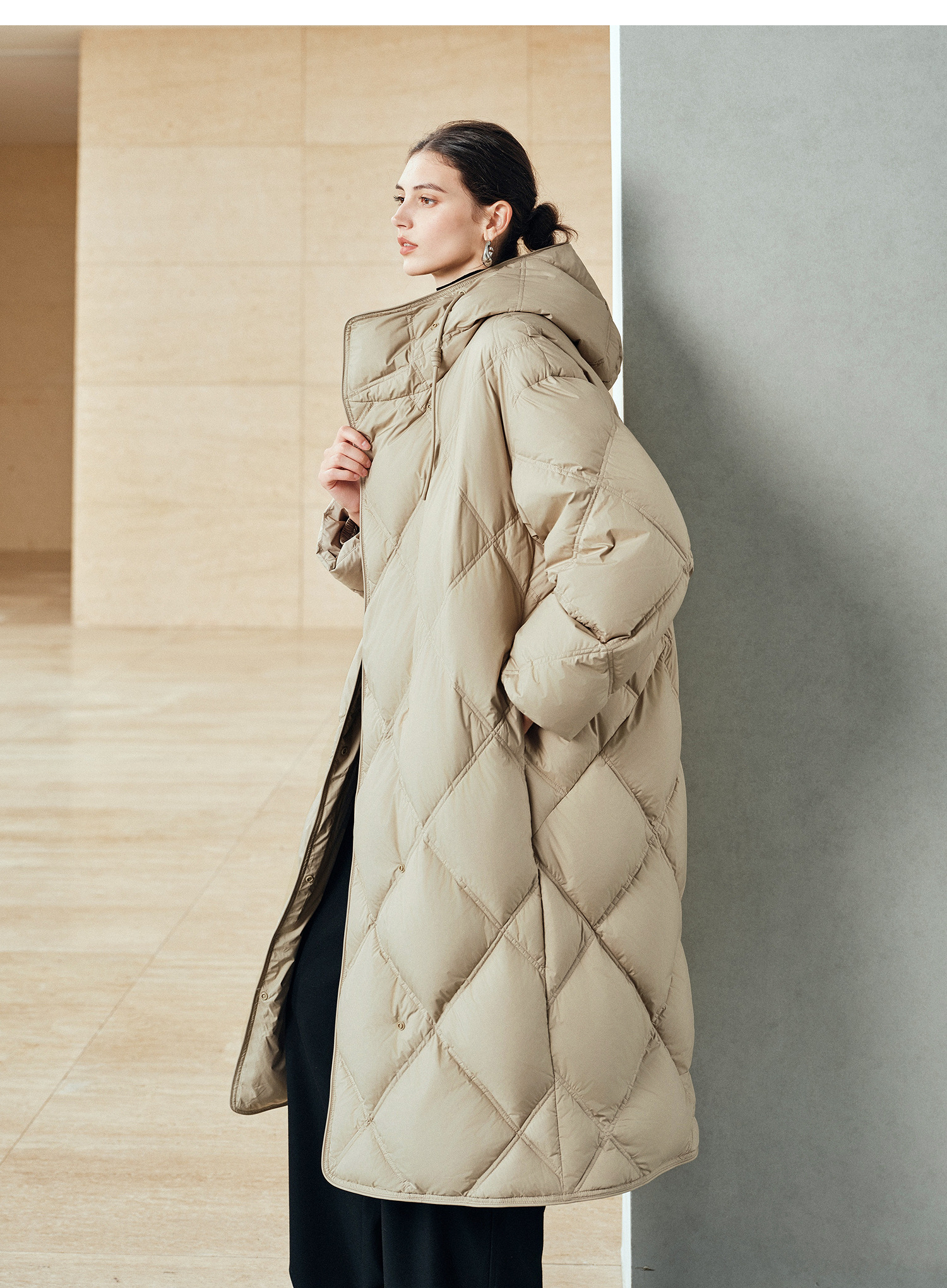 棉仓367615004-【90白鹅绒】菱形格廓型连帽羽绒服女25秋冬过膝中长款外套