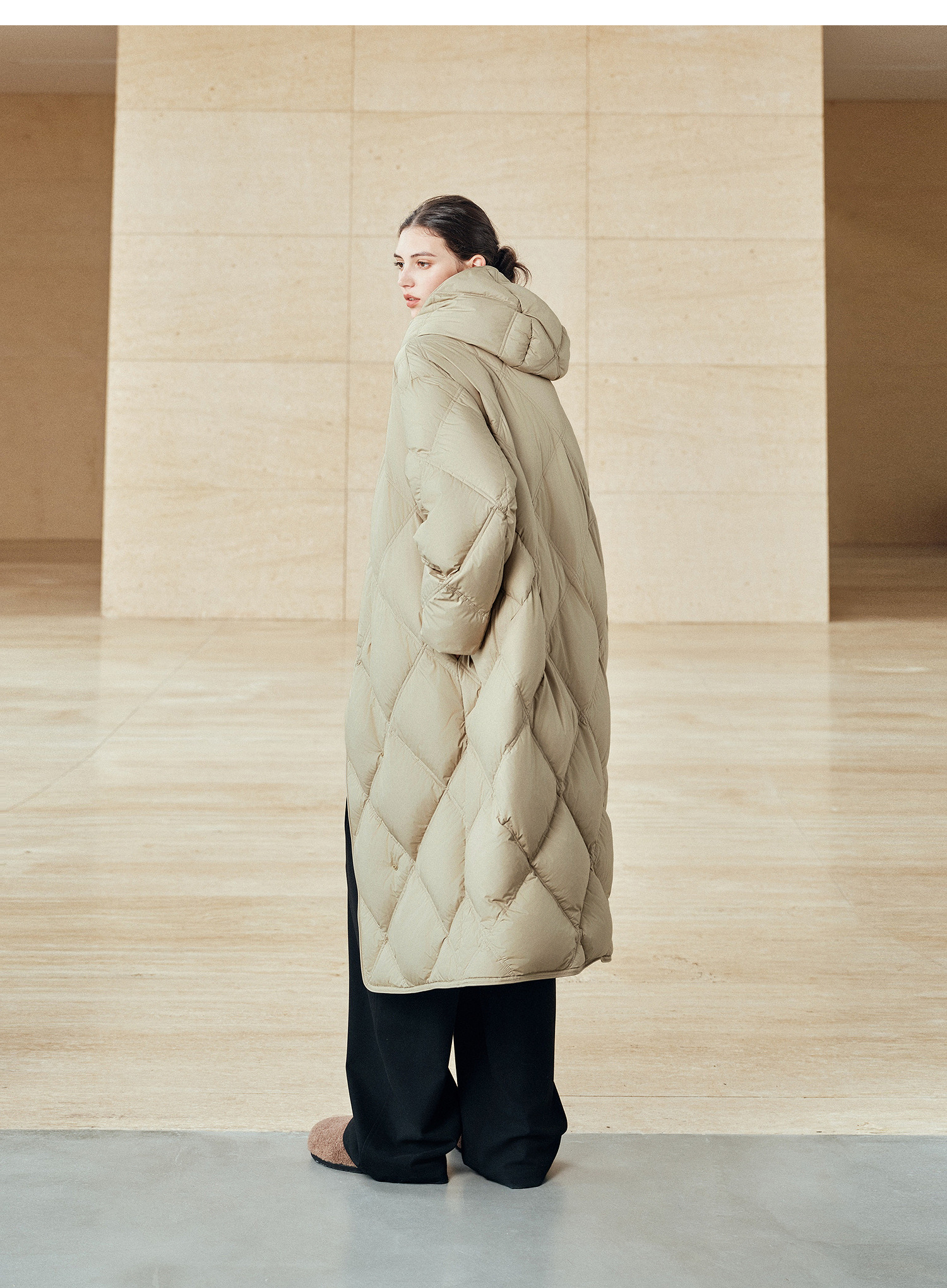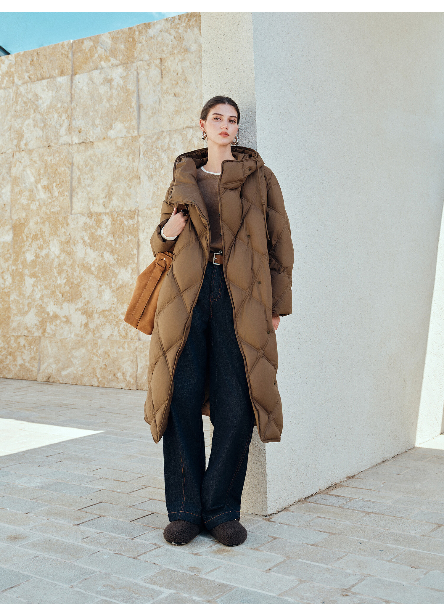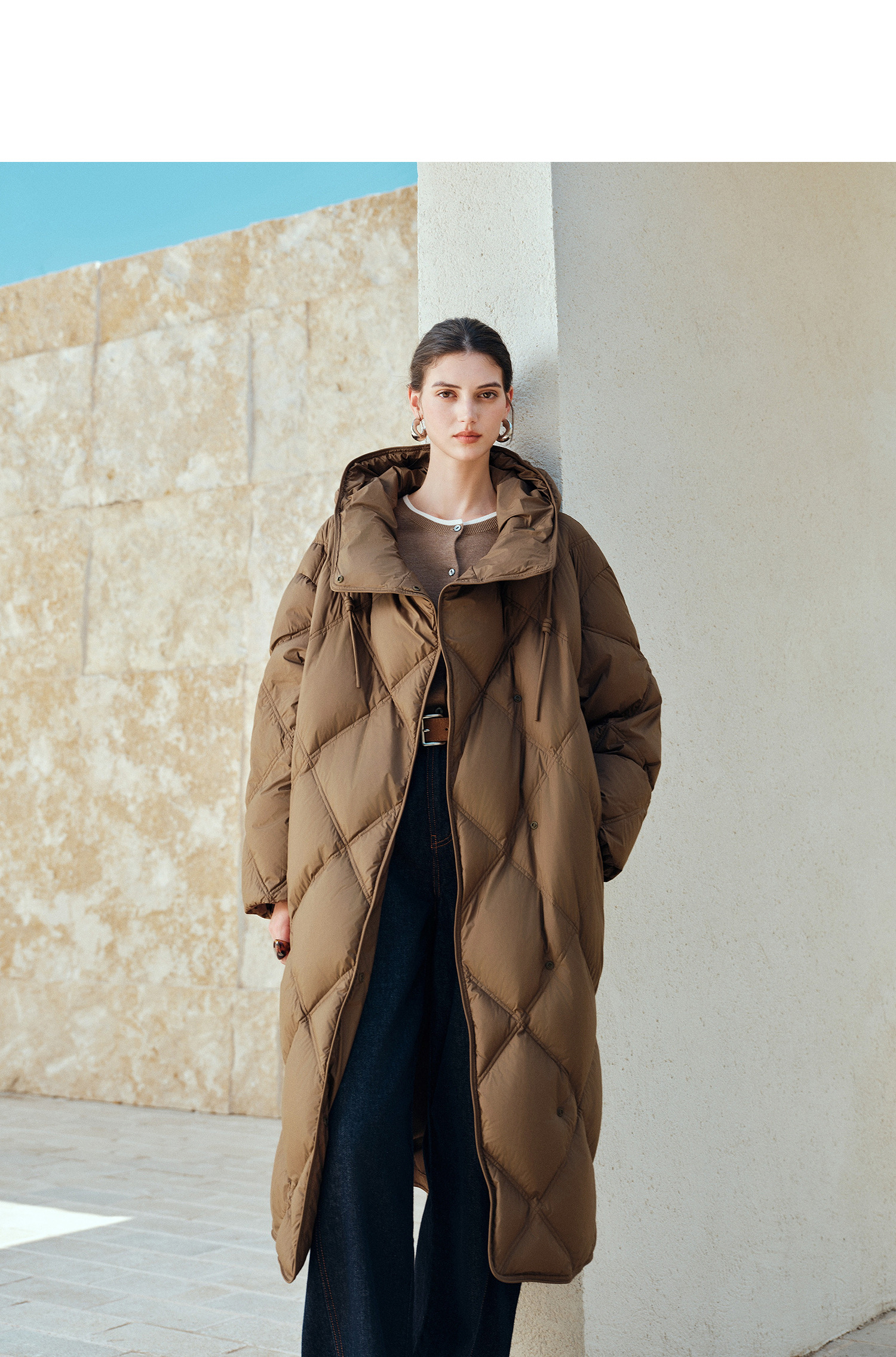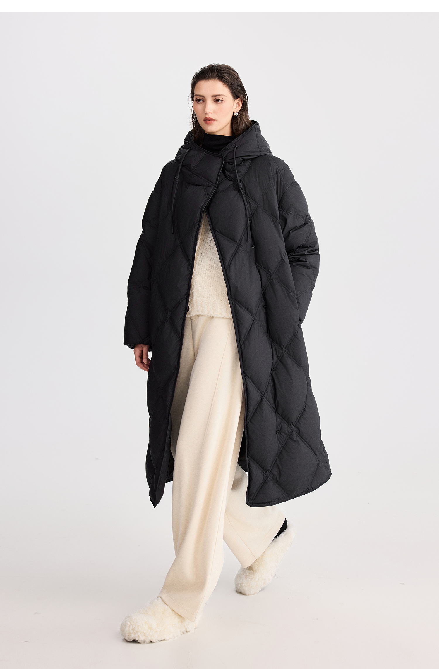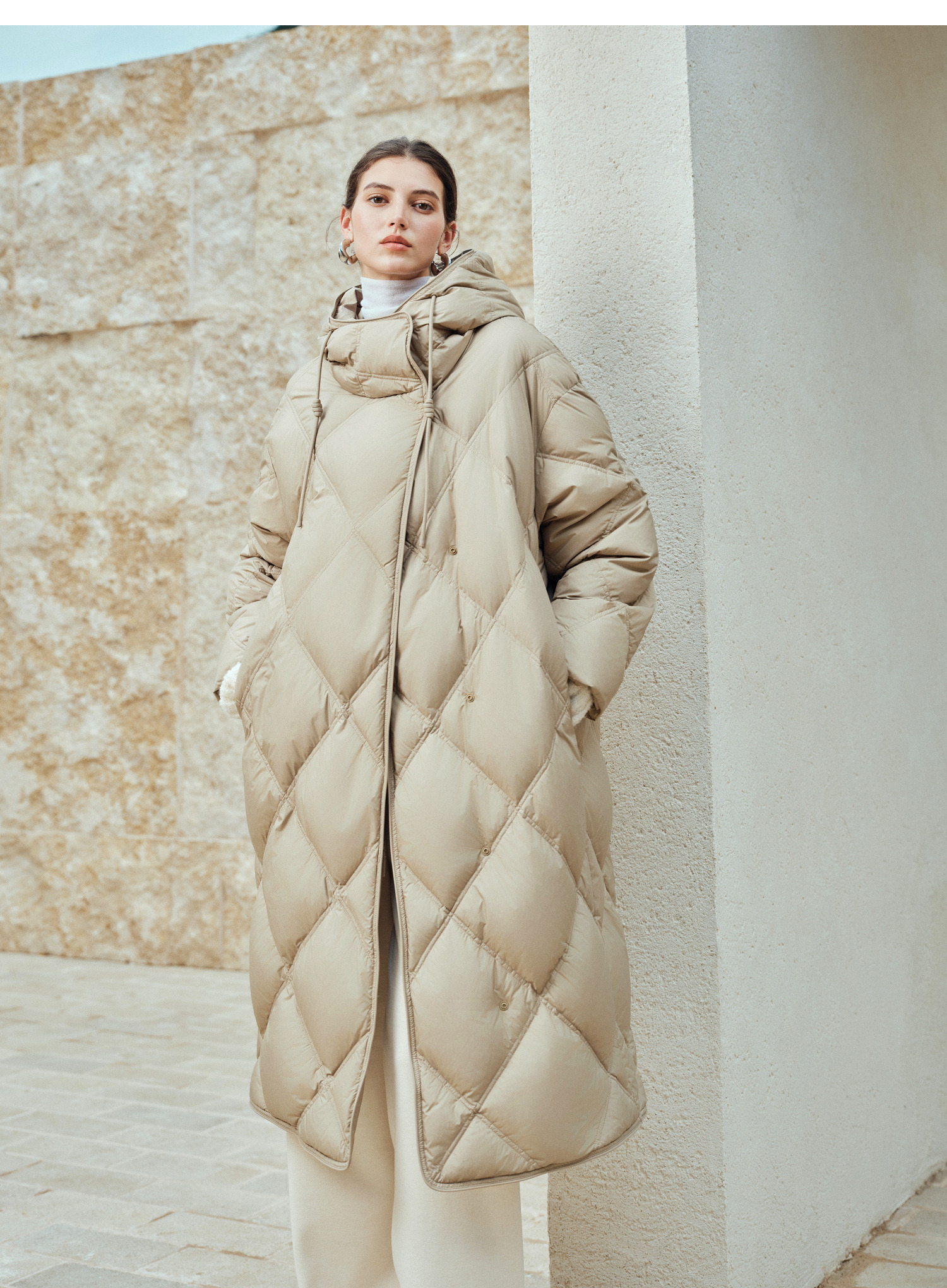 棉仓367615004-【90白鹅绒】菱形格廓型连帽羽绒服女25秋冬过膝中长款外套