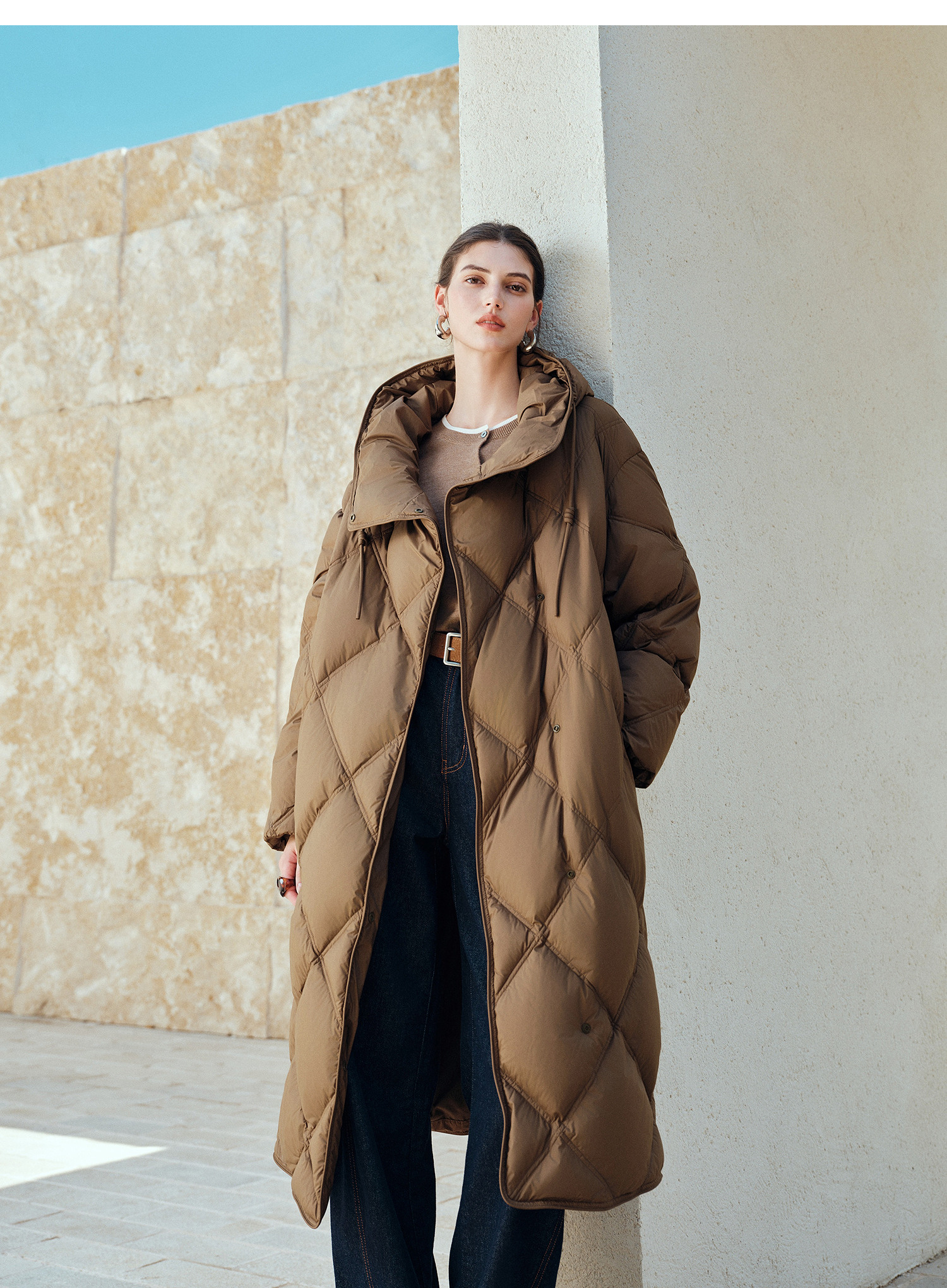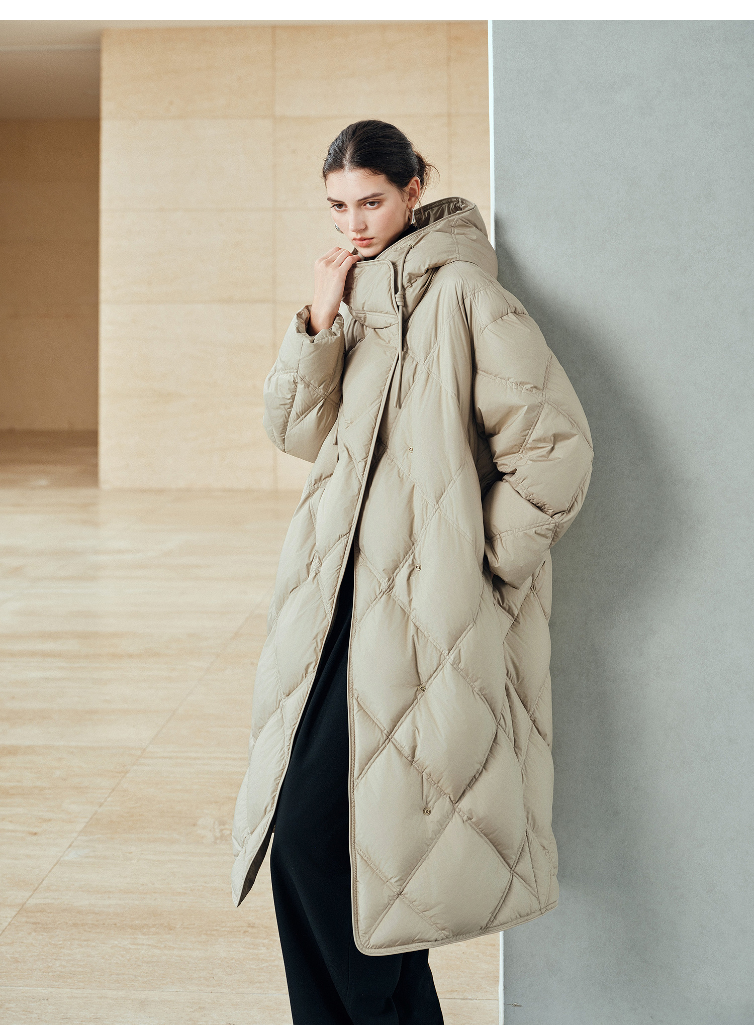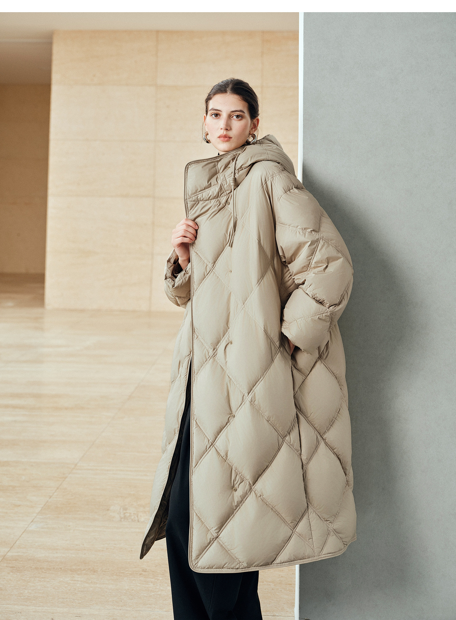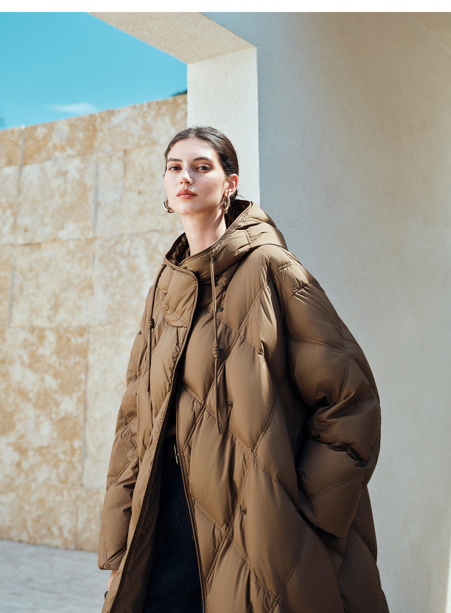 棉仓367615004-【90白鹅绒】菱形格廓型连帽羽绒服女25秋冬过膝中长款外套
