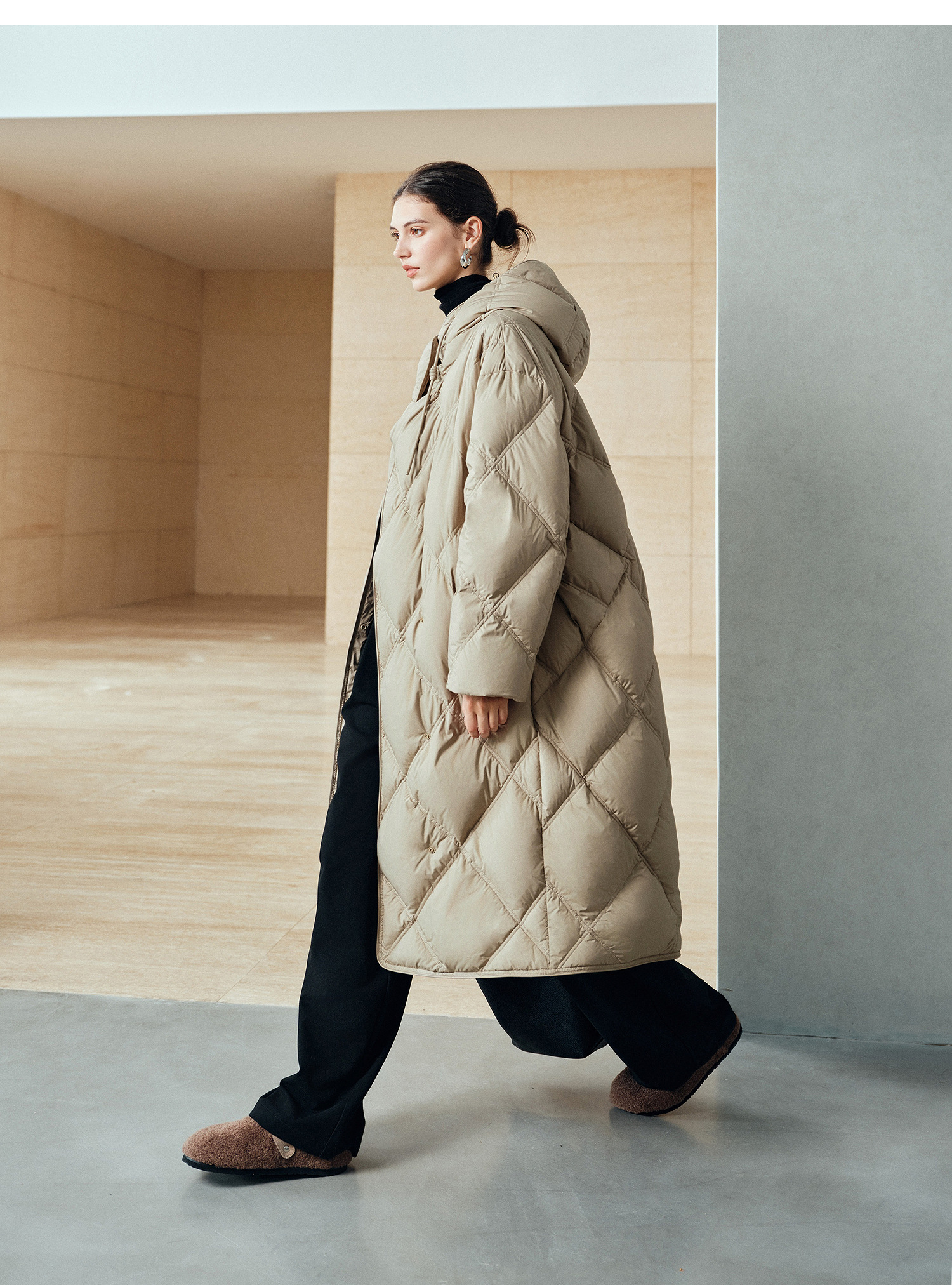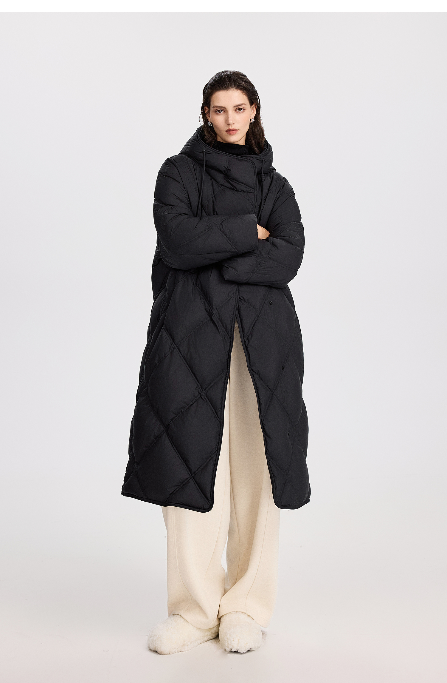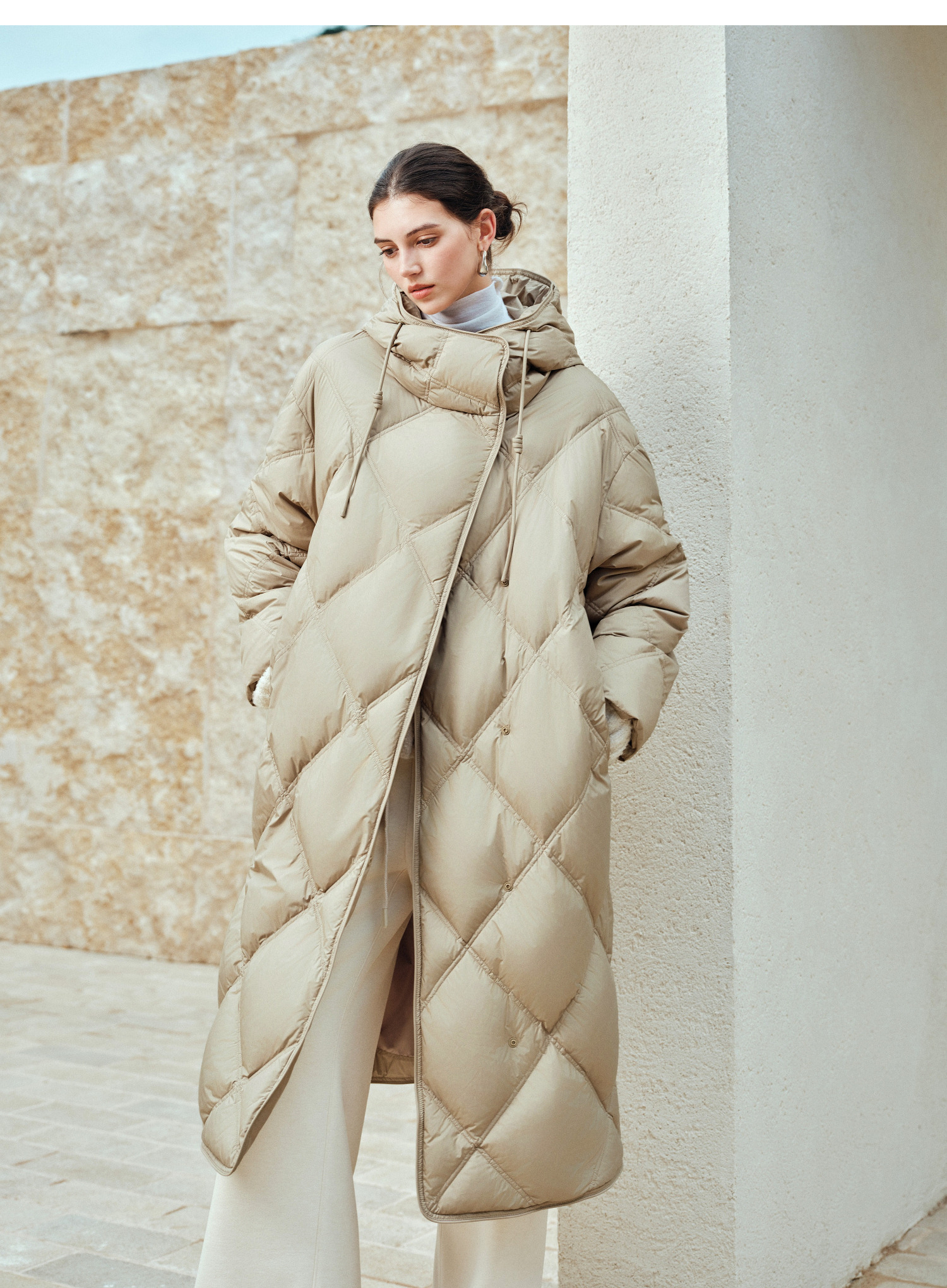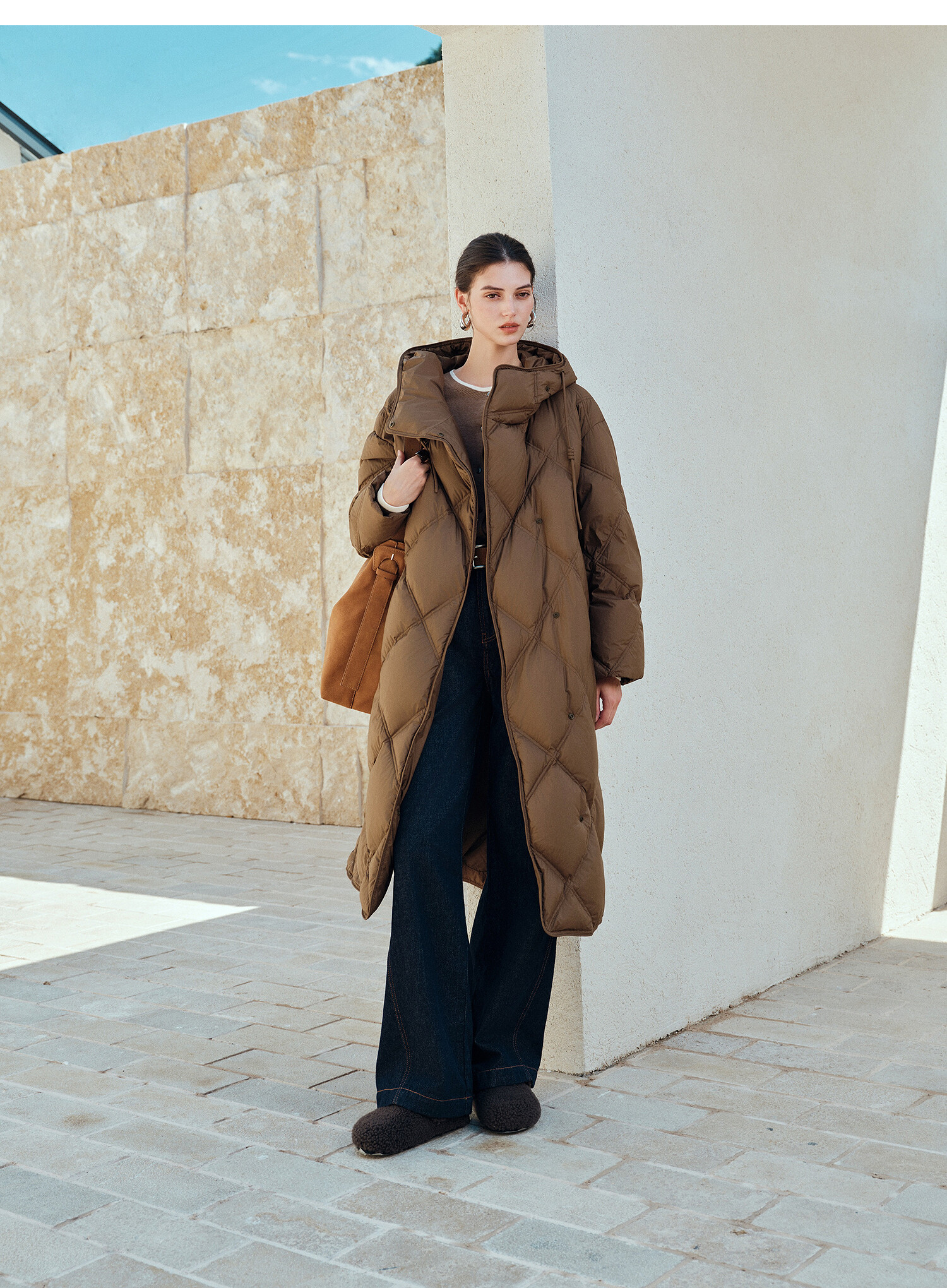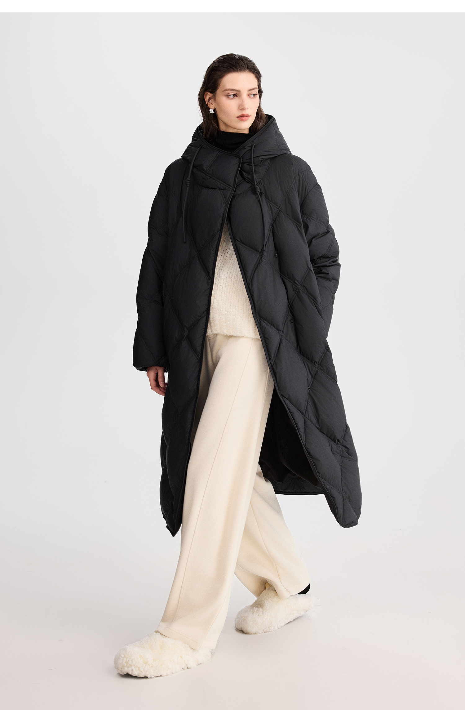 棉仓367615004-【90白鹅绒】菱形格廓型连帽羽绒服女25秋冬过膝中长款外套