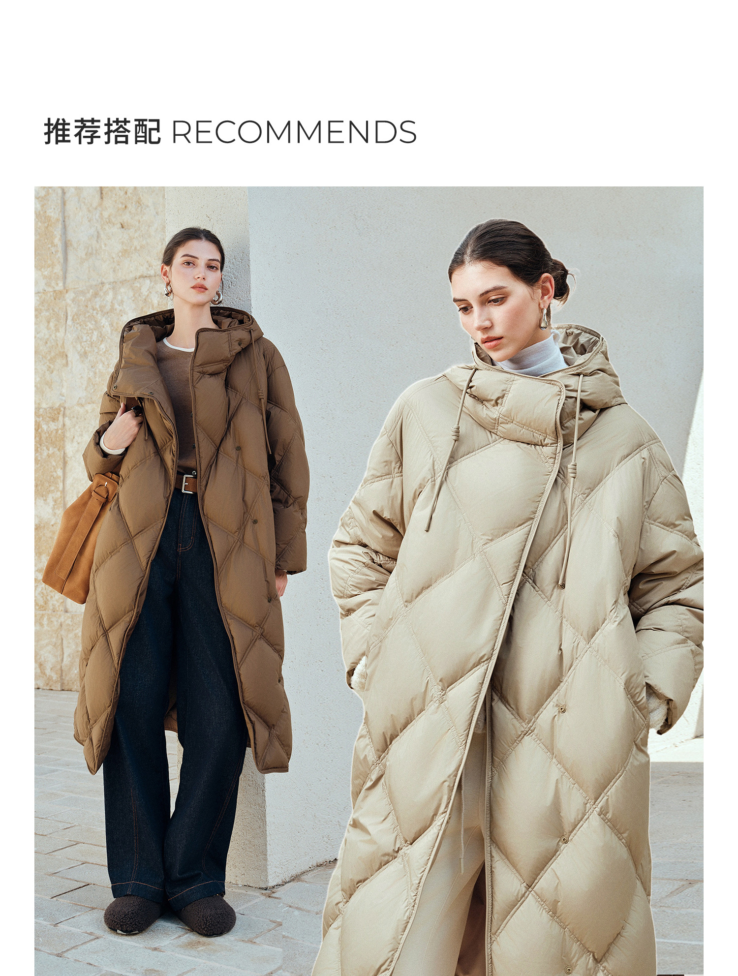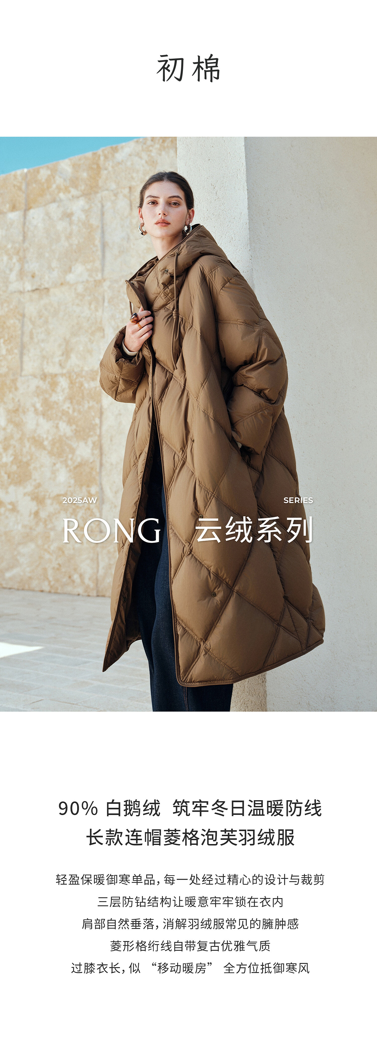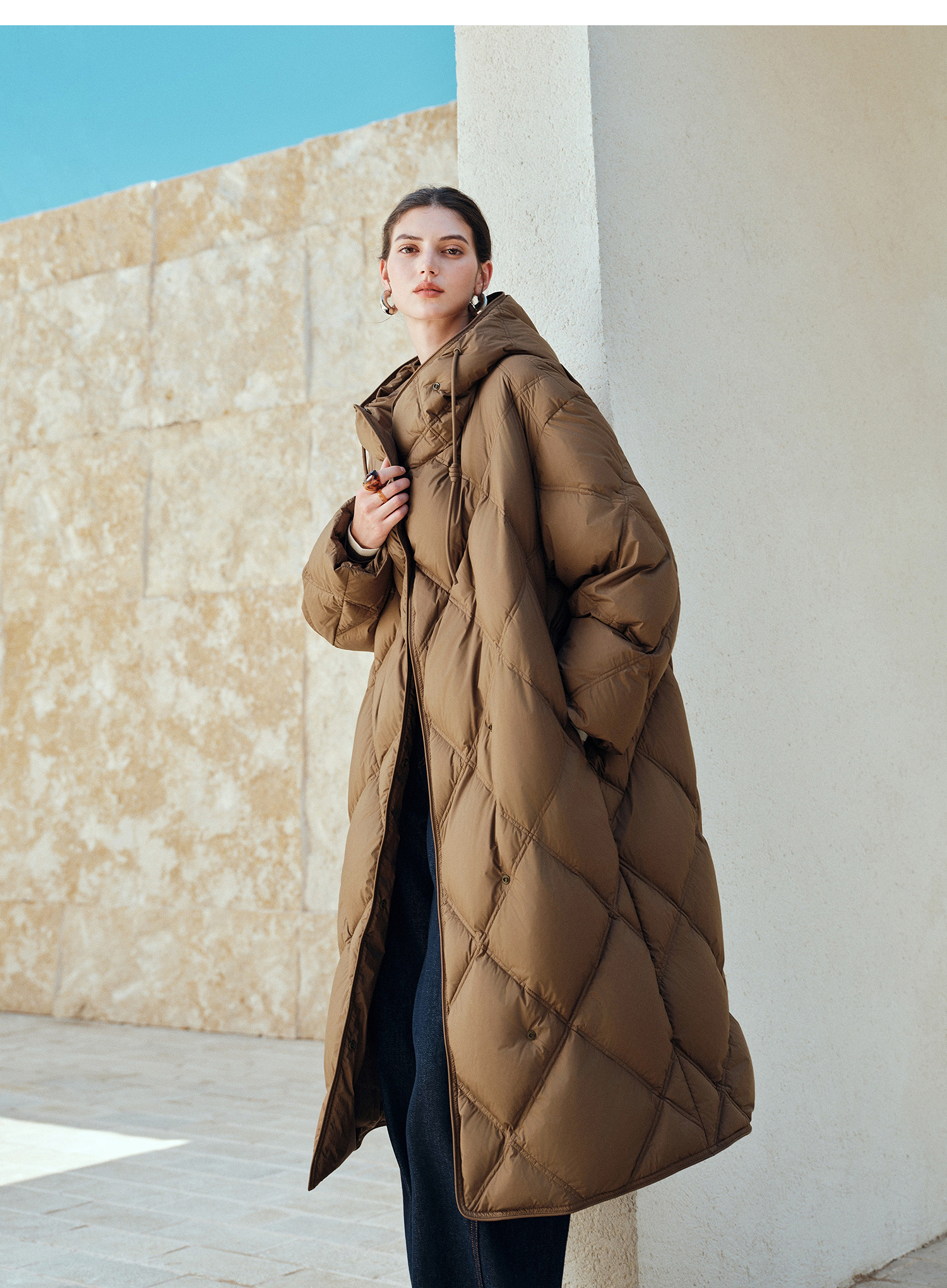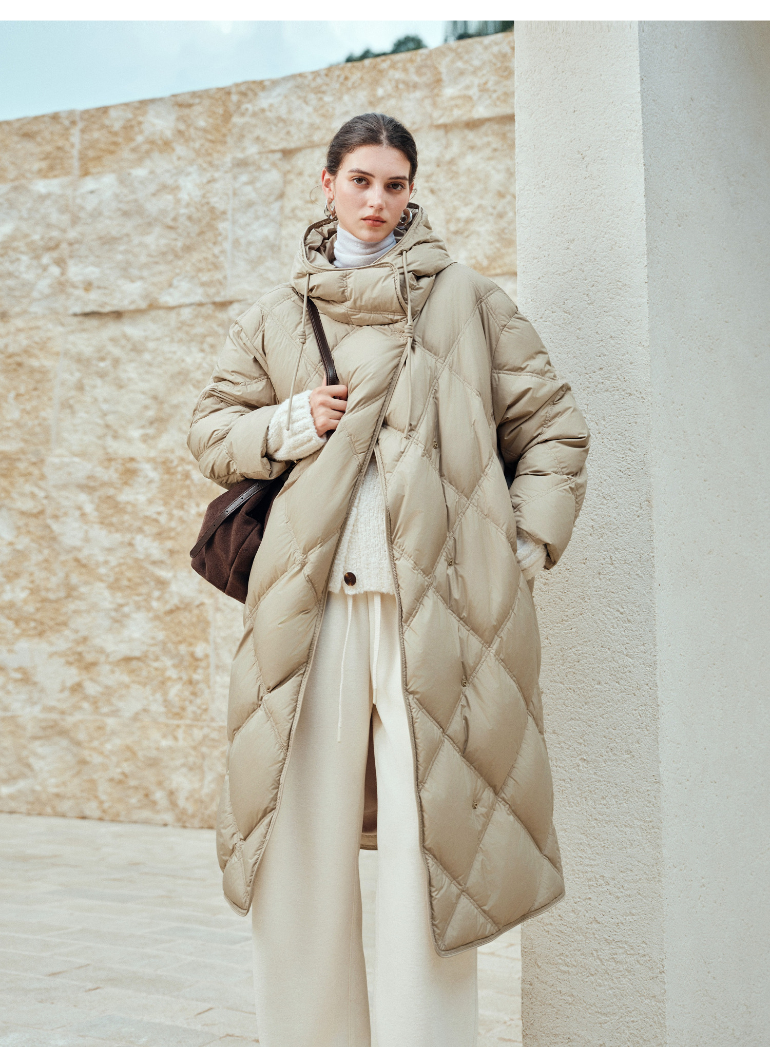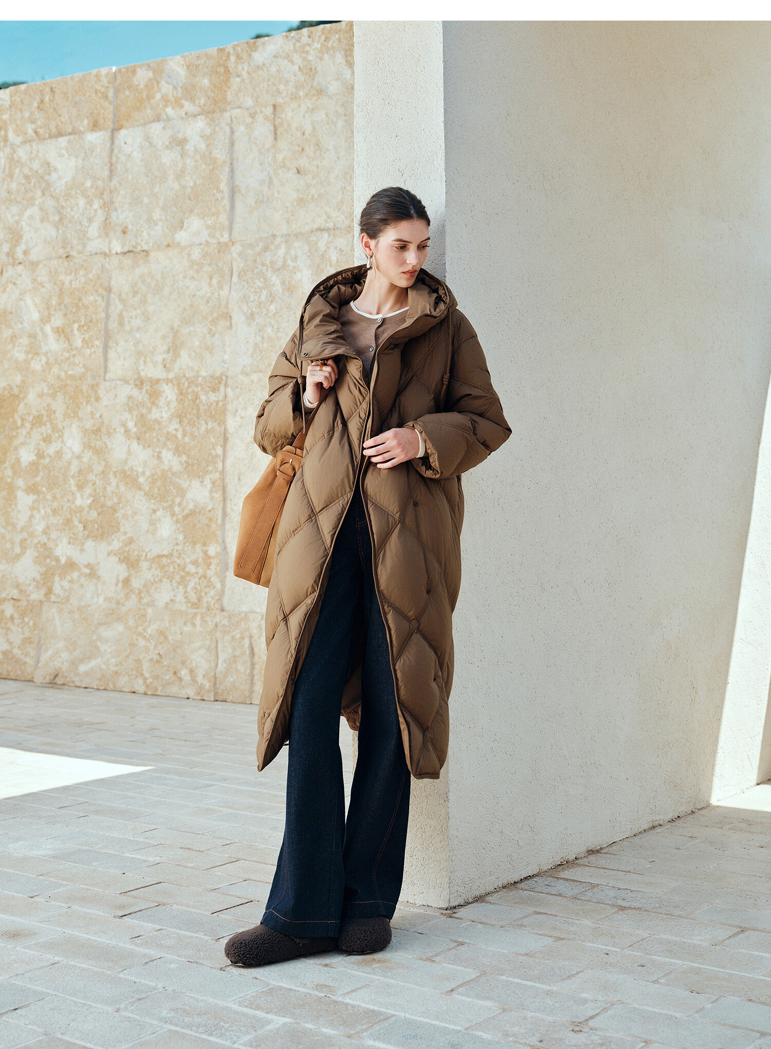 棉仓367615004-【90白鹅绒】菱形格廓型连帽羽绒服女25秋冬过膝中长款外套
