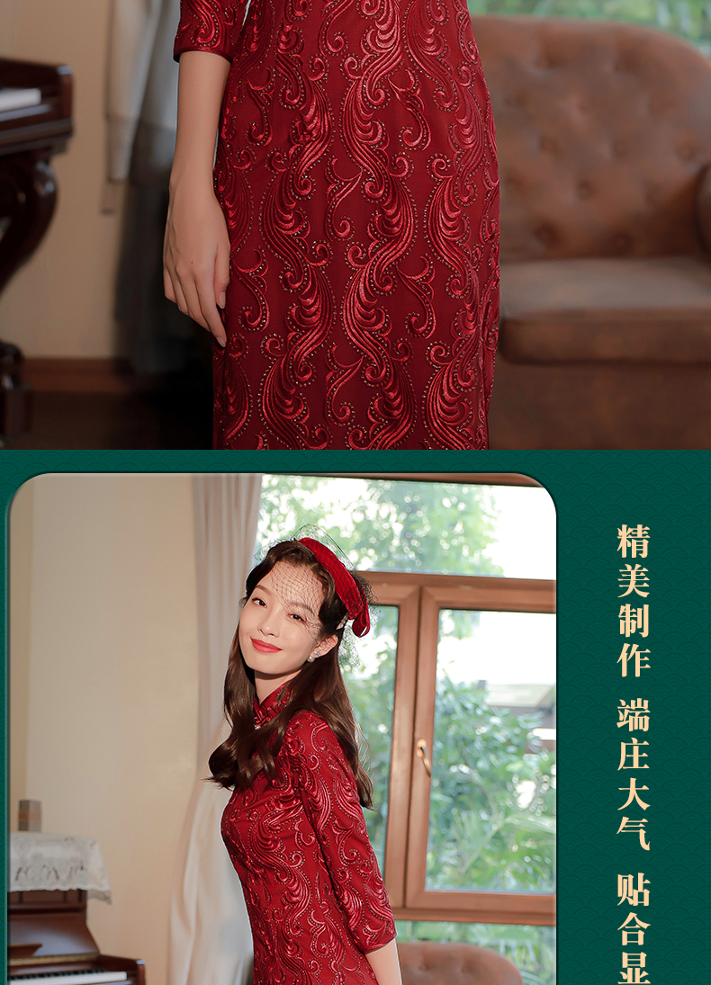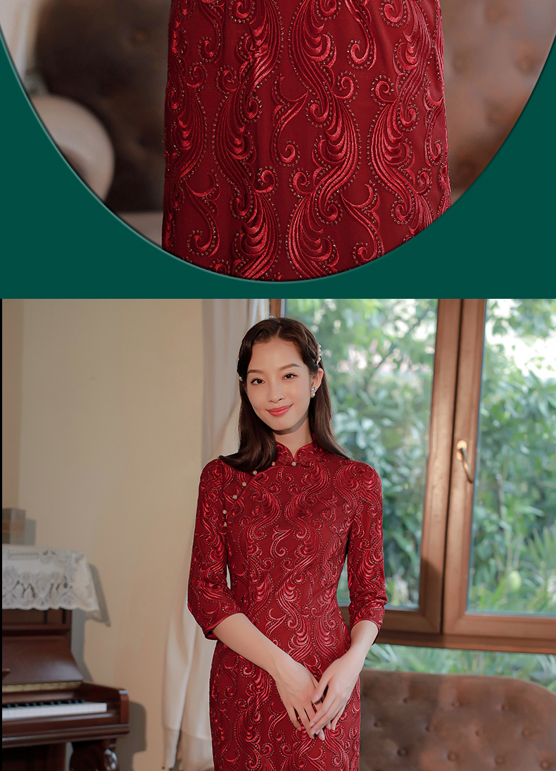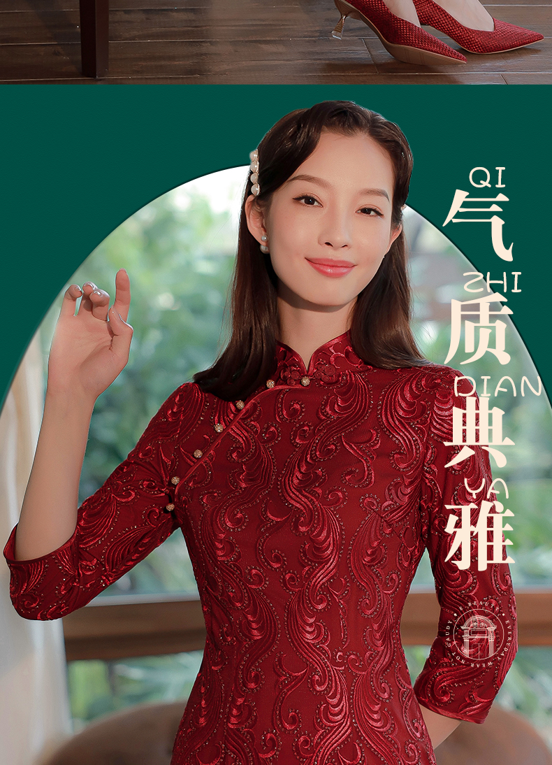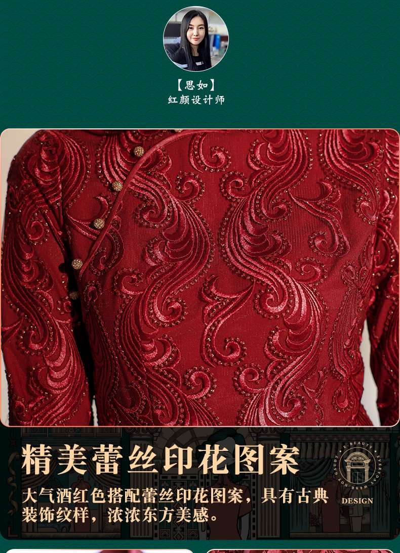 大气酒红色搭配蕾丝印花图案,古典纹样把东方美感浓缩其中,独具仪式美感。