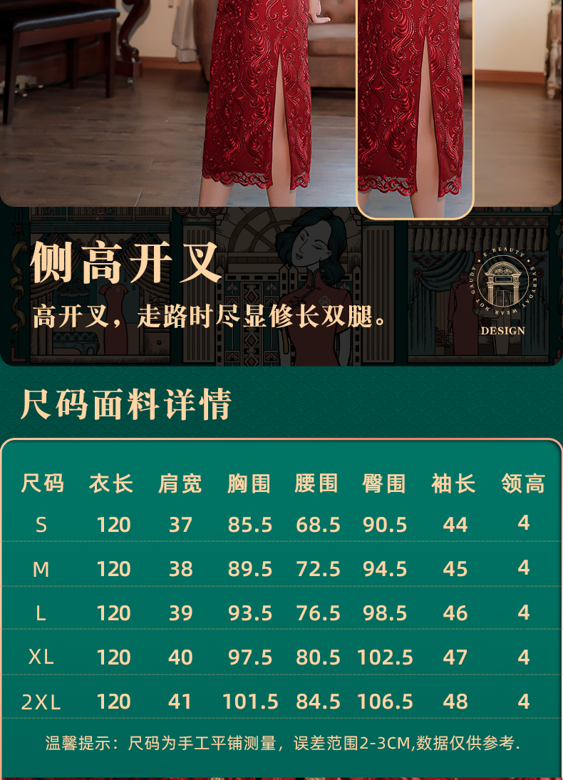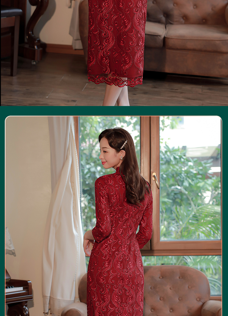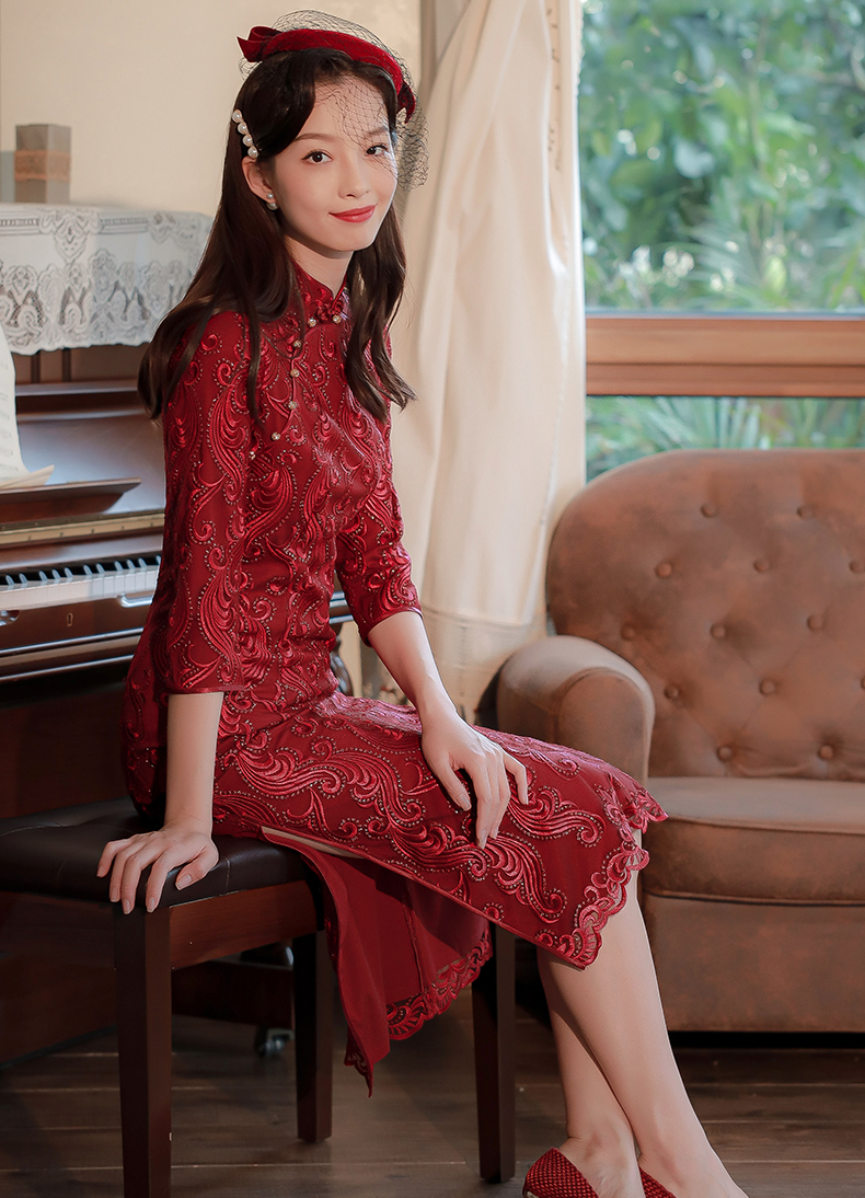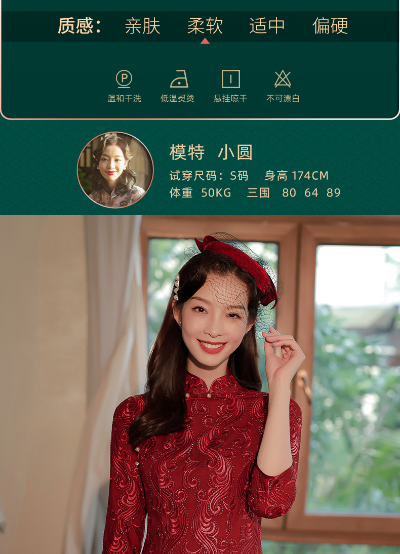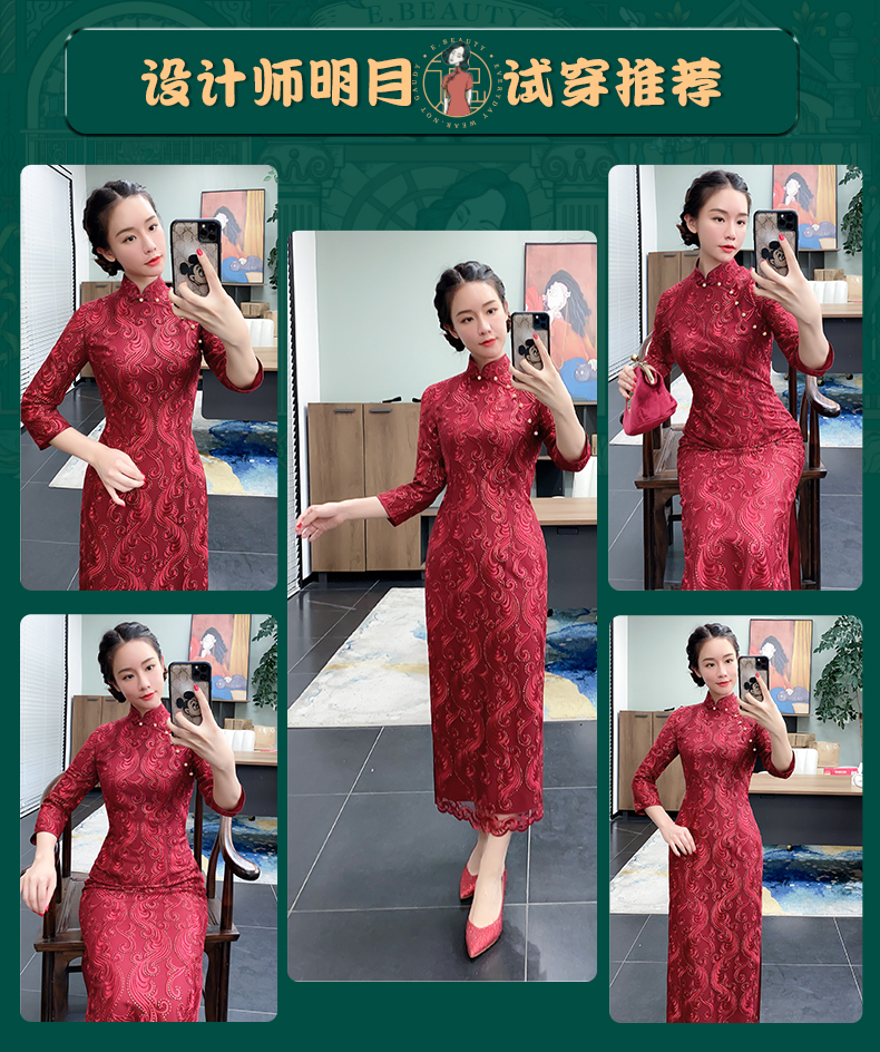 大气酒红色搭配蕾丝印花图案,古典纹样把东方美感浓缩其中,独具仪式美感。