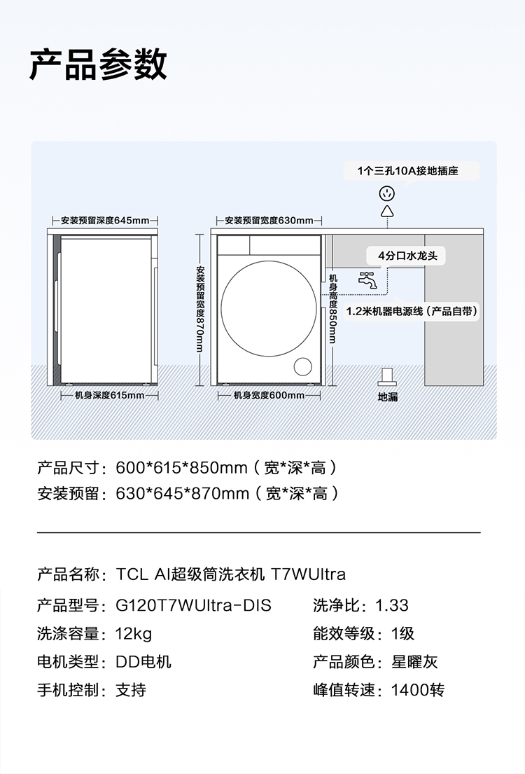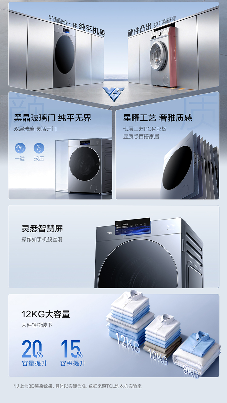 【新品上市】TCLAI超级筒滚筒洗衣机全自动家用12KG嵌入式智能直驱 G120T7W Ultra-DIS