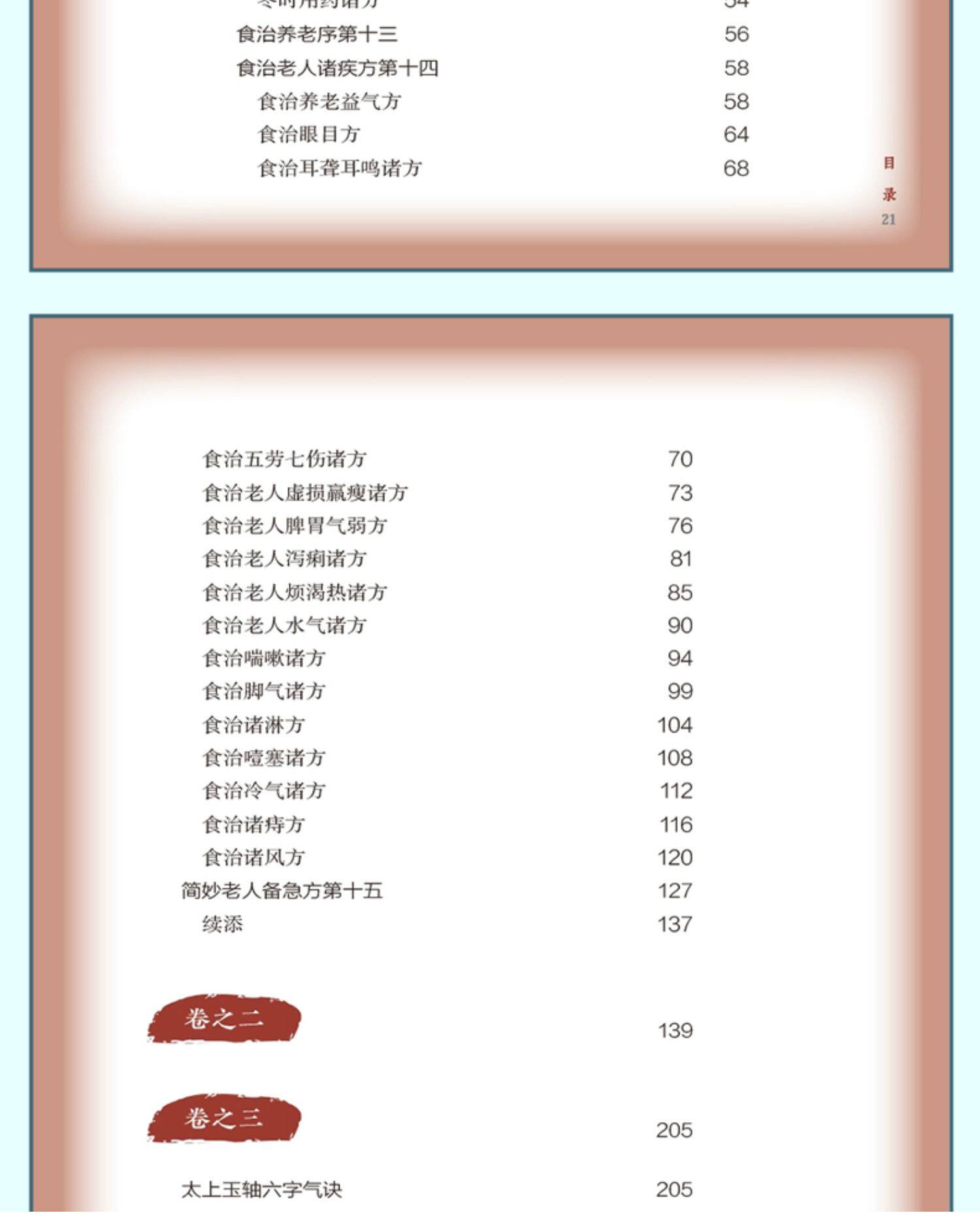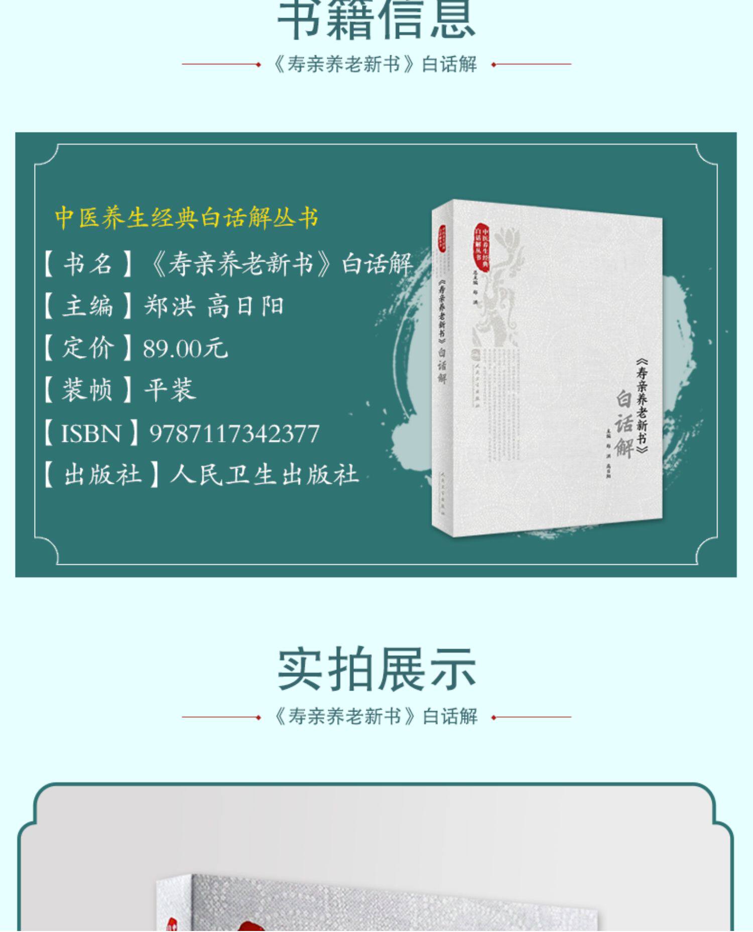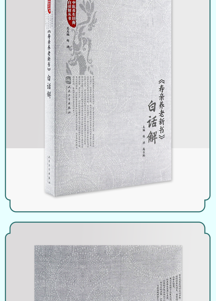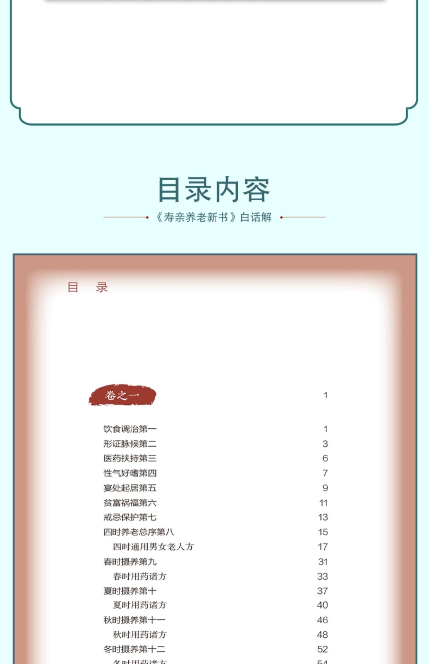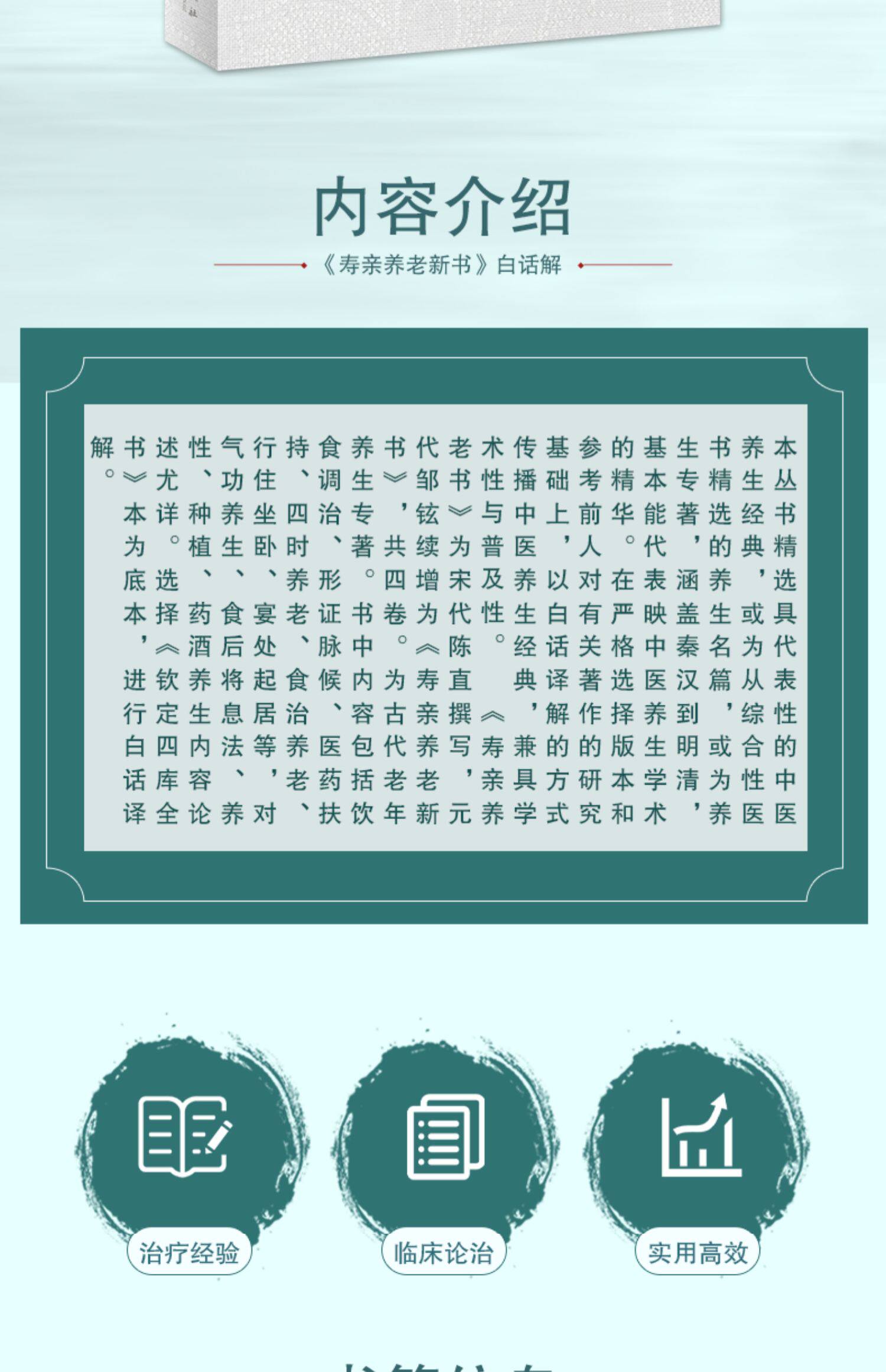本丛书精选代表性的中医养生经典,或为从综合性医书精选的养生名篇,或为养生专著,涵盖秦汉到明清,基本能代表映中医养生学术的精华。在严格选择版本和参考前人对有关著作的研究基础上,以白话译解的方式传播中医养生经典,兼具学术性与普及性。《寿亲养老书》为宋代陈直撰写,元代邹铉续增为《寿亲养老新书》,共4卷。为古代第一本老年养生专著。书中内容包括饮食调治、形证脉候、医药扶持、四时养老、食治养老、行住坐卧、宴处起居等,对气功养生、食后将息法、养性、种植、药酒养生内容论述尤详。选择《钦定四库全书》本为底本,进行白话译解。