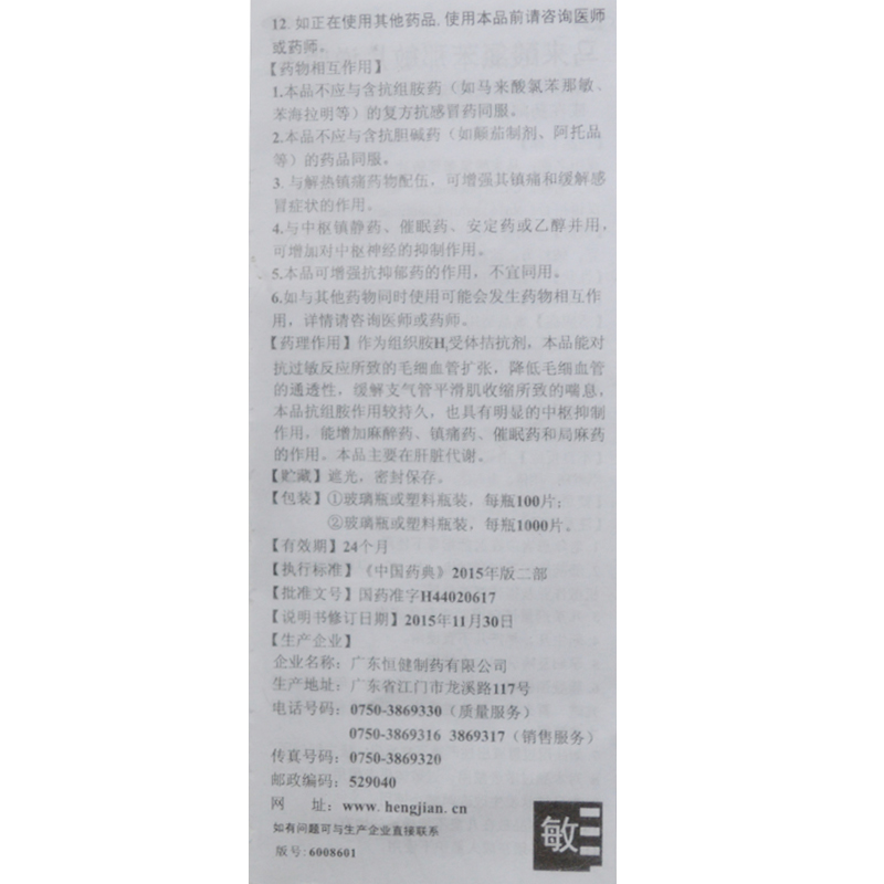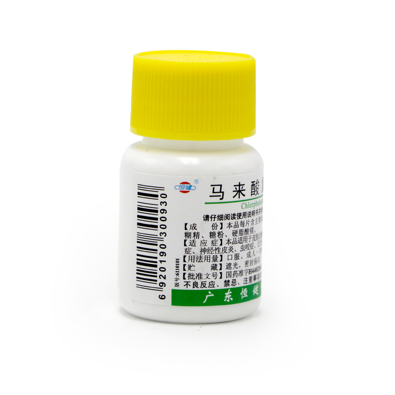 恒健 马来酸氯苯那敏片 4mg*100片/瓶湿疹皮炎皮肤瘙痒症药物过敏