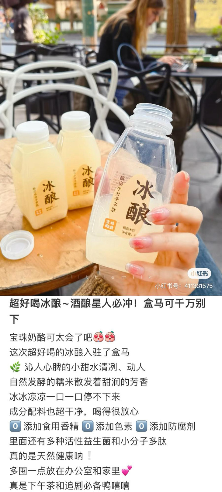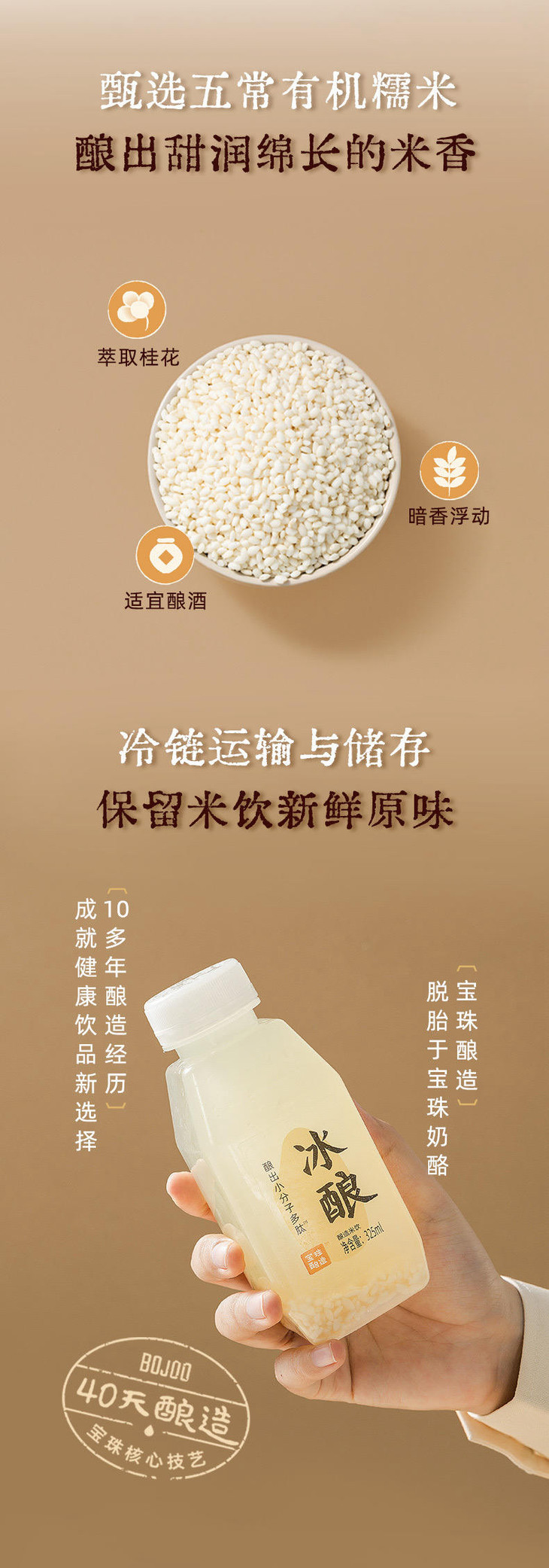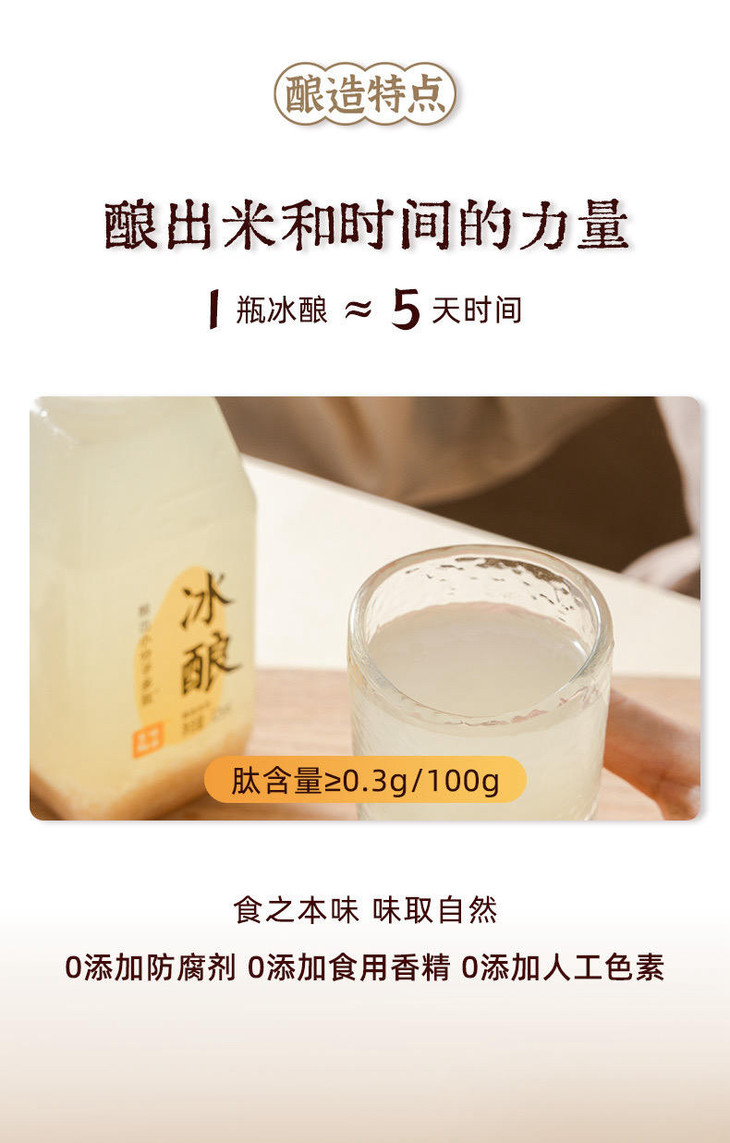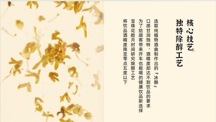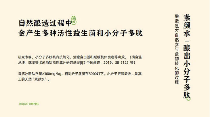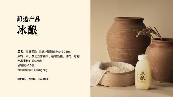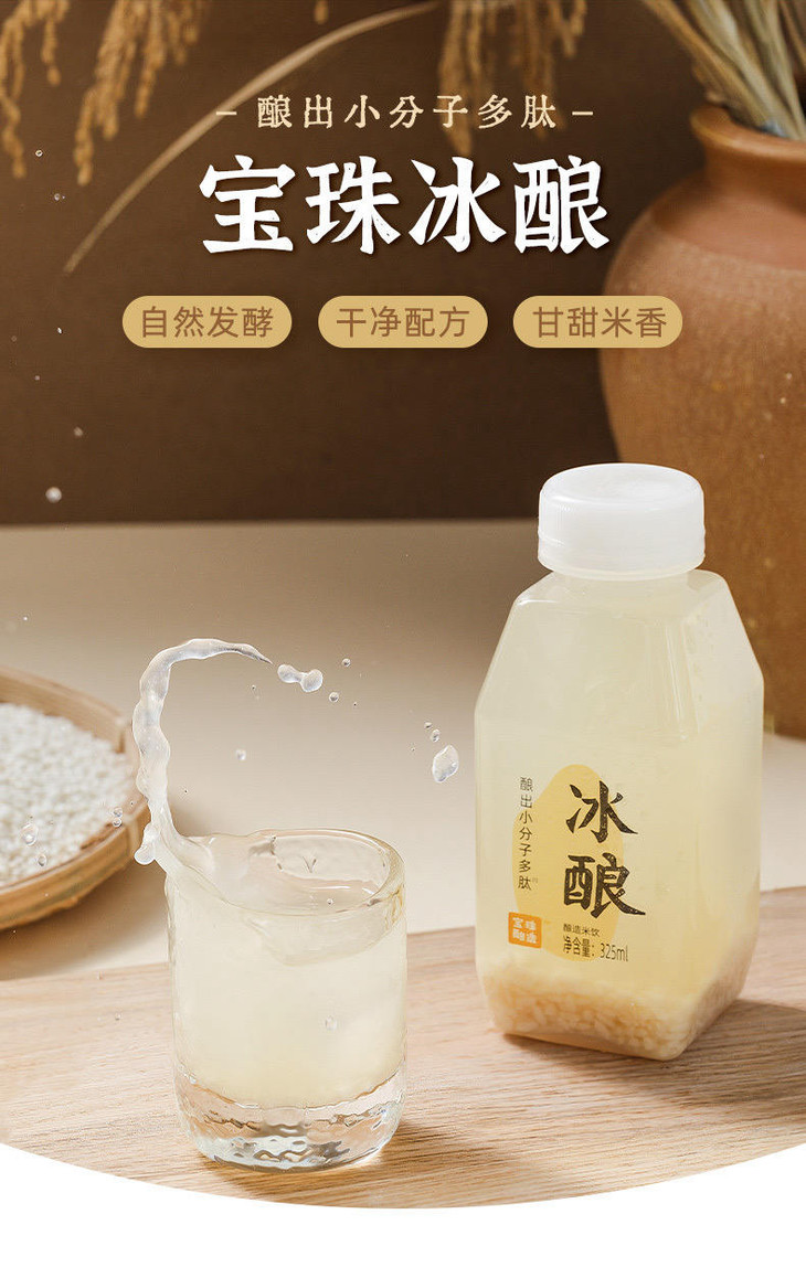 宝珠在制作冰酿时,用的是纯植物酒曲作为天然催化剂,不含任何化学添加剂,0添加食用香精、色素及防腐剂,保留了植物原有的香气与营养成分,促进粮食中的淀粉转化为糖分,并进一步发酵生成丰富的风味物质。同时,采用四重发酵核心技艺,每一步都精准控制,使得每一口都充满层次感与回味。在自然酿造过程中,冰酿还会产生多种活性益生菌和小分子多肽,好处多多,而冰酿的肽含量大约为2300mg/kg,相对分子质量在5000以下,小分子也更易吸收,是真正的天然“素颜水”!
