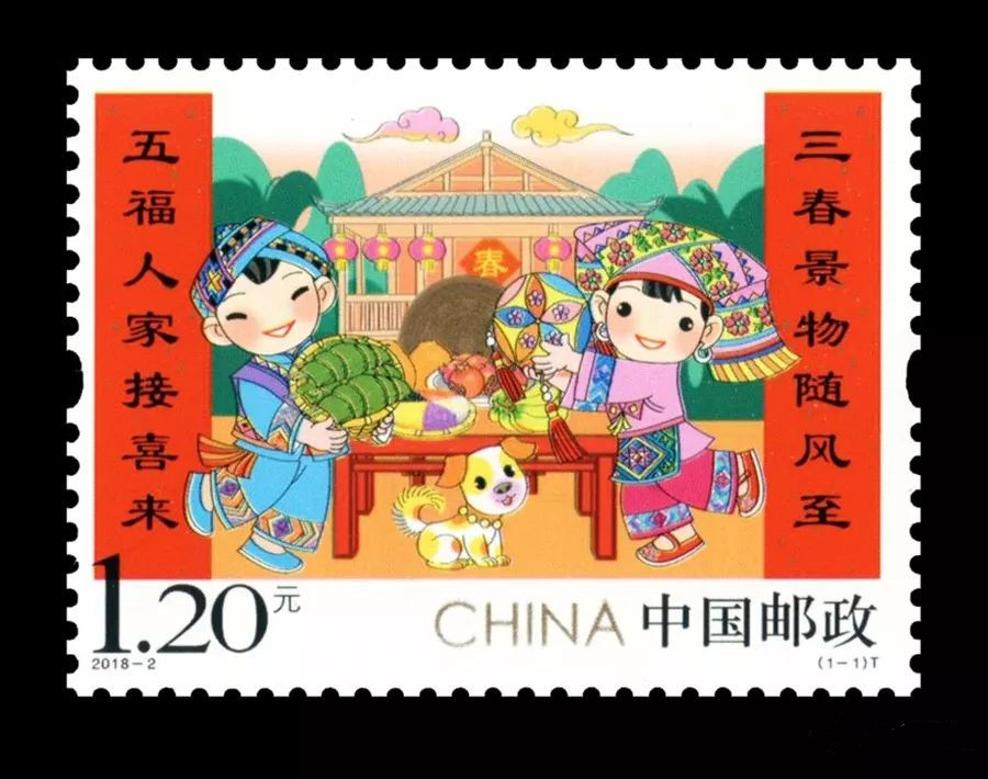邮票画面中的粽子象征着富裕丰收,绣球则是壮家人的吉祥物,小黄狗与狗年相对应,红红火火的春联更增添了过年的气氛。