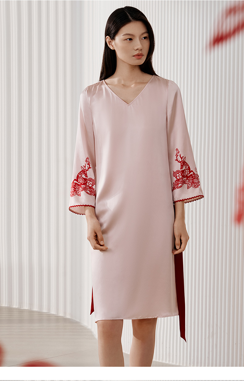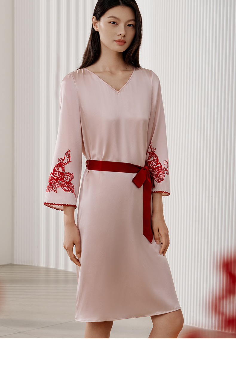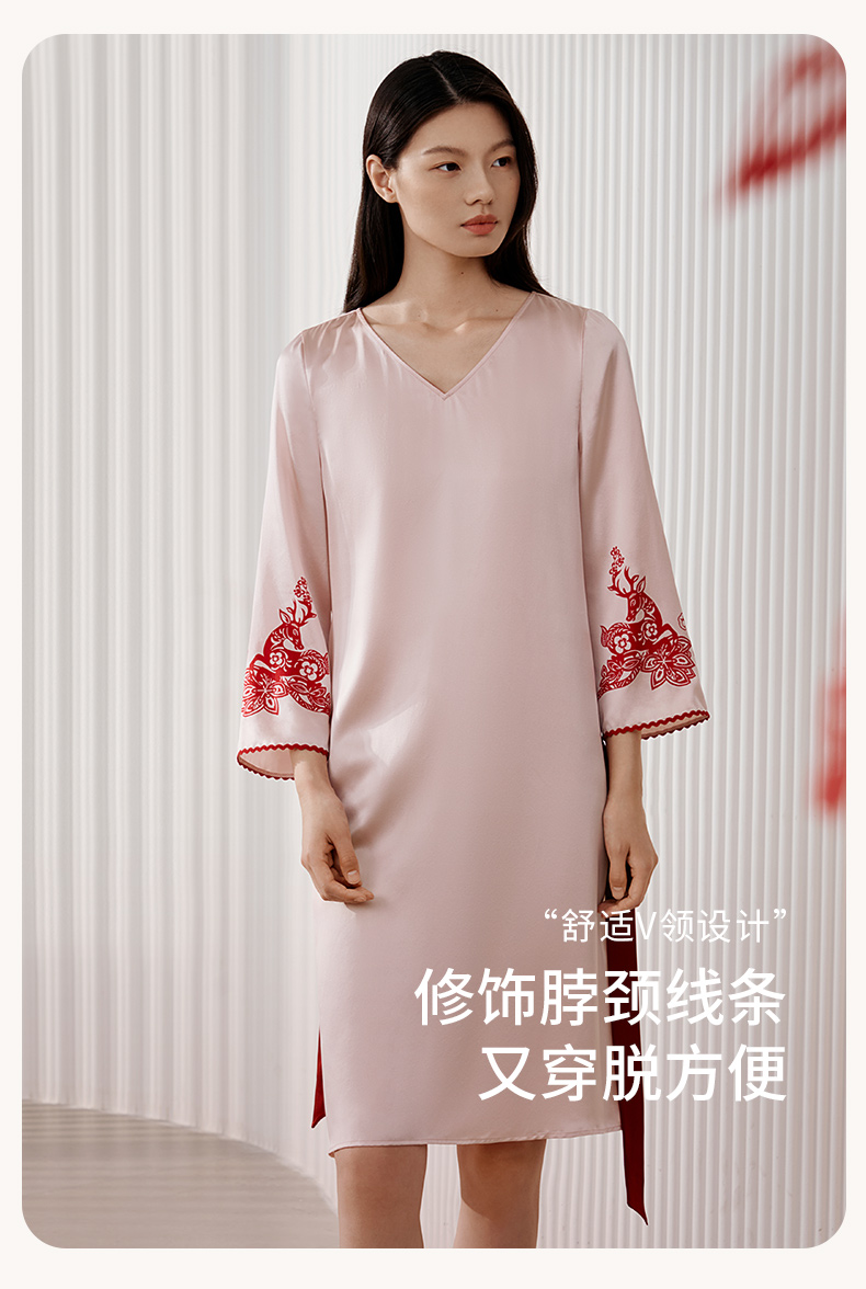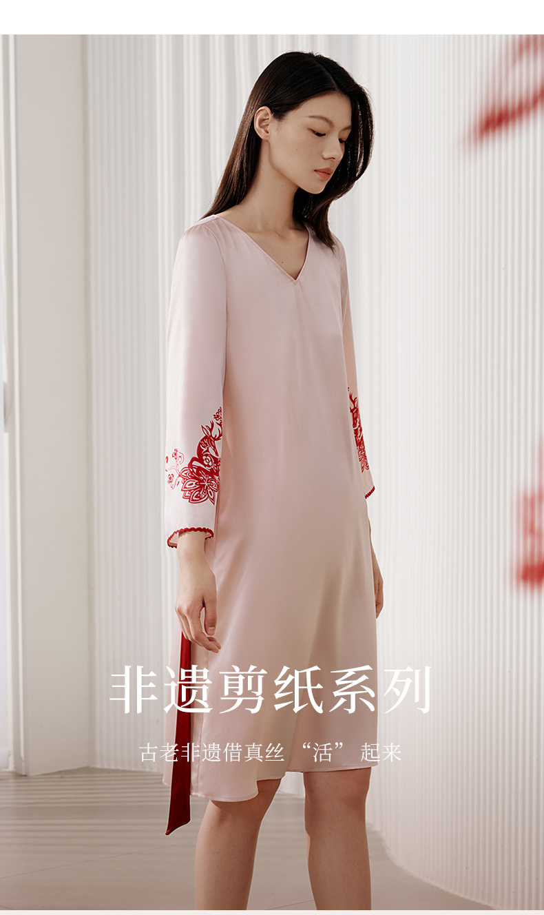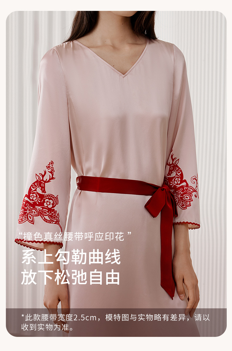 金三塔重磅真丝睡裙女100%桑蚕丝宽松舒适V领长袖家居服印花睡衣 YSFFC303