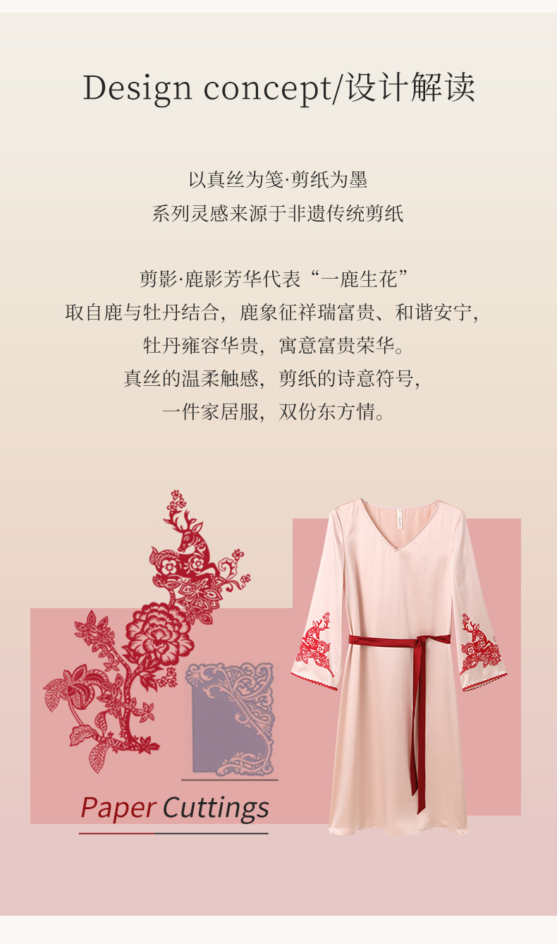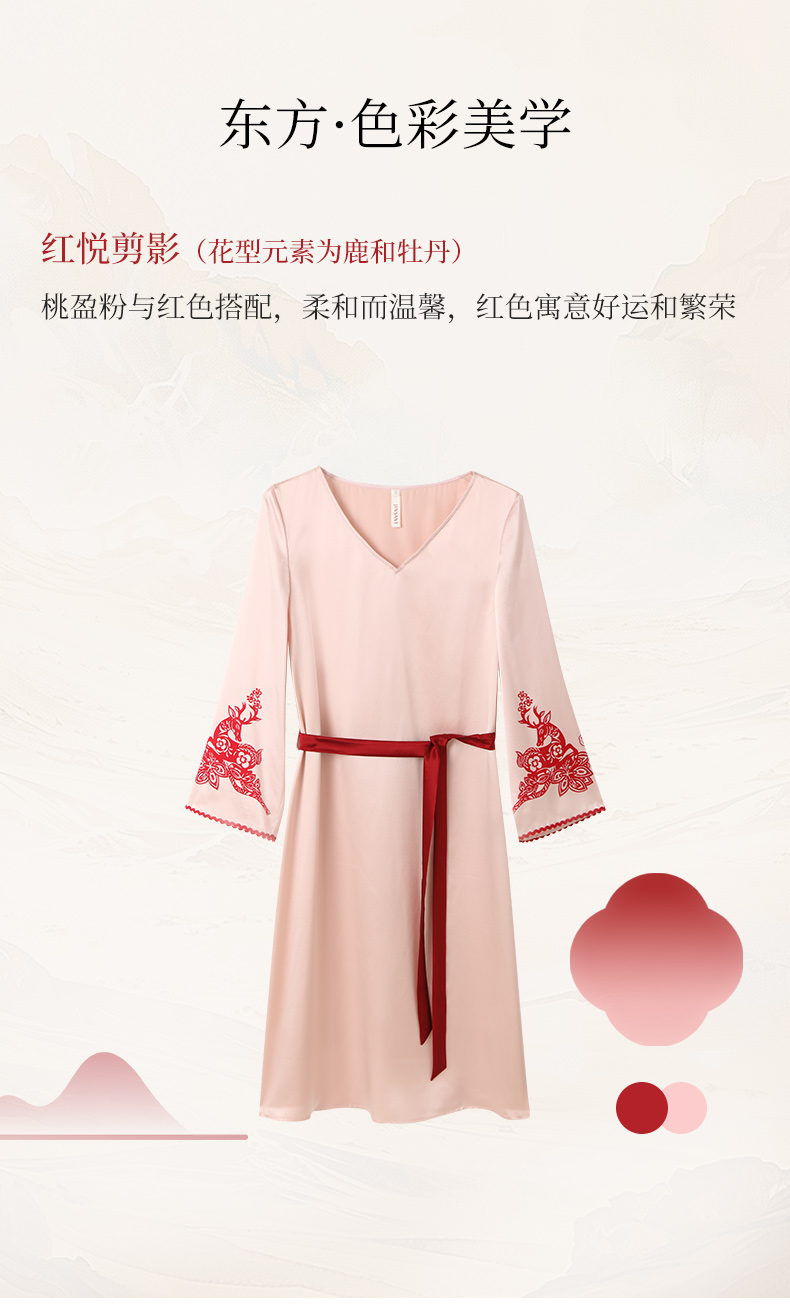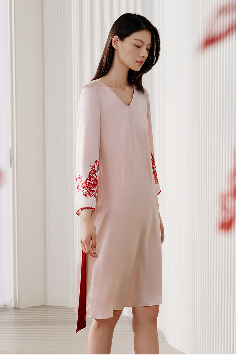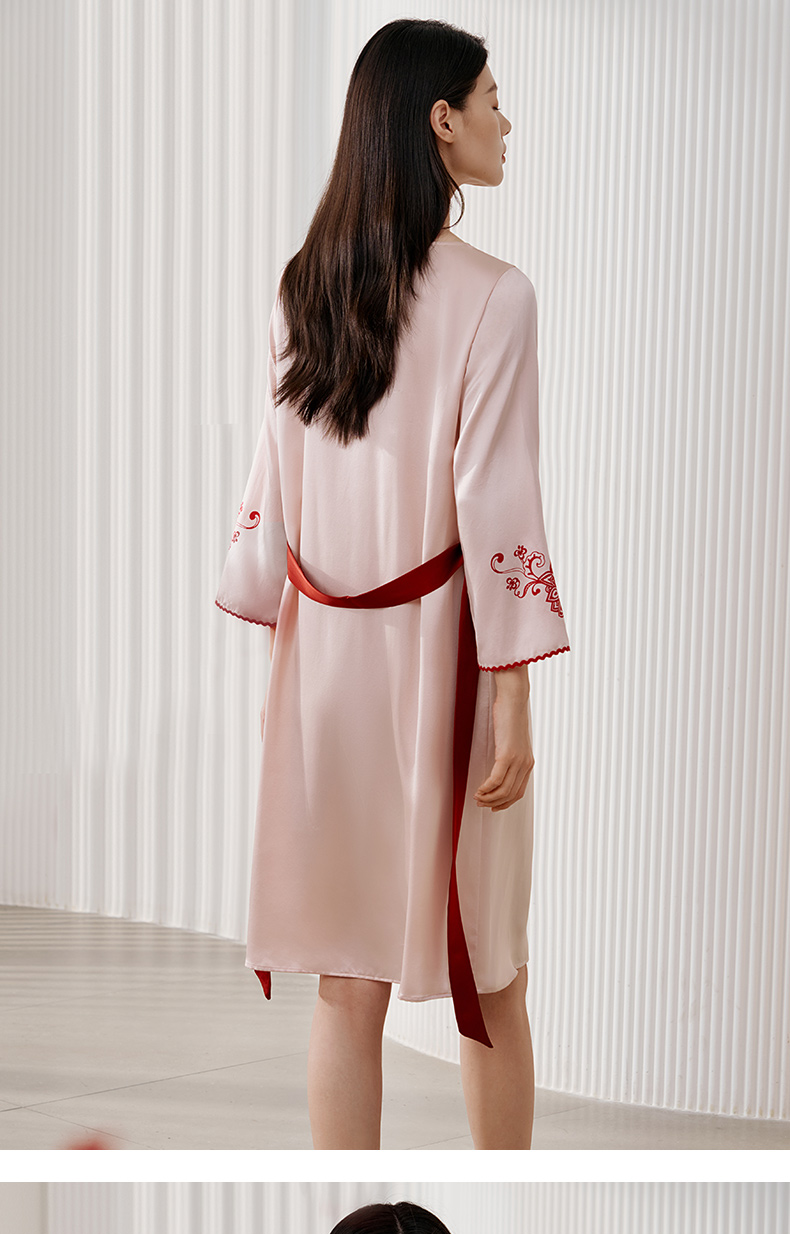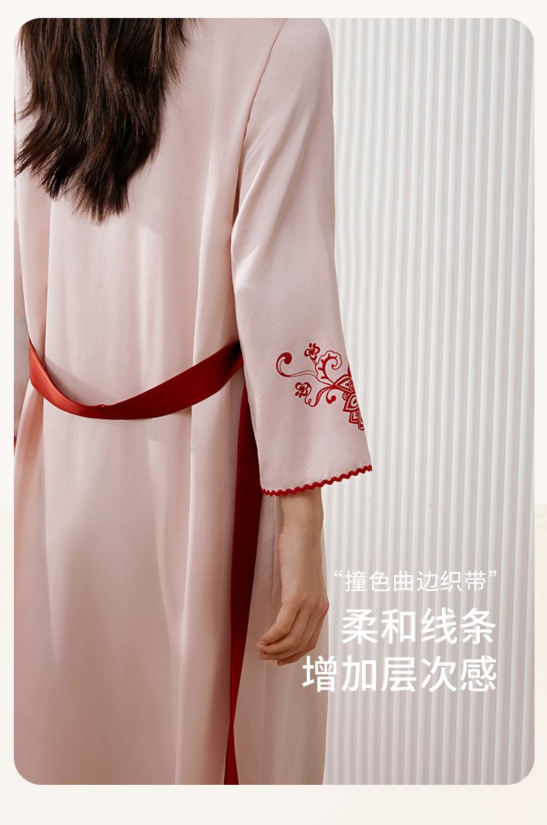 金三塔重磅真丝睡裙女100%桑蚕丝宽松舒适V领长袖家居服印花睡衣 YSFFC303
