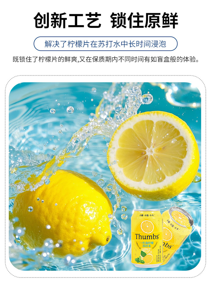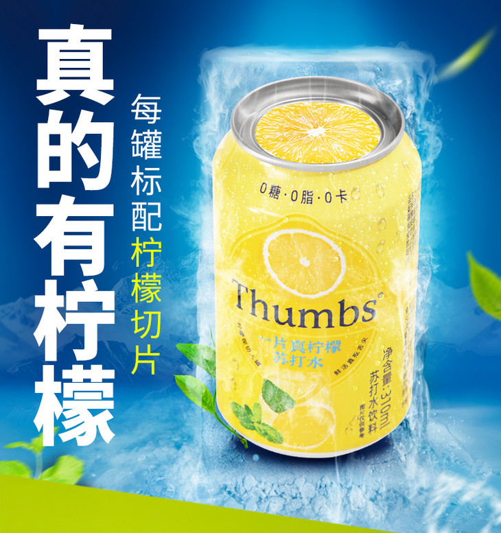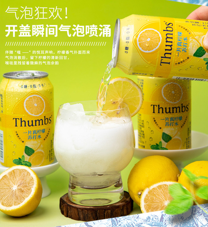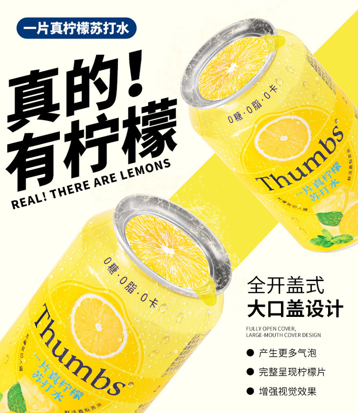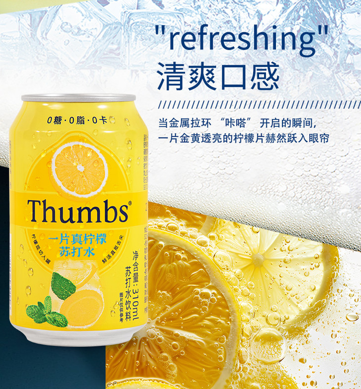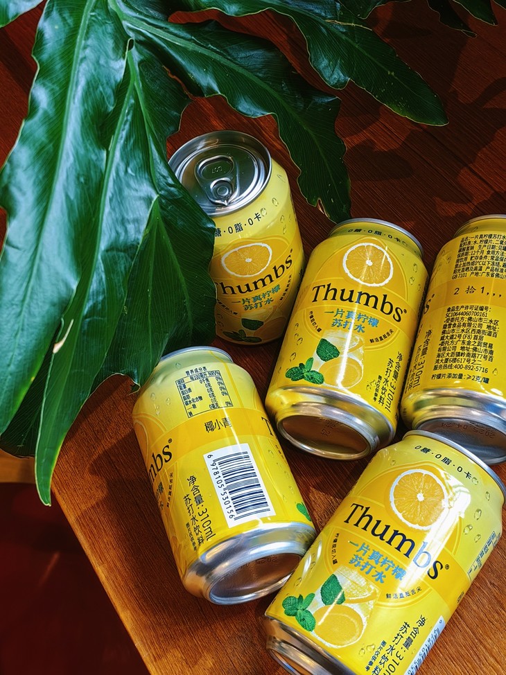 thumbs真柠檬苏打水,把新鲜柠檬经创新锁鲜工艺定格在最佳状态,金黄的色泽在澄澈的苏打水中轻轻浮动,像藏在饮品里的夏日彩蛋!全开盖设计,也方将柠檬与苏打水一并倒出,不用现切,就能得到一杯完美的柠檬苏打水啦。更让人安心的是它骨子里的轻盈,0糖、0脂、0卡的纯粹配方,随时随地都能放心畅饮!