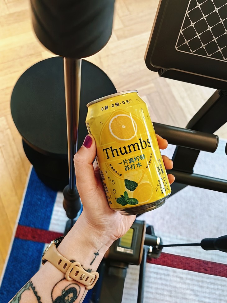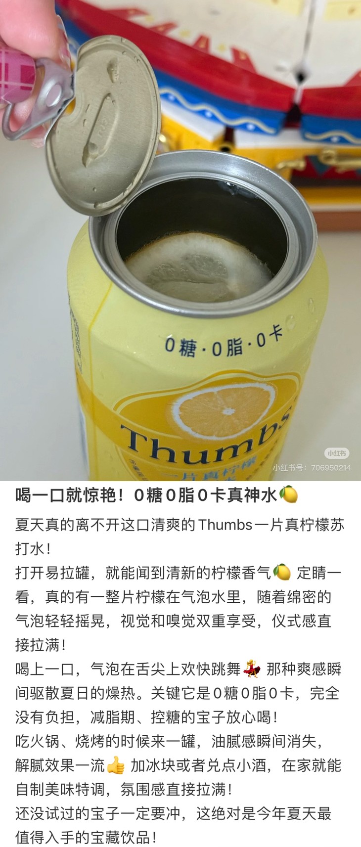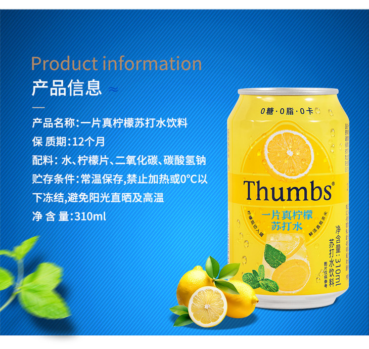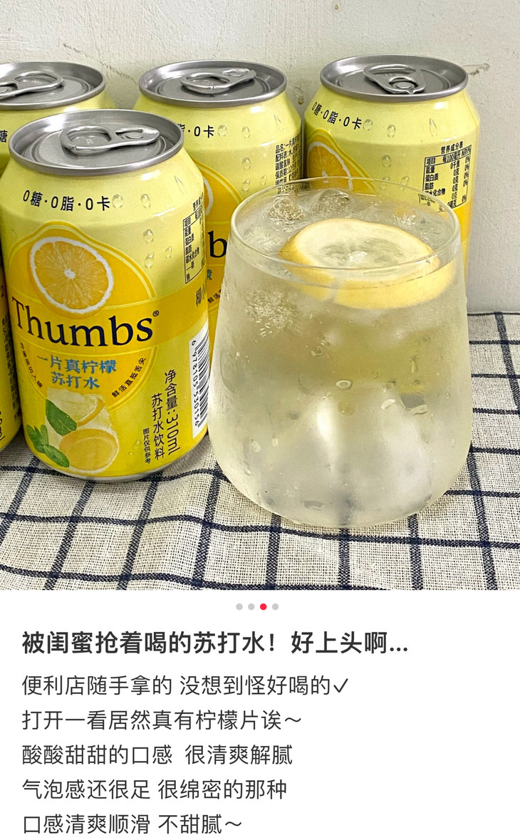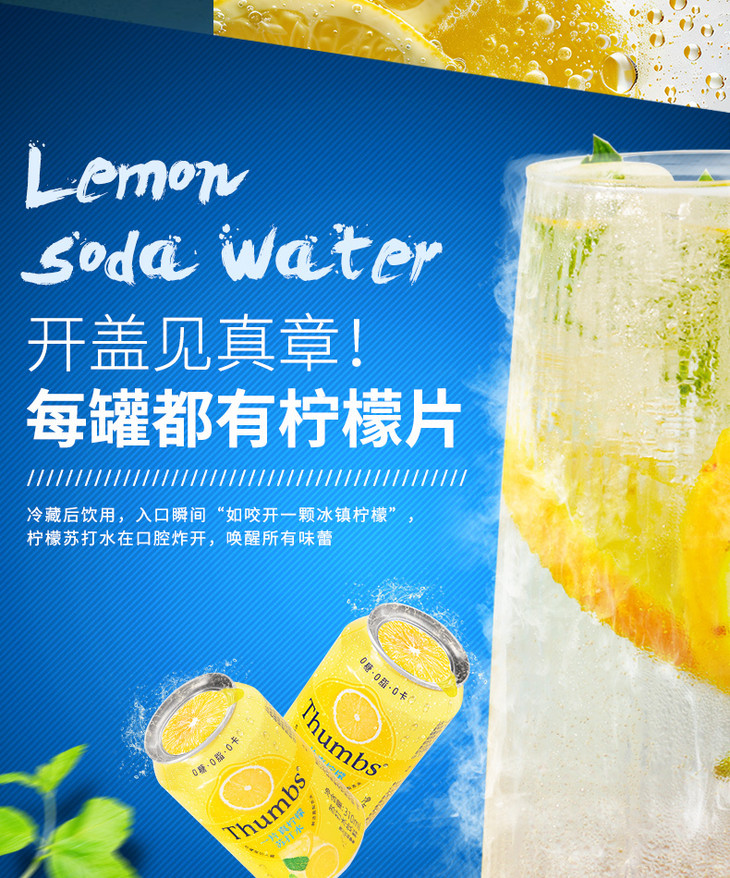 thumbs真柠檬苏打水,把新鲜柠檬经创新锁鲜工艺定格在最佳状态,金黄的色泽在澄澈的苏打水中轻轻浮动,像藏在饮品里的夏日彩蛋!全开盖设计,也方将柠檬与苏打水一并倒出,不用现切,就能得到一杯完美的柠檬苏打水啦。更让人安心的是它骨子里的轻盈,0糖、0脂、0卡的纯粹配方,随时随地都能放心畅饮!