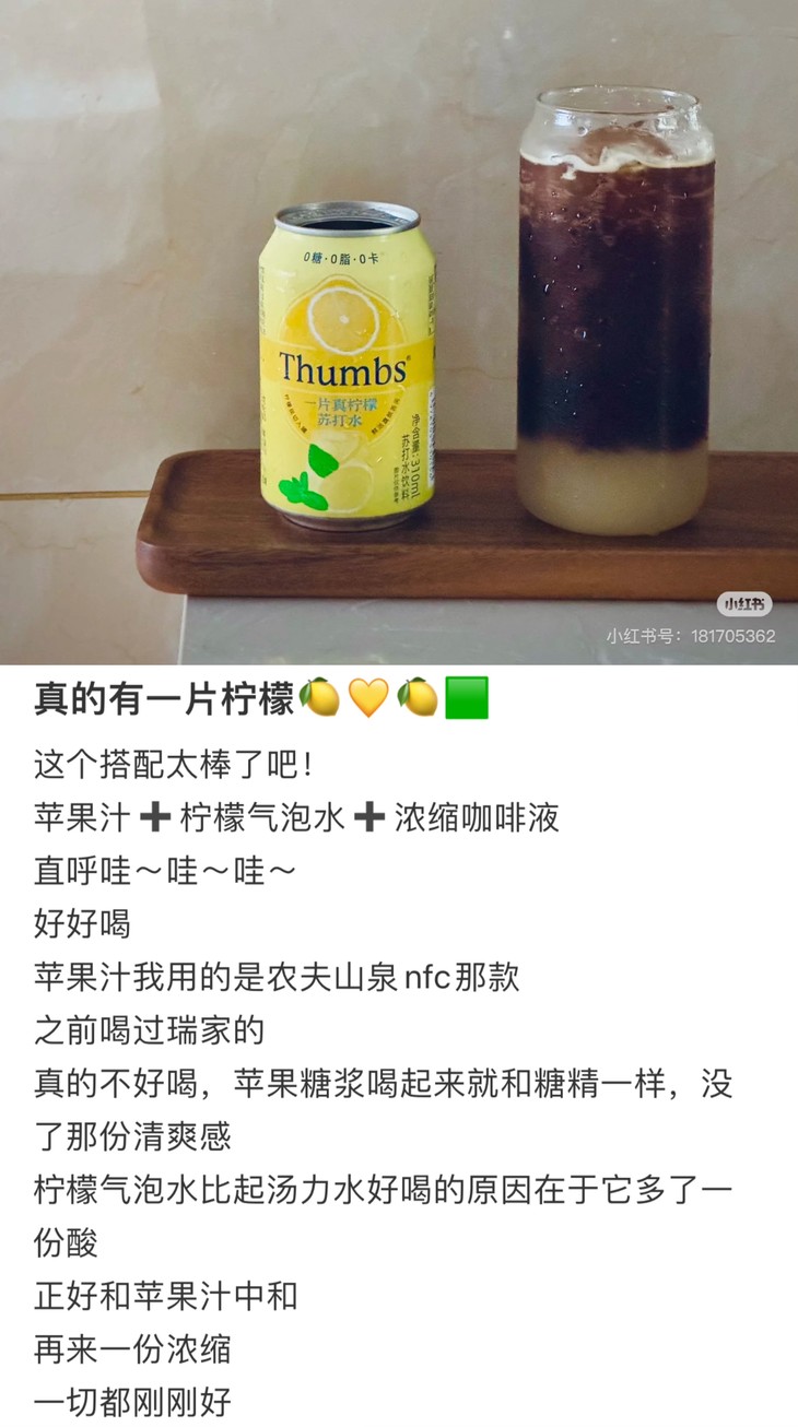 thumbs的一片真柠檬苏打水,真的有一片柠檬!我其实收到好久了,以为只是苏打水加了柠檬汁,也没抱太大期待,没想到竟然有柠檬本人。。。夏日放冰箱,燥热粘腻时来上一罐,冰冰凉凉,超清爽!就是打开时要小心,真的气很多哦!