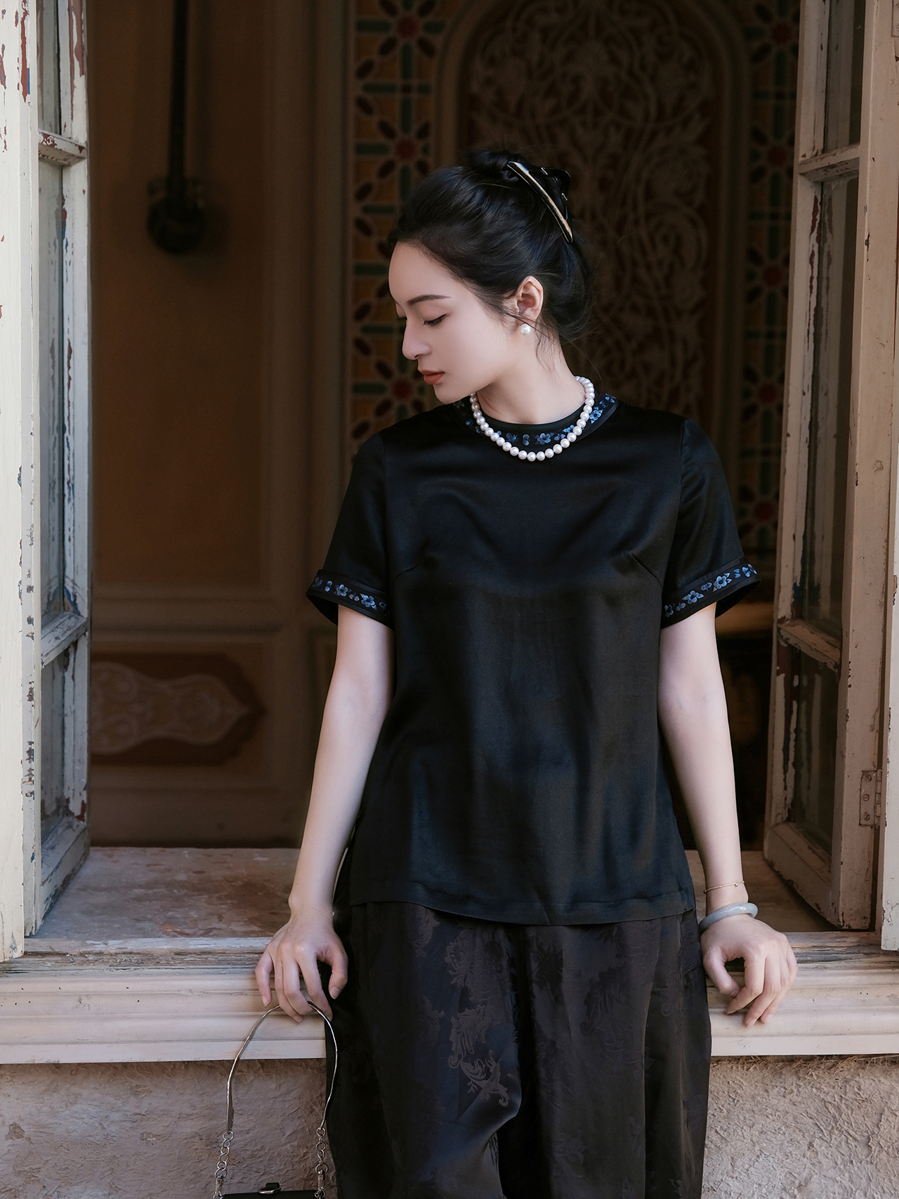 盛唐牡丹盛奢系列| 限量款| 高货-三蓝手绣圆领上衣(特殊商品不退不换)
