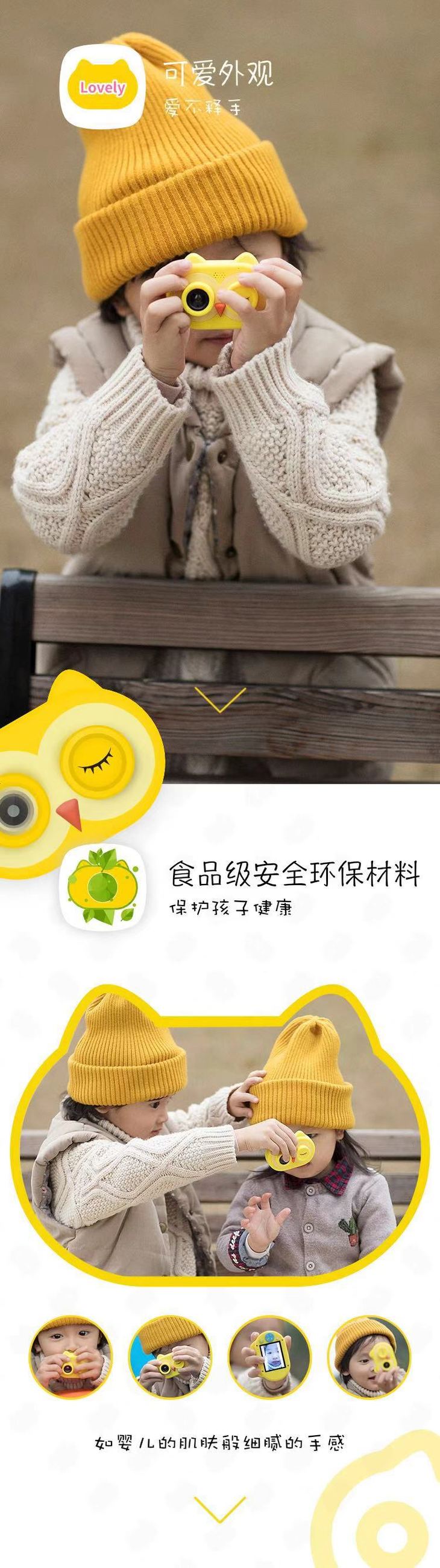 相机所选用外壳材质为食品级环保硅胶。防滑亲肤,即便娃喜欢啃咬玩具,也不用担心安全问题!