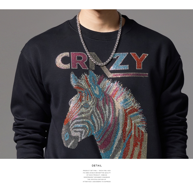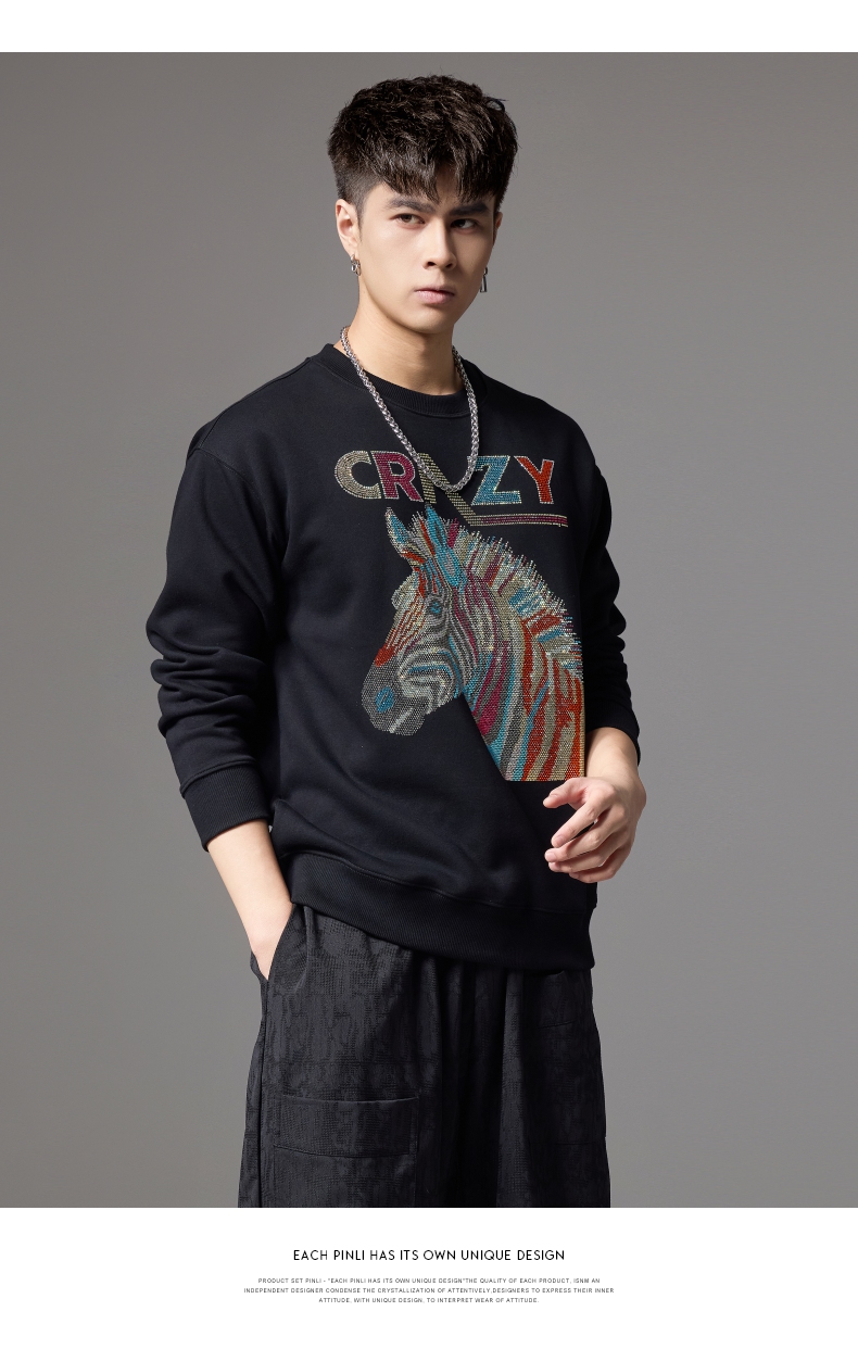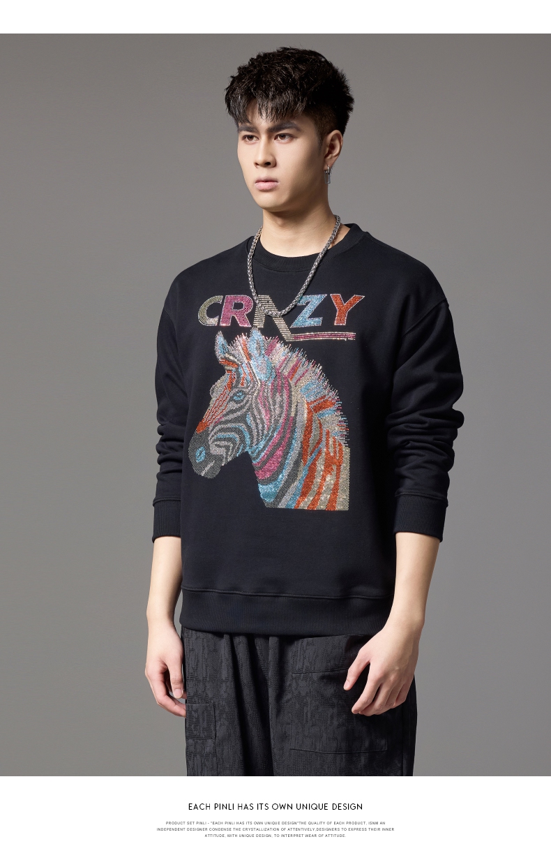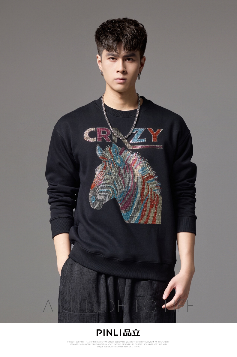 PINLI品立秋季新款男士宽松圆领落肩斑马字母烫钻套头卫衣潮BG243109033
