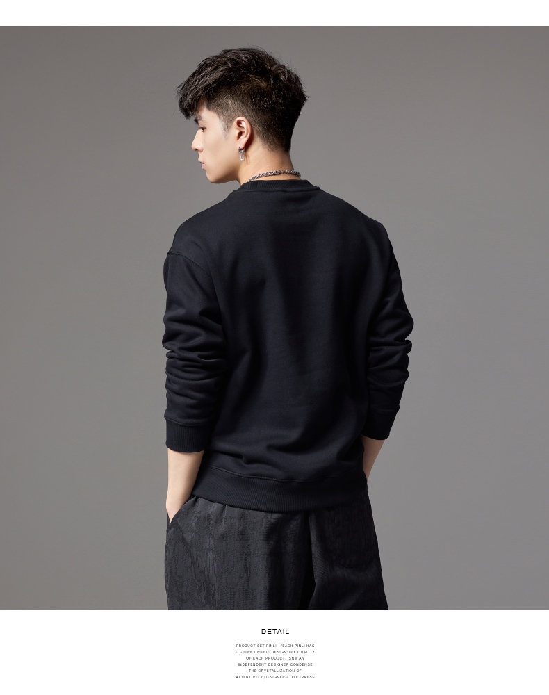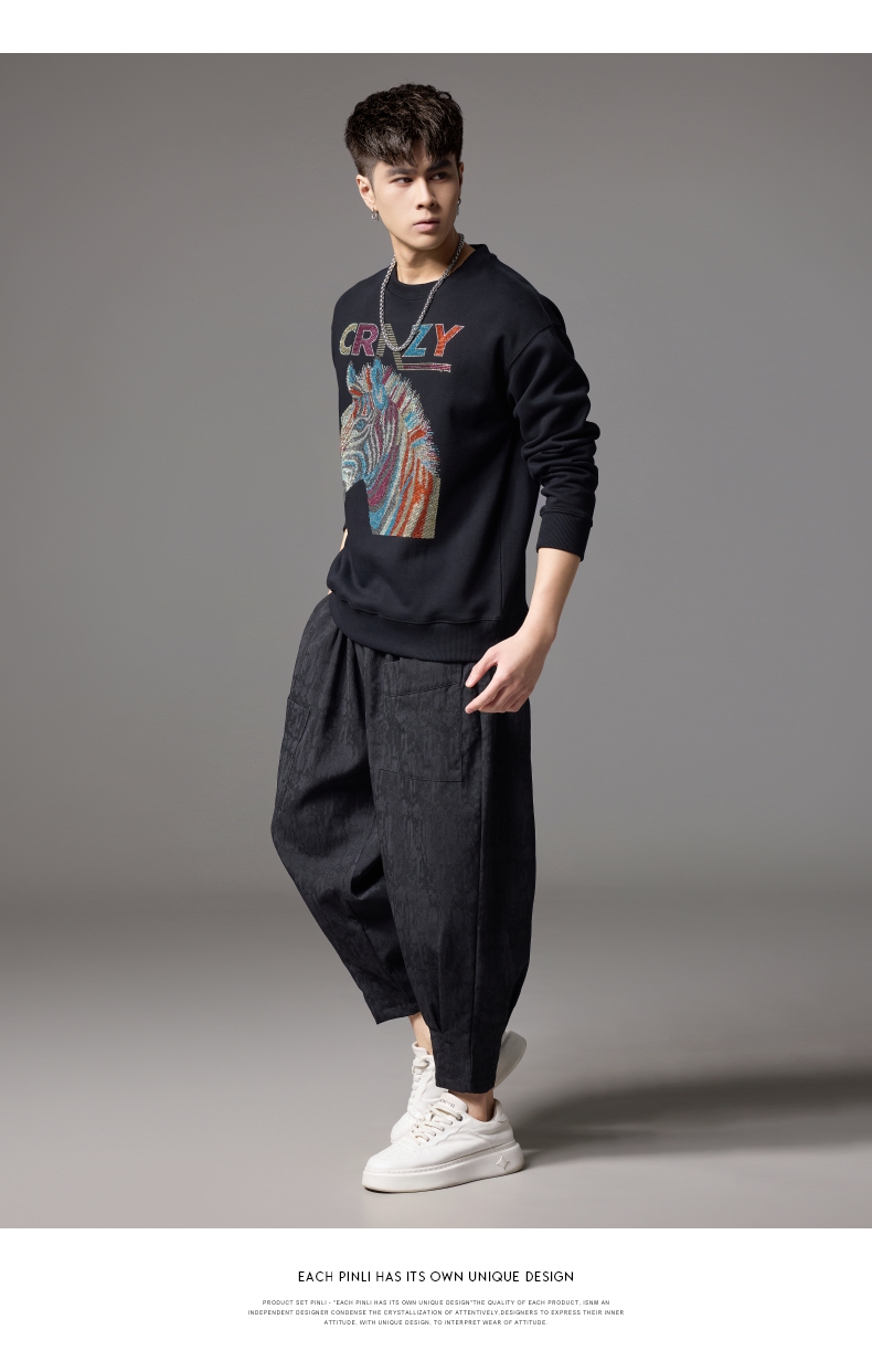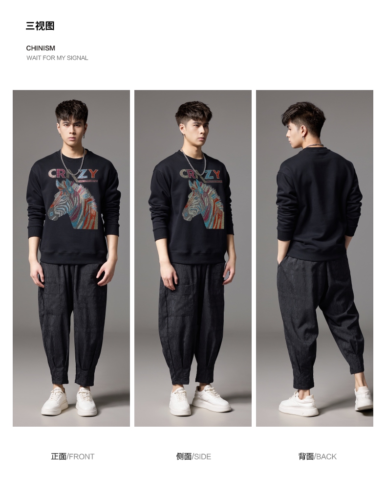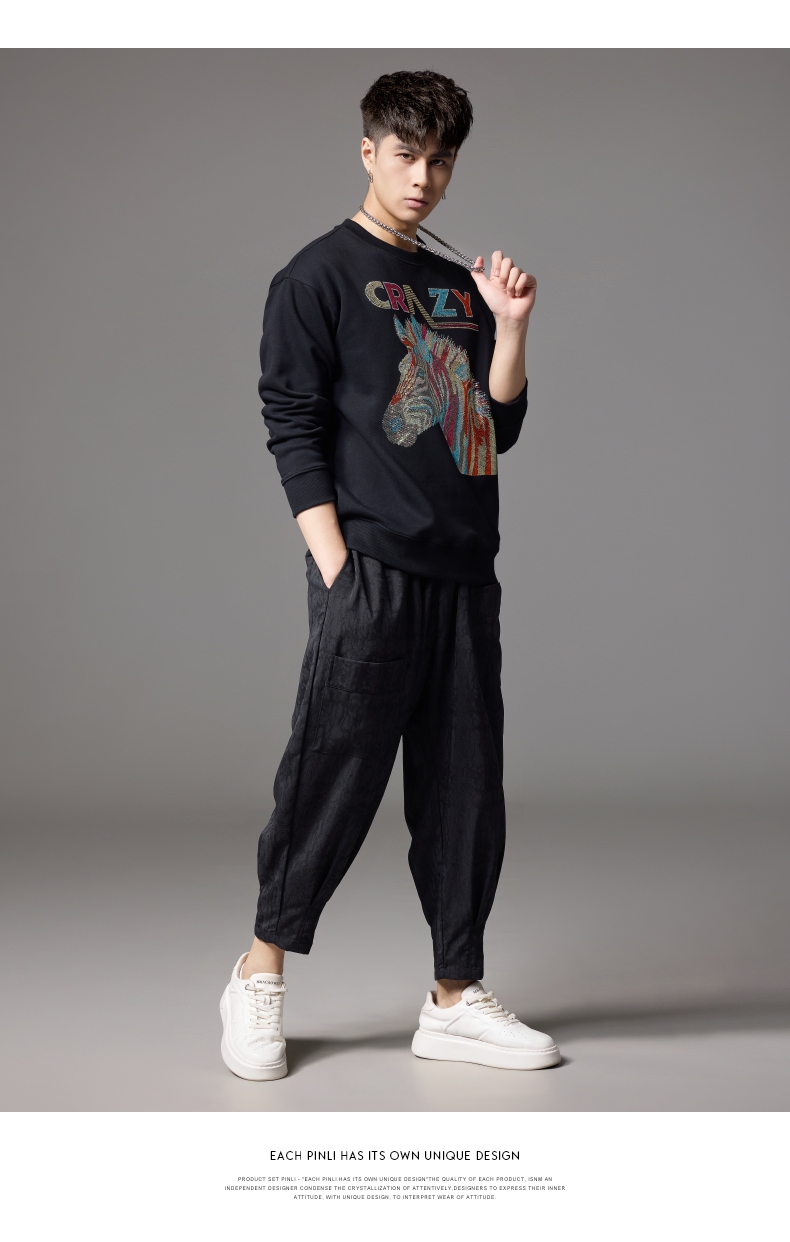 PINLI品立秋季新款男士宽松圆领落肩斑马字母烫钻套头卫衣潮BG243109033