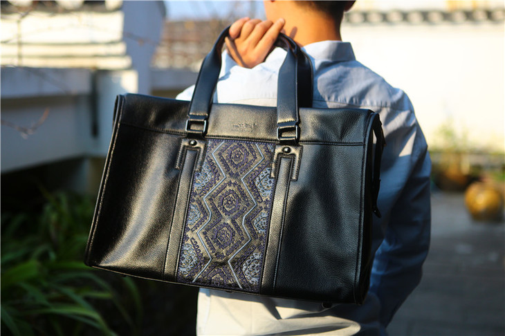 黑色的底上深浅蓝色刺绣纹样交织沉稳大方