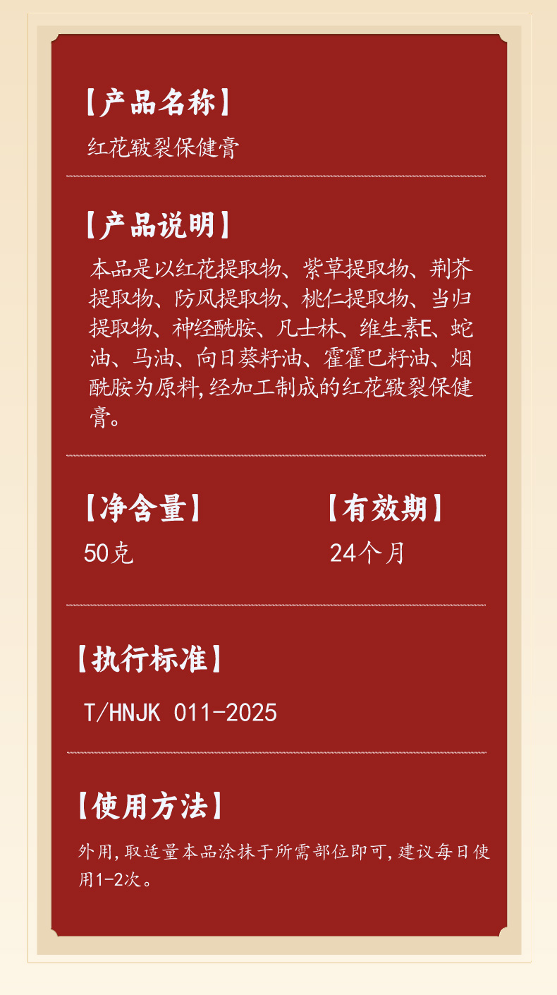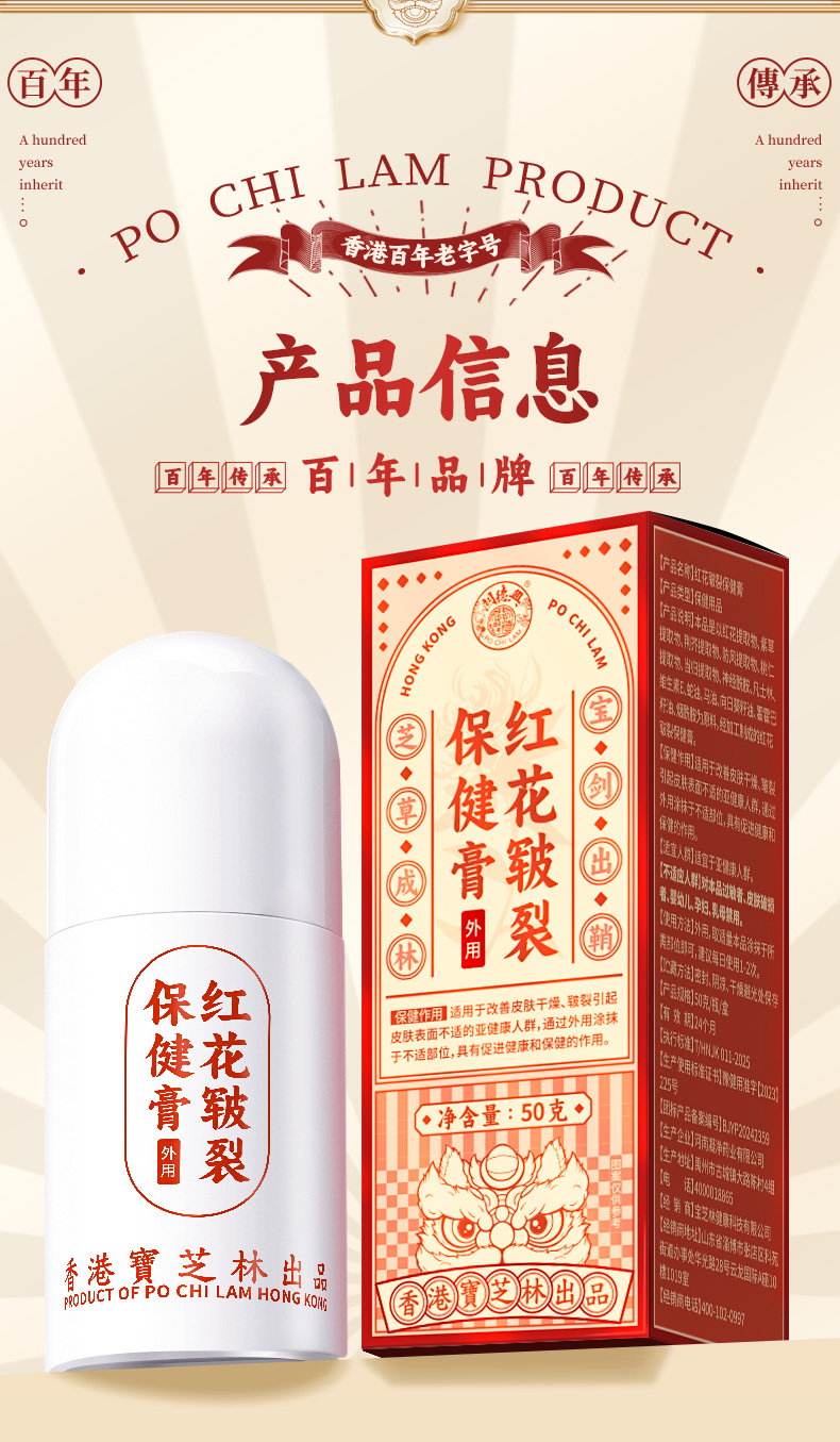 【品名】香港宝芝林红花皲裂膏 【规格】50g/瓶 【保质期】24个月 【使用方法】外用,取适量本品涂抹于所需部位即可,建议每日使用1-2次 【贮藏方法】密封、阴凉、干燥避光处保存 【产地】 【发货地】山东 【发货快递】申通、中通 【不发货区域】港澳台地区不发 【补邮费区域】甘肃、青海、宁夏、海南、内蒙古+3元;新疆、西藏+20元 【发货时效】48小时,节假日顺延 【产品说明】本品是以红花提取物、紫草提取物、荆芥提取物、防风提取物、桃仁提取物、当归提取物、神经酰胺、凡士林、维生素E、蛇油、马油、向日葵籽油、霍霍巴籽油、烟酰胺为原料,经加工制成的红花皲裂保健膏。 【不适应人群】对本品过敏者、皮肤破损者、婴幼儿、孕妇乳母禁用。 |